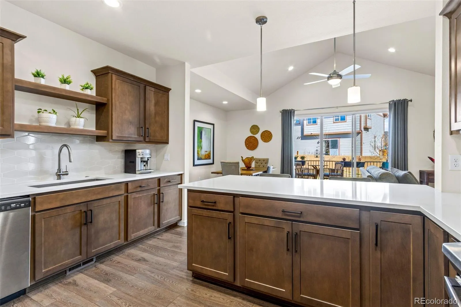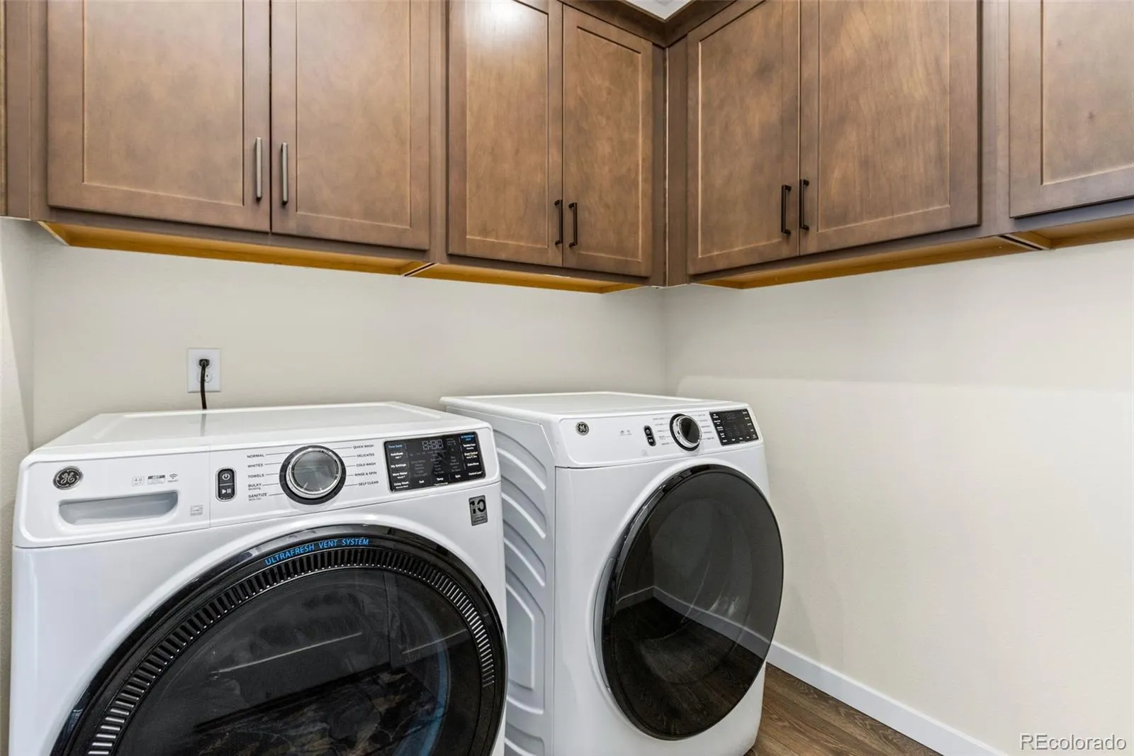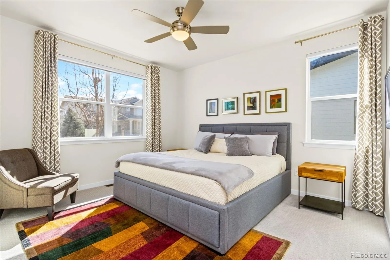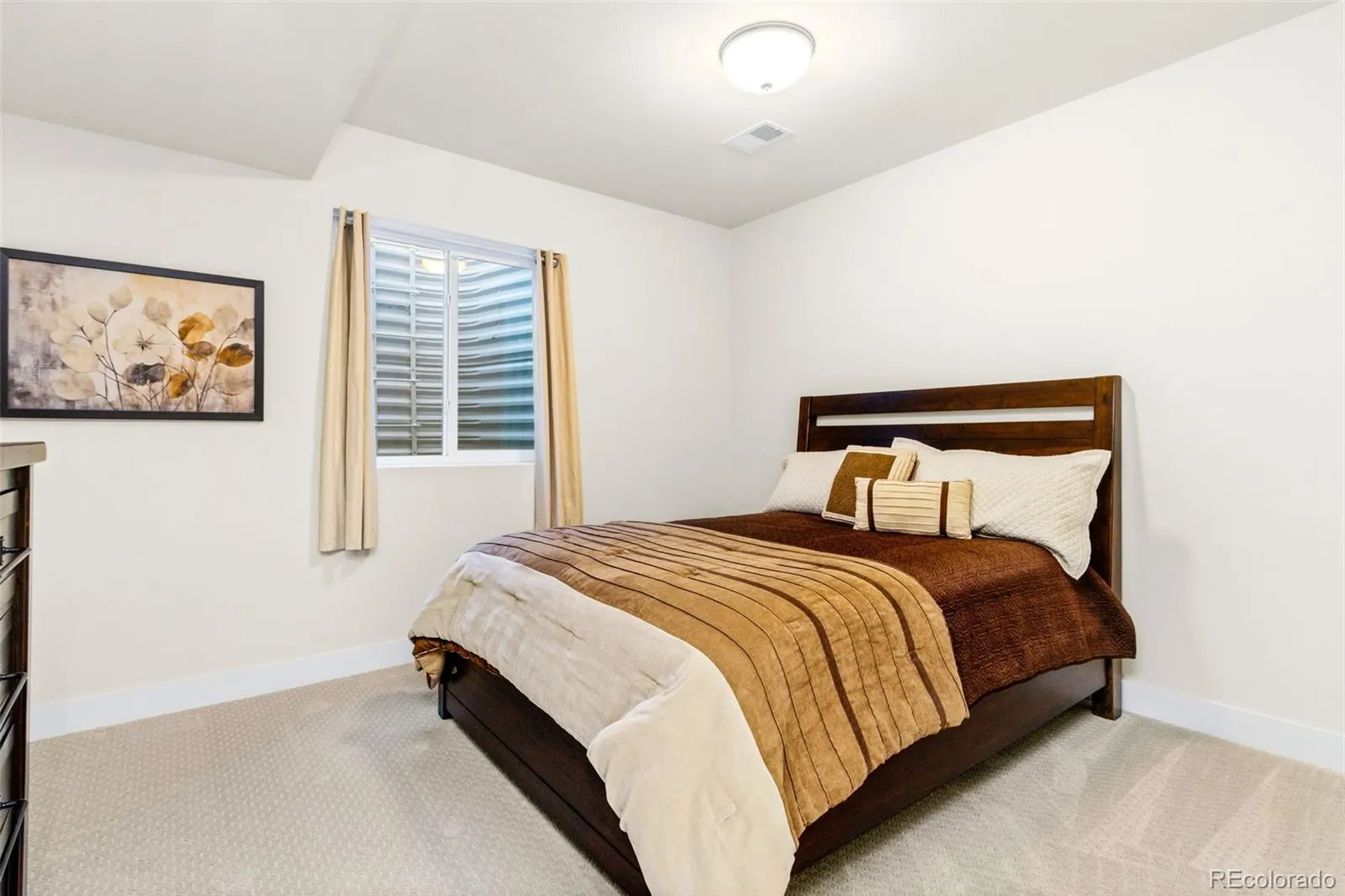 Former model home now for sale – has only been lived in for one year so it’s nearly new! Over $50K upgrades when built, plus the owner added more features after their purchase including a California closet in the primary suite, Hunter Douglas silhouette blinds (with remote in great room), custom drapes and a smart thermostat. Home is so efficient with LEED Gold certification, tankless water heater and low-E windows. You’ll find comfort easy to achieve with high efficiency furnace, ceiling fans, and noise reduction materials/techniques throughout the home. The split bedroom plan affords the primary bedroom premium privacy; guests can use the 2nd bedroom on the main floor or have their pick of a bedroom in the basement. You’ll enjoy hosting family and guests on the main floor with open floor plan and easy patio access or the lower level with spacious room for entertaining, a bar and built-in cabinetry – ready for the big game! Secondary bedrooms in the lower level are perfectly-sized for guests, hobby exploration, private home workout space or storage. The efficient study on the main level means single level living is achievable, and with the addition of the snow and landscape care in this patio home, you can truly have a lock-n-leave option! Take that vacation, or enjoy your 2nd home elsewhere, and leave all your worries behind. North facing patio adjacent to greenbelt is a cool summertime place to barbecue and watch the sunset. Fully fenced yard is perfect for pets of any size. No metro district fees, walking trails in the neighborhood, easy access to Old Town and I-25 for commuters, all kitchen appliances plus washer and dryer are included for more value. One year home warranty is a great bonus for this move-in ready home.