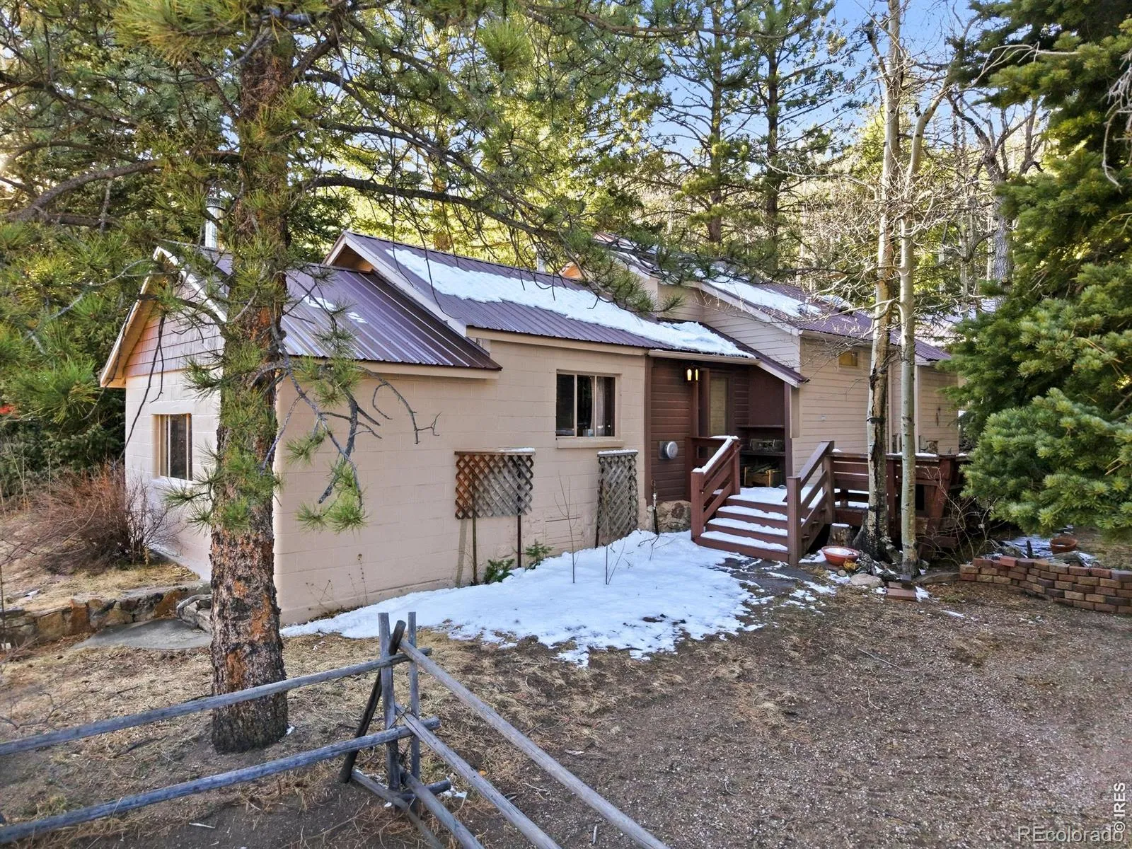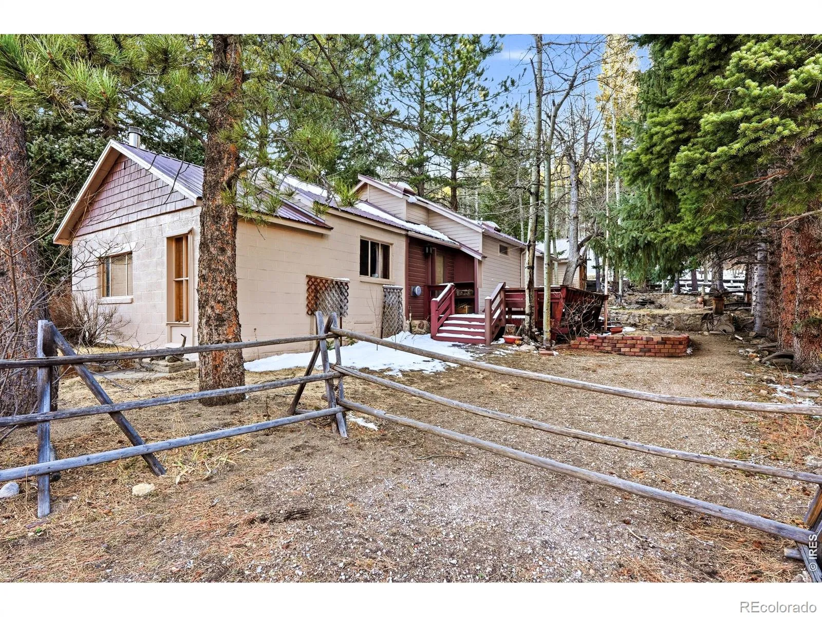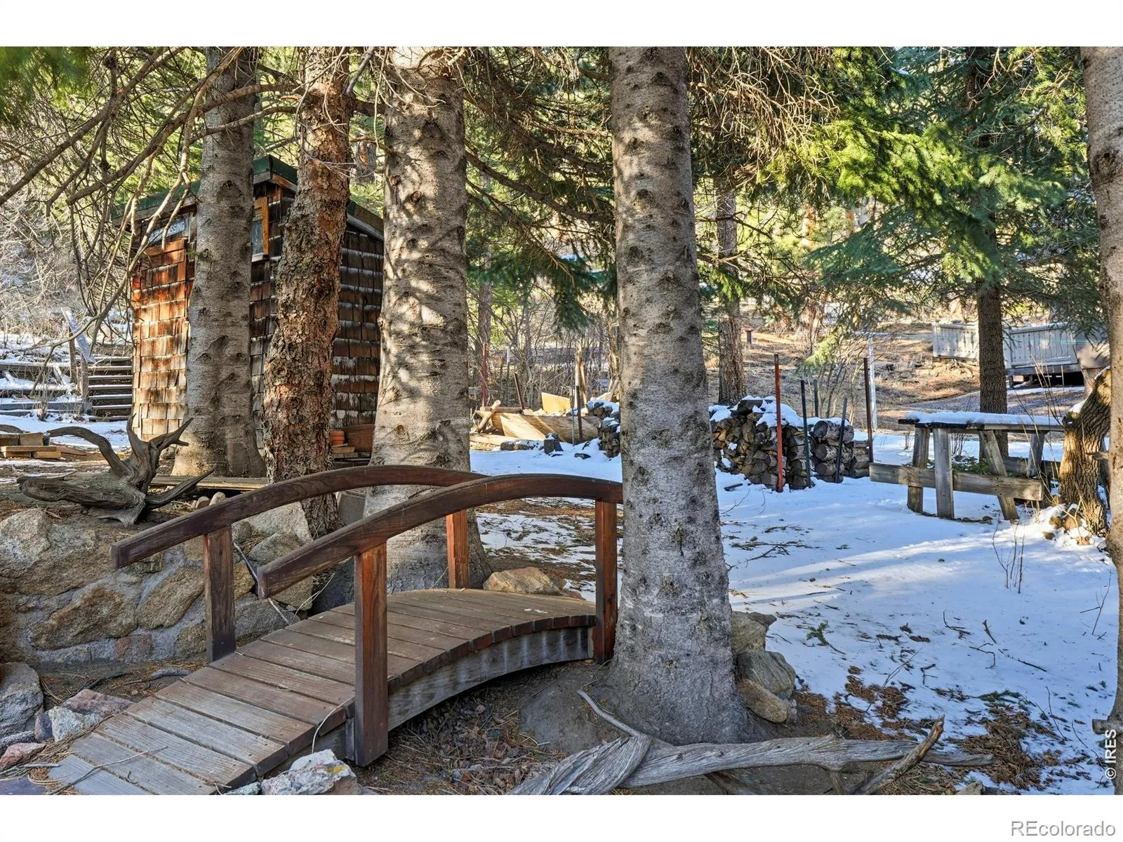 Cozy and charming cabin on 2+ lots with an awe-inspiring stand of gigantic, beautiful, stately spruce trees! Cabin features an updated bathroom, and an 11 x 6 loft area off of primary bedroom for children to sleep and/or play in! Lot features a detached 220 sq.ft. workshop/studio building; plenty of off-street parking, newer septic system (2006); seasonal water supply via shared ditch. Enjoy the view and sound of the middle St. Vrain Creek right across the roadway!