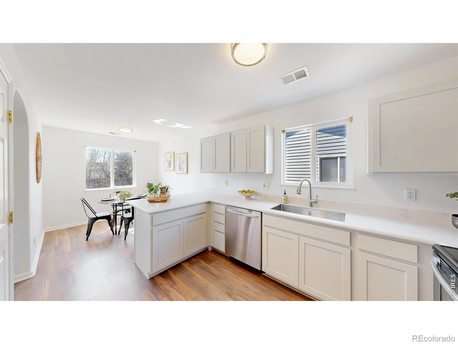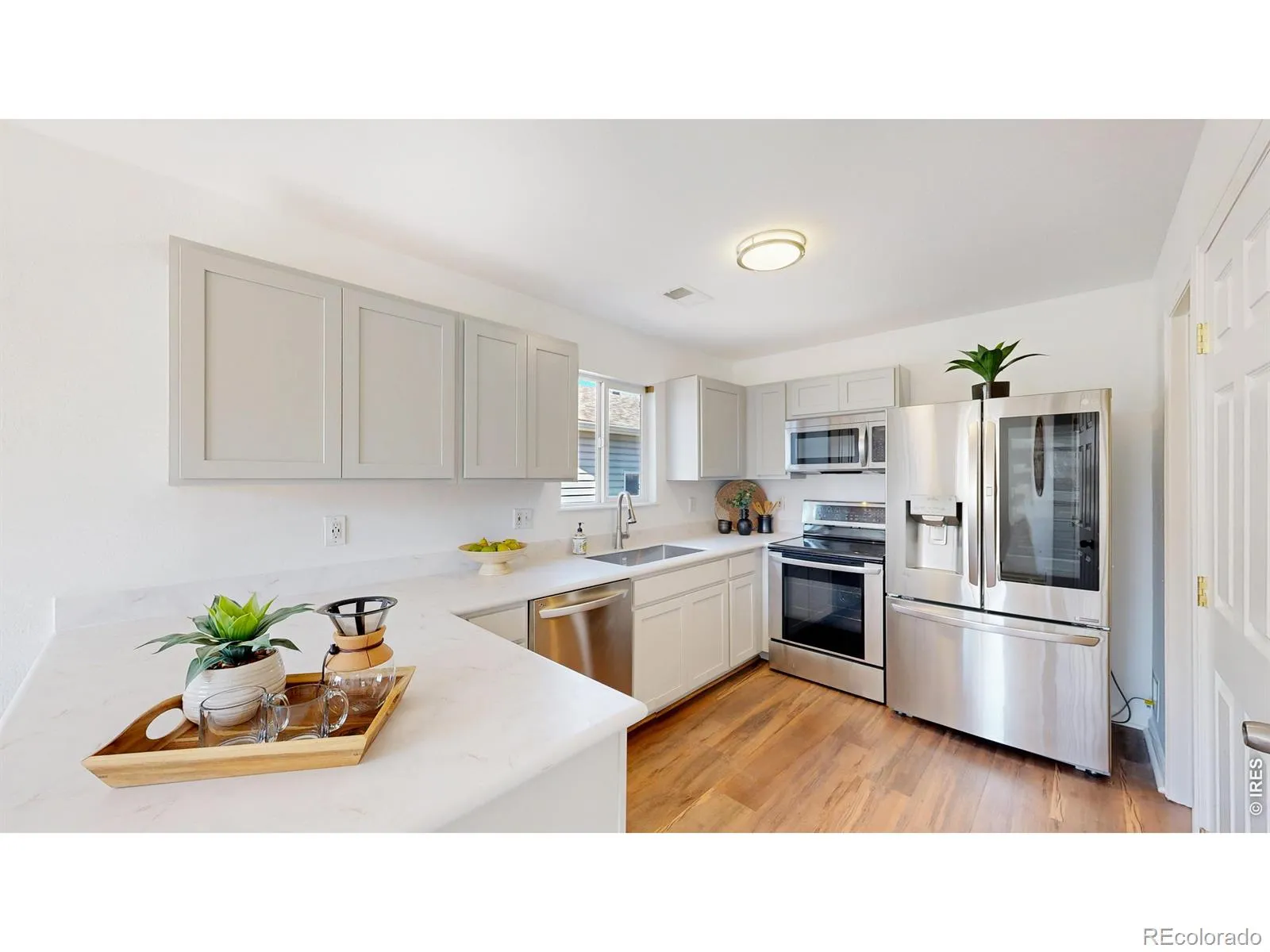 Updated, charming, and offering exceptional value, this Fort Collins gem checks all the boxes. From the moment you step inside, you’re welcomed by a bright, open living space filled with natural light and easy access to the outdoor deck-ideal for relaxing or entertaining. An arched doorway leads to the recently remodeled kitchen, complete with new LVP flooring throughout the main level, new cabinetry, quartz countertops, sink, and stainless steel appliances. Enjoy casual dining in the sun-filled kitchen nook, aplus the convenience of a walk-in pantry, a spacious laundry room, and a ain-level half bath. Upstairs, you’ll find three comfortable bedrooms, including one with a walk-in closet and scenic mountain views. Additional improvements include a new roof, new garage door, fresh interior paint. Furnace and A/C replaced in 2021, and the xeriscaped yard offers low-maintenance living, while the large deck creates the perfect outdoor retreat-all within the Fort Collins zip code at an incredible price point.
