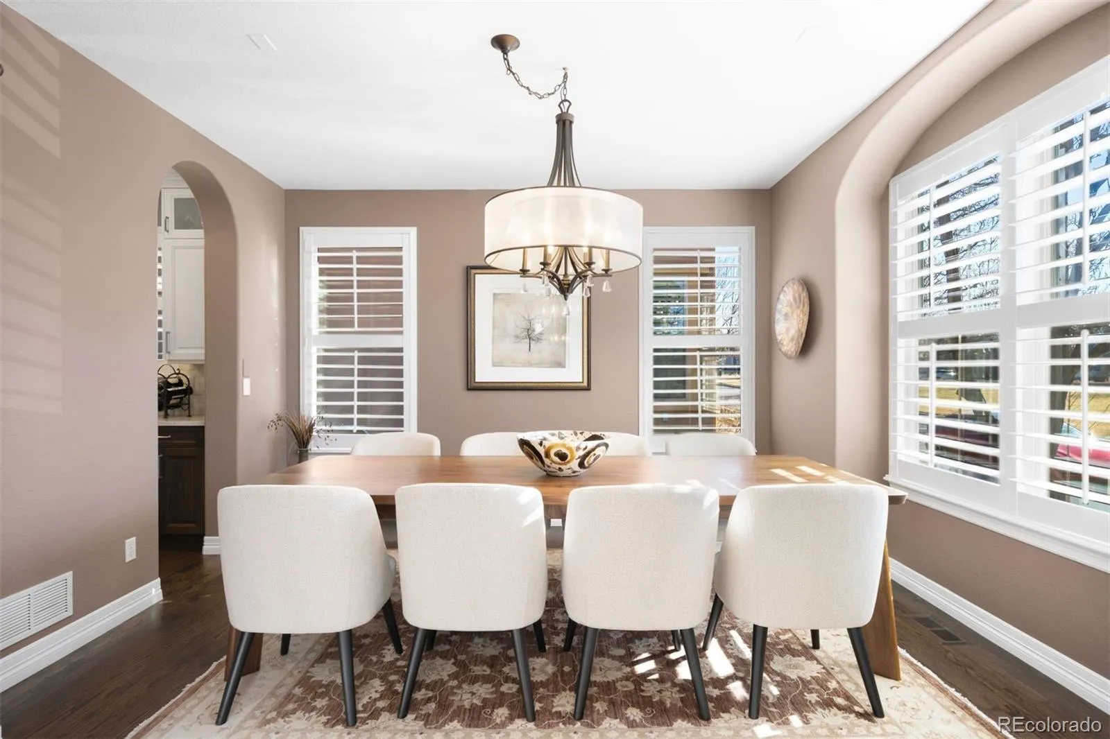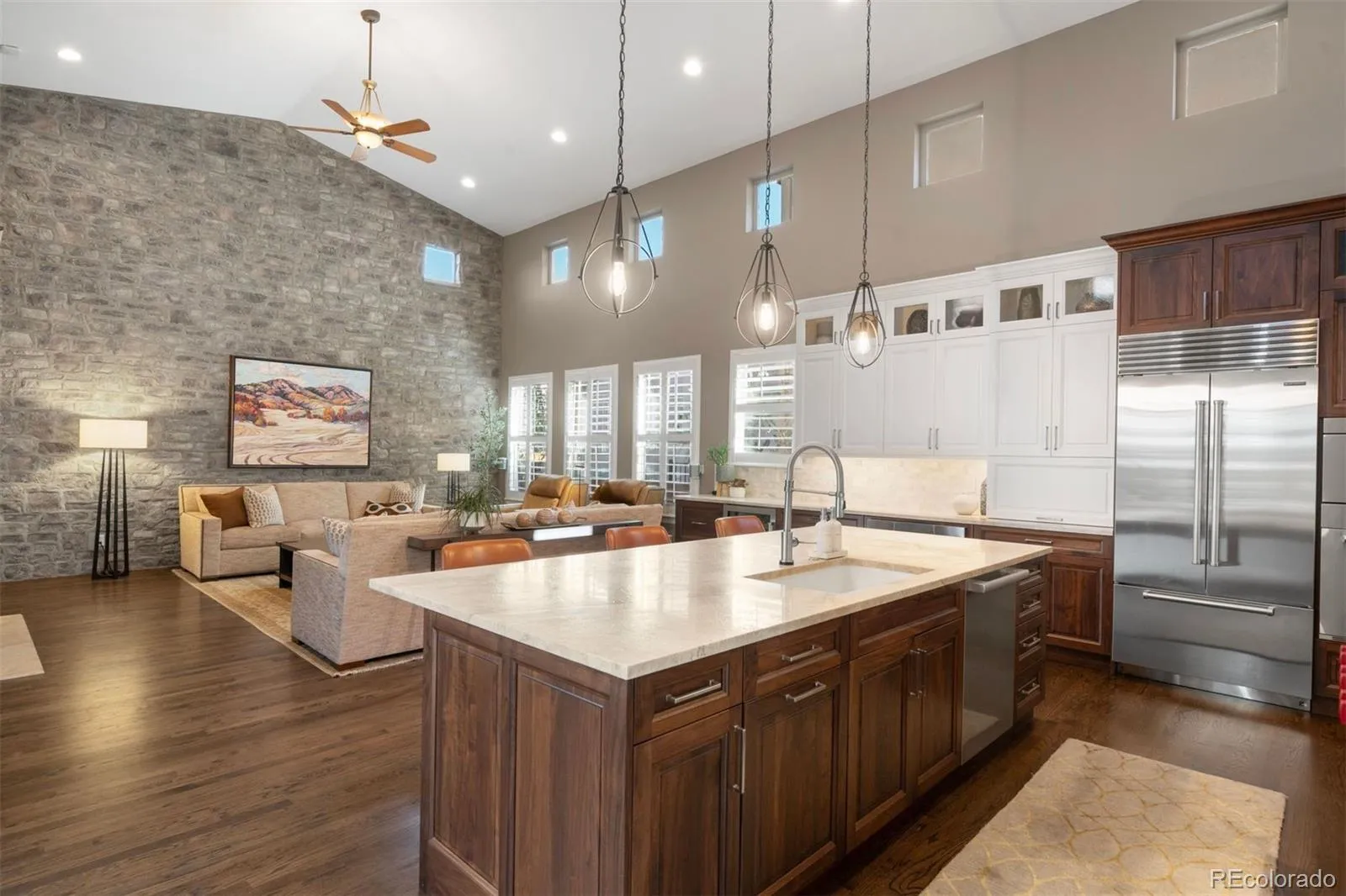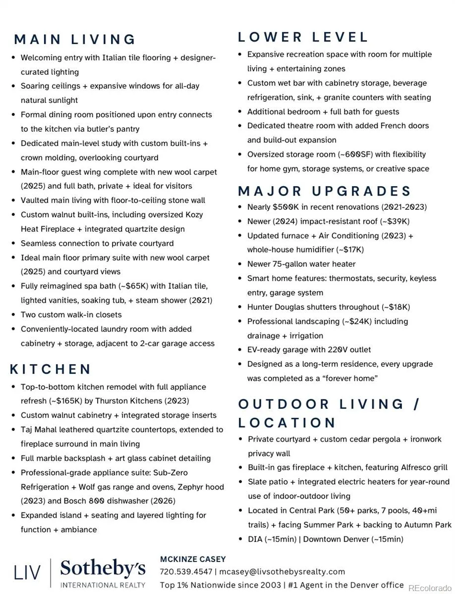 Extensively renovated, this coveted ranch floorplan with main-level primary suite in Central Park stands apart with vaulted ceilings, elevated designer finishes, and a distinctive sense of architectural presence. A custom front door welcomes natural light, opening to a sunlit entry anchored by Italian tile and a formal dining room framed by expansive windows. A well-appointed butler’s pantry connects seamlessly to the kitchen, creating an effortless flow for daily living and entertaining. A private main-level guest suite offers comfort for visitors, while a dedicated office with custom built-ins and crown molding overlooks the serene courtyard. The kitchen has been completely reimagined with custom walnut cabinetry, art glass detailing, and Taj Mahal leathered quartzite countertops, complemented by a marble backsplash and professional-grade appliance suite including Sub-Zero and Wolf. An expansive island and ambient lighting enhance function and design, while the kitchen opens seamlessly to the vaulted main living. A floor-to-ceiling stone accent wall and quartzite-lined fireplace define the space, while courtyard access creates a connected living experience. Outdoor living is equally considered, with a custom pergola, built-in Alfresco grill, built-in gas fireplace, and mature landscaping creating a private extension of the home. The primary suite offers a true retreat with courtyard views, two custom walk-in closets, and a spa-inspired bath featuring Italian tile, separate vanities, a soaking tub, water closet, and steam shower. The finished lower level provides flexibility with a spacious recreation area, wet bar with beverage refrigeration and seating, an additional bedroom and full bath, a dedicated theatre room, and nearly 600SF of unfinished storage. Additional upgrades include a newer roof, updated HVAC, smart home security features, custom Hunter Douglas shutters, and designer-curated finishes throughout.