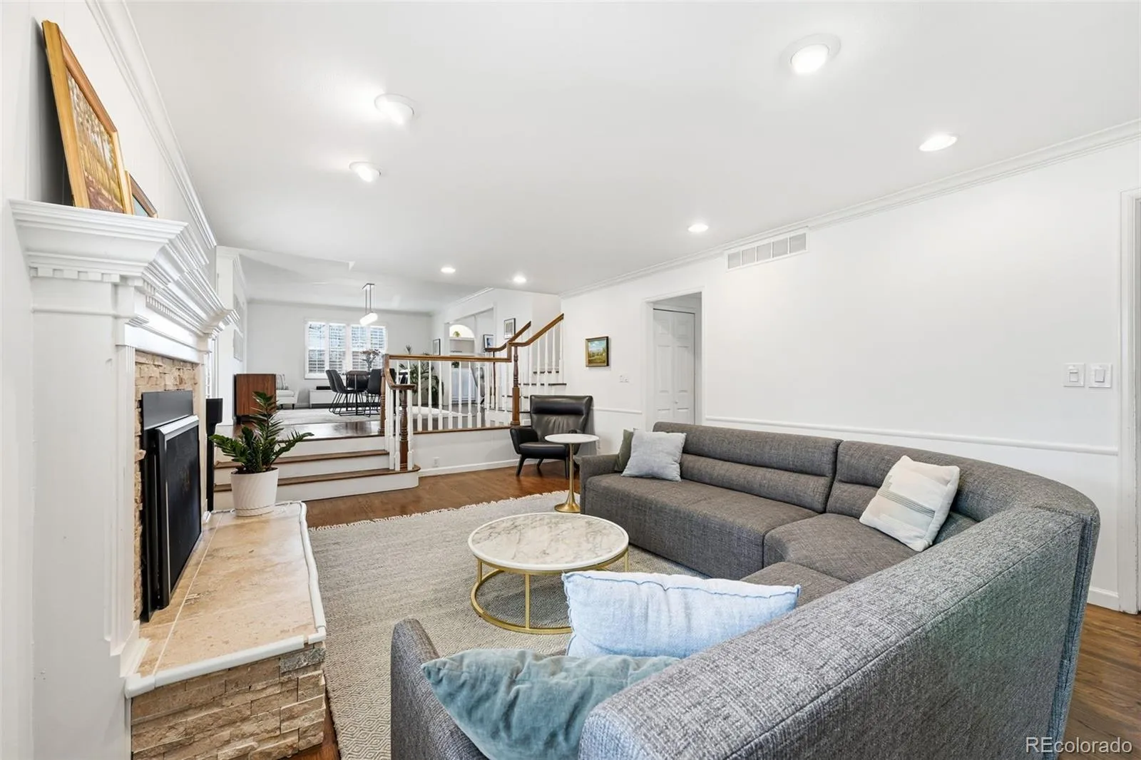 As you step inside, you’re greeted by warmth, character, and a highly functional floor plan. The main level features a gracious living room with a gas fireplace, a spacious dining area, and a sunroom that seamlessly connects to a family room with a second gas fireplace. A private office provides a quiet space to work or study.