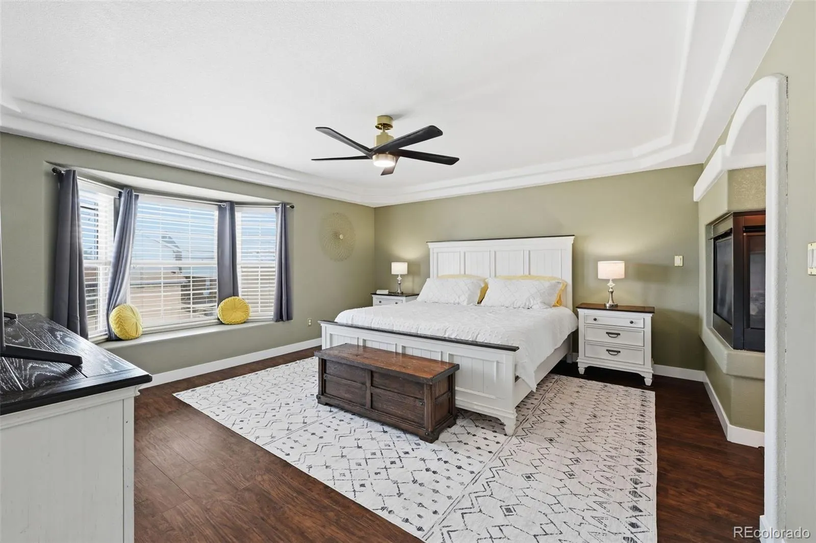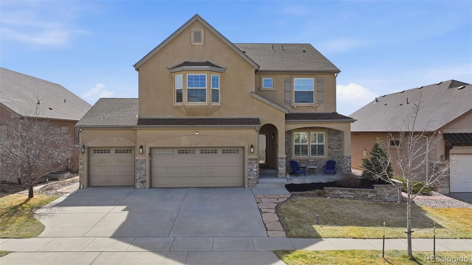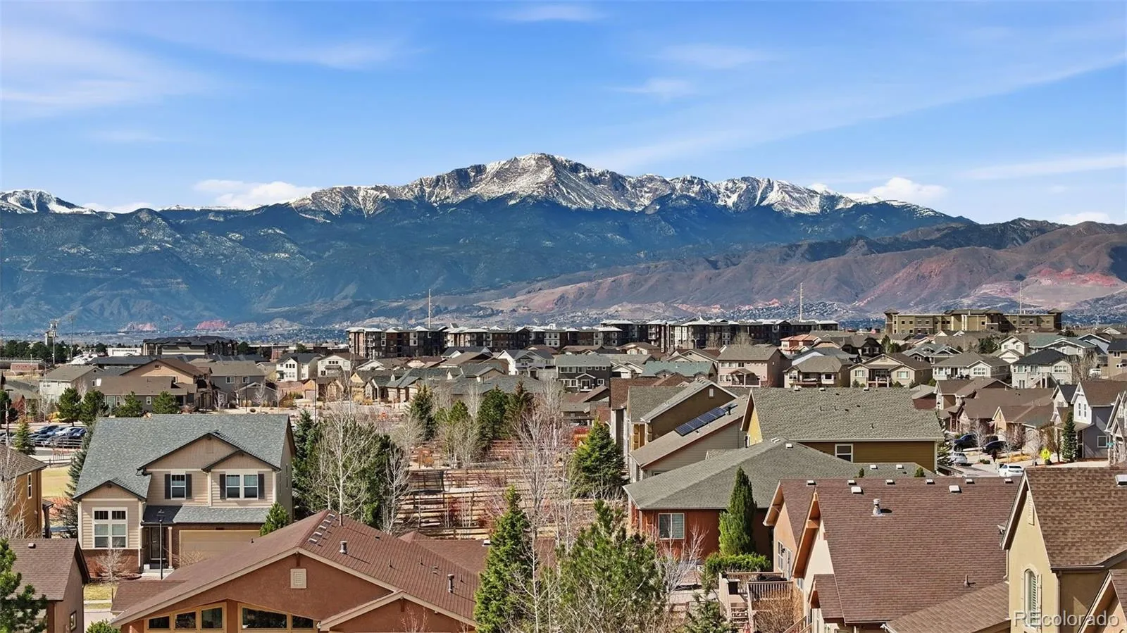 Located in the Wolf Ranch master-planned community within the award-winning Academy School District 20 and walking distance to the neighborhood elementary school, parks, and scenic trails. Spacious turnkey two-story home with a fully finished basement offering comfort, style, and modern functionality with Pikes Peak and Front Range mountain views. Main level features an open floor plan with natural hardwood floors, formal dining room, and bright great room with soaring ceilings and fireplace. Remodeled kitchen in May 2025 includes quartz countertops, farmhouse sink, new backsplash, stainless steel appliances, large center island, abundant cabinetry, and Butler’s Pantry with visibility throughout the main living area. Upstairs loft provides additional living space ideal for office, media room, or second family room. Primary suite features a two-sided fireplace separating the bedroom and spa-style bath with dual vanities, soaking tub, spacious shower, and large walk-in closet. New flooring extends through the primary suite, hallway, and loft. Finished basement includes bedroom, large family or recreation room, and wet bar ideal for guests, multi-generational living, or entertainment. Recent upgrades include fresh interior paint, new carpet, updated lighting, new ceiling fixtures throughout, and new living room ceiling fan. Smart home features include Ecobee thermostat and Vivint security system with cameras, exterior lighting, window and door sensors, and intercom communication to the front door and yard areas. Covered rear deck with outdoor TV overlooks the landscaped backyard and mountain views. Located minutes from the Wolf Ranch Recreation Center, pool, shopping, dining, and convenient access to Powers Boulevard and I-25. Walking distance to Wolf Ranch community events including summer concerts and fall pumpkin patch festival. Move-in ready and ideally located to enjoy the lifestyle, amenities, and community events that make this such a desirable neighborhood.