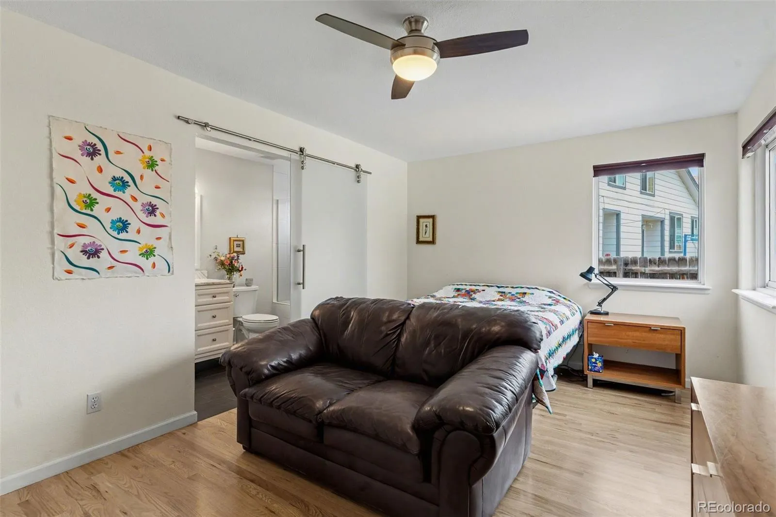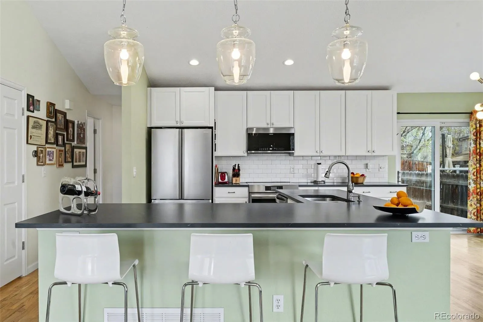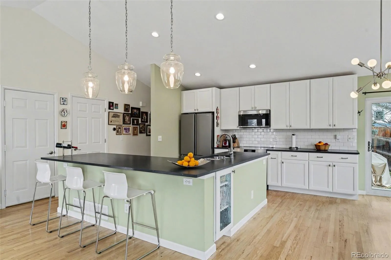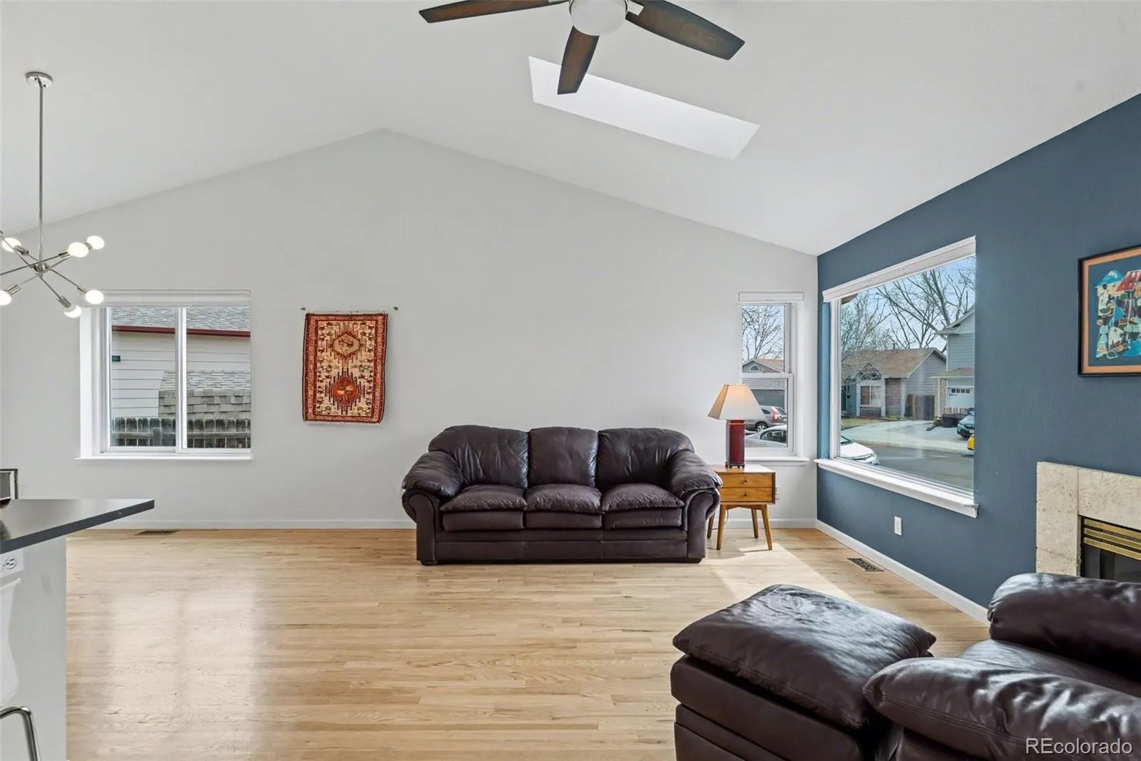 This incredibly well cared for Ranch style home offers all of the conveniences of one level living in the heart of Broomfield! As you enter, the open floor plan greets you with gleaming hardwood floors throughout and soaring vaulted ceilings with skylights which lend to the bright, natural light that fills this home. The remodeled kitchen with stone countertops, huge kitchen island with breakfast bar, updated soft close cabinets with pull out drawers and stainless steel appliances all overlook the separate dining and living rooms, creating the perfect space for gathering. You’ll love the cozy gas log fireplace in the living room and access to the back patio from the dining room to enter the big backyard with perennial gardens, mature trees and a storage shed. The primary bedroom with en suite private bath is filled with Italian tile surrounding the shower, tile floors and granite countertops. Here you will find the main level laundry that was added, truly allowing for one level living. The finished basement offers a wet bar, a third bathroom, another laundry hookup and even egress windows making this a perfect space for a 4th bedroom, mother in-law space or guest suite. Other features include top down, bottom up blinds, central air conditioning, sump pump and a new radon mitigation system. The seller of 24 years spared no expense, adding Hardie board cement siding with extra insulation and oversized gutters to the exterior. No HOA fees. This home shines with pride of ownership!