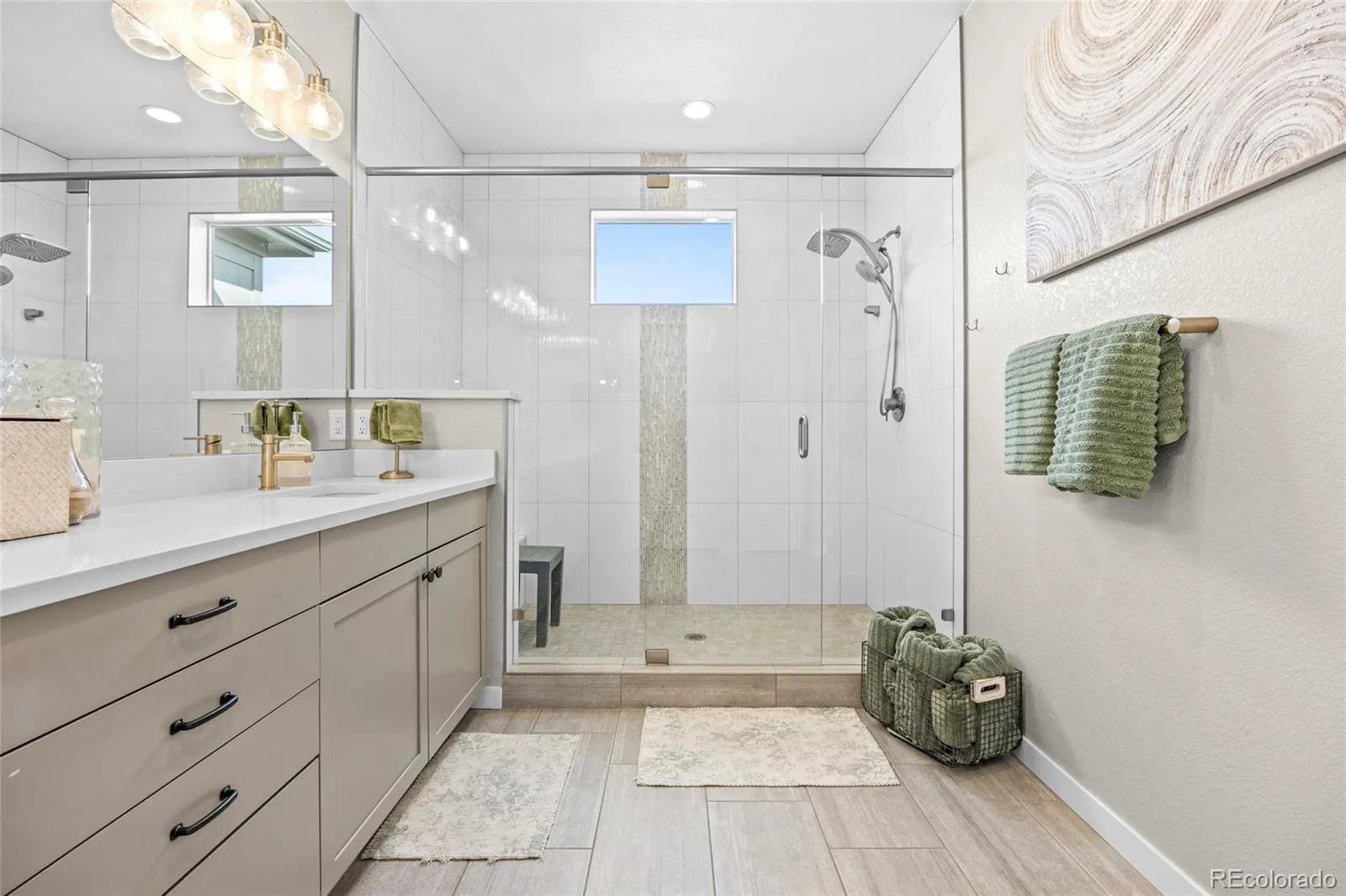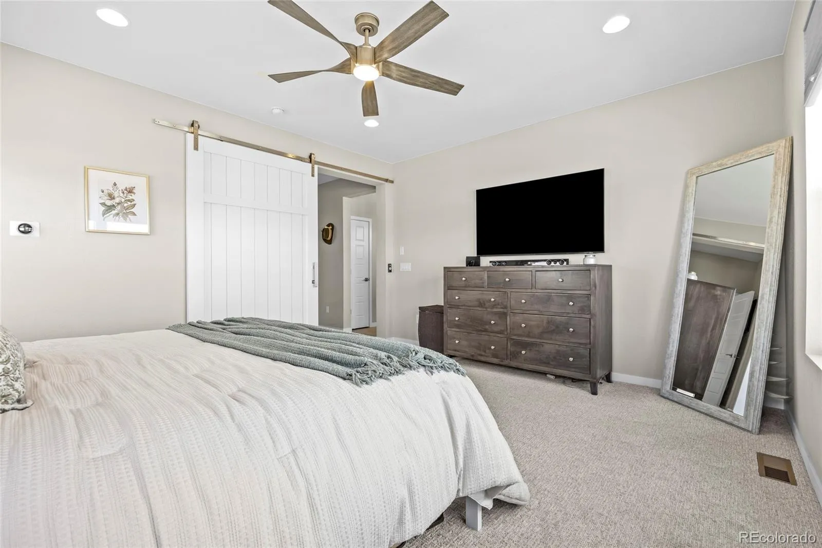 Upstairs, the primary suite offers a relaxing retreat with custom touches, including a stylish sliding barn door and built-in headboard. The en-suite bath features a beautifully designed, spacious shower. Two additional bedrooms and a full bath complete the upper level.