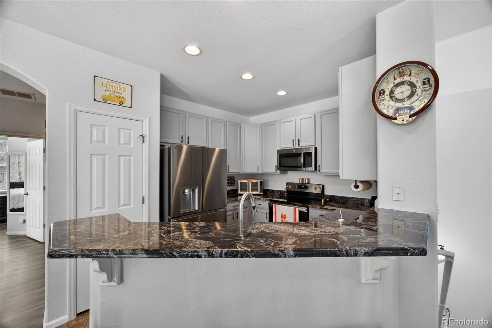 The updated kitchen is designed for both everyday living and entertaining, complete with slab granite countertops, painted cabinetry with updated hardware, stainless steel appliances, pantry storage, and seamless flow into the dining area with vaulted ceilings and direct access to the covered deck—perfect for enjoying Colorado evenings.