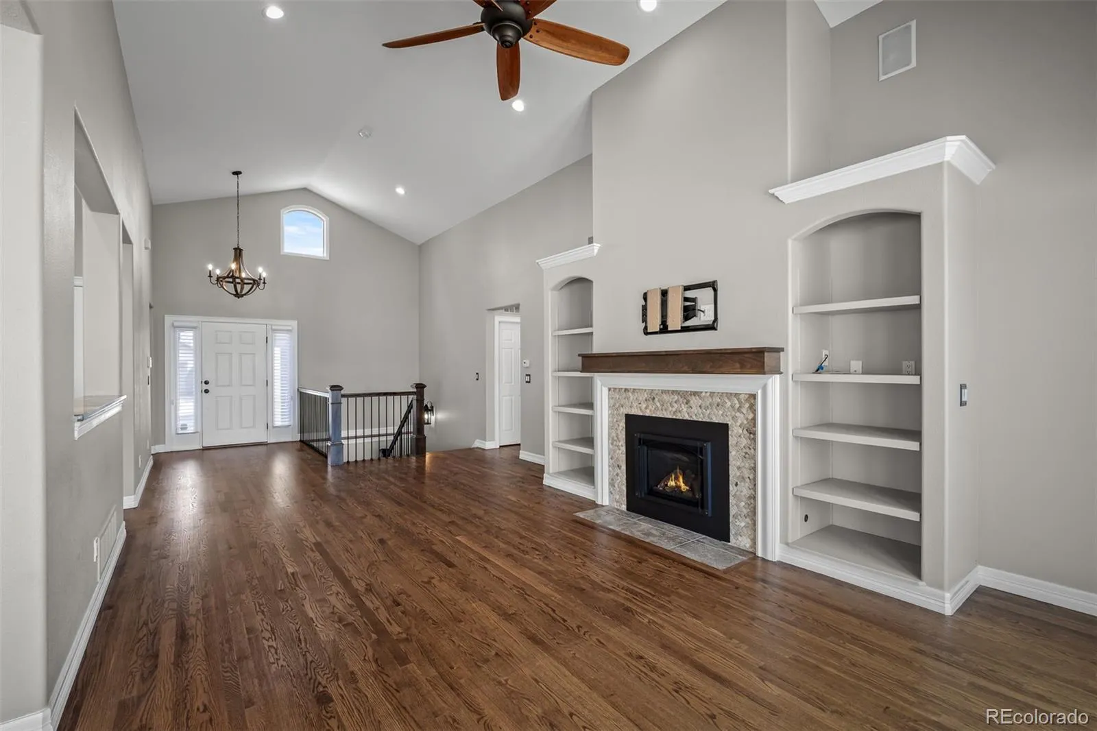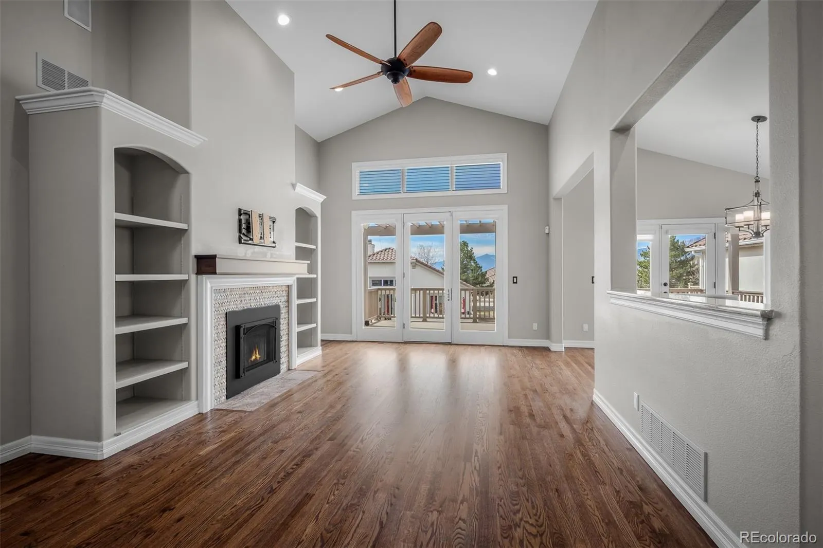 Immaculate walk-out rancher in the gated community of Cypress Ridge, showcasing some of the most exceptional mountain and Pikes Peak views you will find, perfectly positioned to enjoy beautiful Colorado sunsets. This “like new” 4-bedroom, 4-bath home offers true main-level living with a bright, open floor plan enhanced by vaulted and cathedral ceilings, walls of south-facing windows, and multiple atrium doors that seamlessly connect indoor and outdoor spaces. The beautifully updated interior features expansive hardwood flooring, granite countertops, travertine tile, motorized blinds, a water softener, and a whole-house generator system, with no detail overlooked in this remodeled beauty!The spacious kitchen includes stainless steel appliances, ample cabinetry, a breakfast bar, and a trash compactor, opening to both formal and casual dining areas designed to capture the remarkable views. The great room features a cozy gas log fireplace, creating a warm and inviting focal point. The private primary suite provides direct deck access and a fully remodeled bath with an oversized shower, and raised counters and a nice sized walk in closet. Each bedroom includes its own bath, offering comfort and privacy. The finished walk-out basement expands the living space with a large recreation area and wet bar, ideal for entertaining. Outdoor living is exceptional with a brand-new expanded deck and a covered patio below, perfectly positioned to enjoy the panoramic setting. Additional features include A/C, ceiling fans, two large storage rooms providing ample storage and flexibility for everyday convenience, and a main-level laundry with washer and dryer. Stucco exterior with a tile roof enhances durability and curb appeal. HOA provides low-maintenance living with exterior upkeep, landscaping, snow removal, and gated security. Conveniently located near shopping, dining, entertainment, and I-25. Shows beautifully and has been fully updated with top-of-the-line finishes throughout.