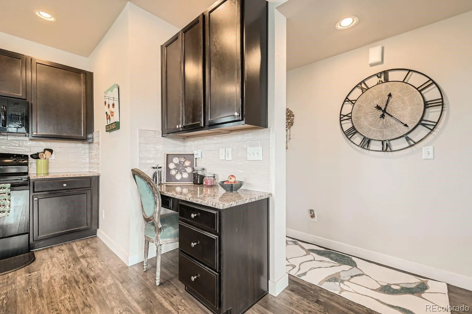 The kitchen combines contemporary finishes with a functional layout, featuring a large granite island, ample counter and cabinet space, sleek black appliances, and a classic white subway tile backsplash. Pendant and recessed lighting enhance the space, while a dedicated “nook” offers flexibility for a small workspace or coffee bar. The dining area sits just off the kitchen, ideal for everyday living and hosting. A half bath just off the kitchen and living area offers added convenience.