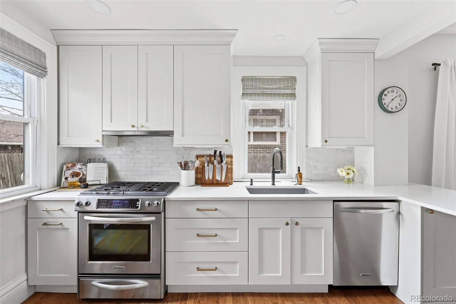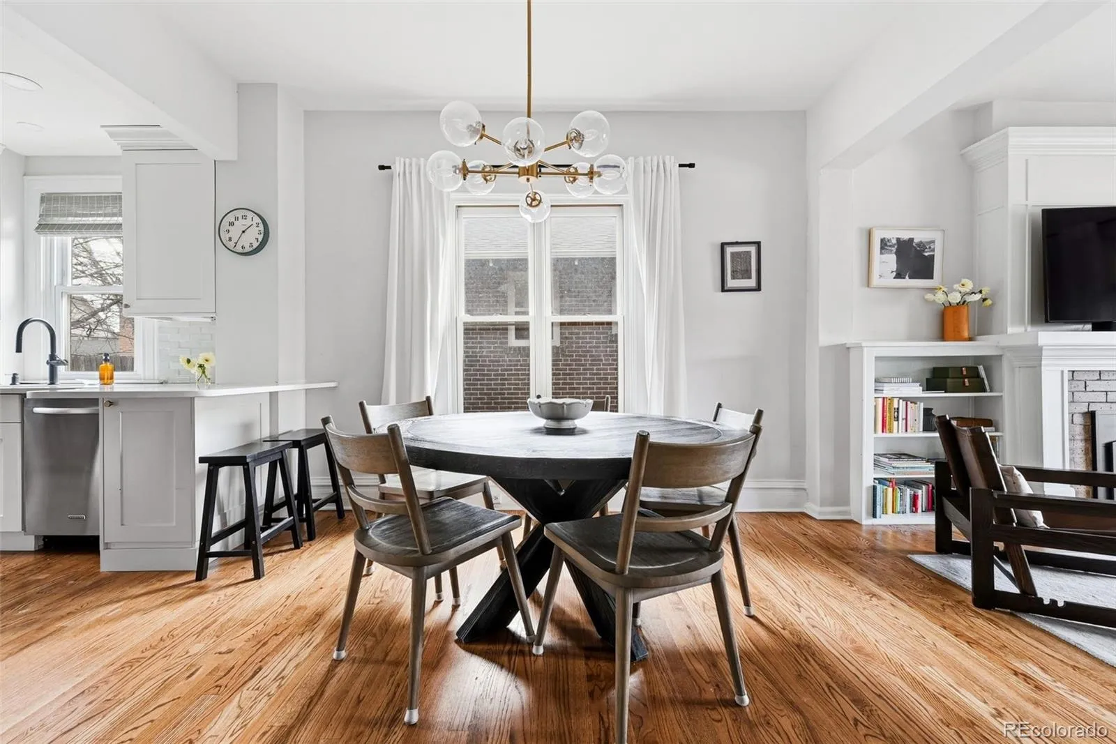 Inside, you’ll find elegant finishes and a beautifully updated kitchen with high-end cabinetry, a gas range, and a peninsula offering additional workspace and seating. The open floor plan features high ceilings, real hardwood floors, and abundant natural light from numerous south-facing windows. The dining room has a beautiful chandelier and charming built-ins. The living room showcases a gas fireplace and built-in bookshelves.
