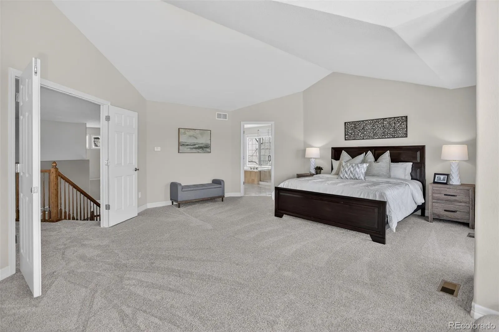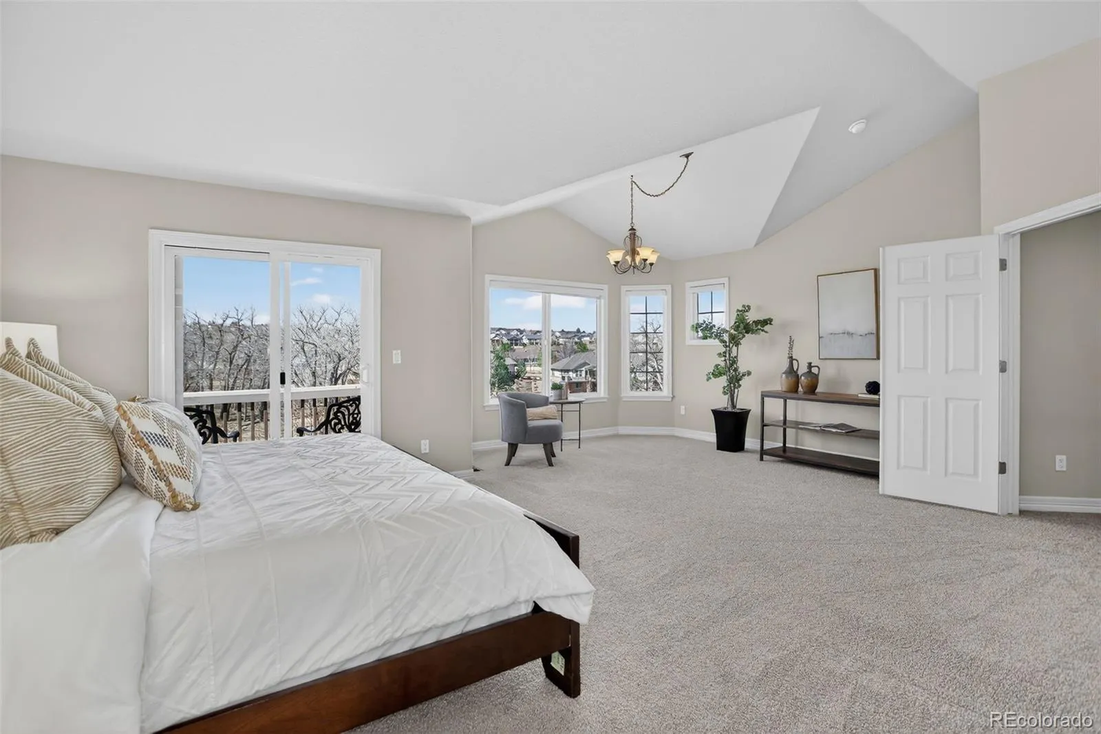 the spacious primary suite offers a private balcony, luxurious bath, and walk in closet,