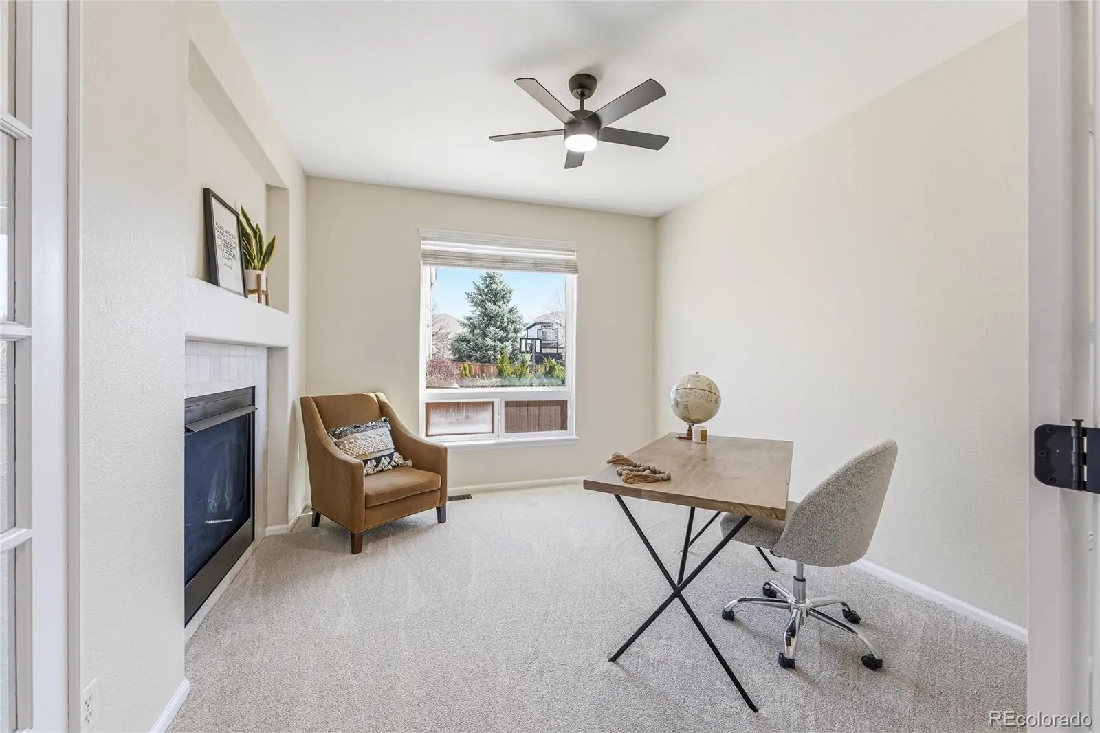 The main floor office/flex room with French doors is ideal for working from home and features a double-sided fireplace shared with the great room.