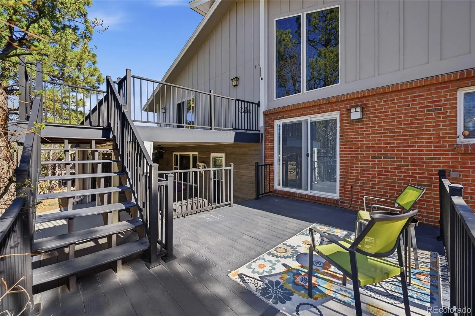 Tucked away on a quiet cul-de-sac in The Pinery, this beautifully updated home offers an exceptional blend of space, comfort, and Colorado elegance. Surrounded by towering pines and abundant wildlife, the setting feels like a private retreat within easy reach of shops & restaurants of downtown Parker, along with parks, trails, and just moments from The Pinery Country Club, golf course, and tennis facilities. A welcoming covered front entry and dramatic entryway set the tone as you step inside. Soaring vaulted ceilings and striking architectural windows fill the home with natural light, highlighting solid hardwood flooring and the home’s distinctive design. The open living spaces are functional and full of character. The kitchen is a true centerpiece, featuring honed granite countertops, a butcher block island, a well designed walk-in pantry, abundant cabinetry, and a bright eat-in area that opens to the expansive, multi-level Trex deck—perfect for entertaining or relaxing in the peaceful, pine-filled setting. With three levels, including private access from an upstairs guest bedroom, the outdoor space is a standout, complemented by a covered patio below for year-round outdoor enjoyment. Upstairs, four spacious bedrooms include a luxurious primary suite with an expansive layout and a large en-suite bath, with a second full bathroom serving the additional bedrooms. A flexible office/potential fifth bedroom with its own private exterior entrance is ideal for a home business, studio, or guest space. A cozy family room with gas fireplace offers the perfect place to unwind on cool Colorado evenings, while the finished basement provides endless possibilities. Designed with everyday living in mind, the home offers abundant storage throughout. Located just steps from Mountain View Elementary, this home combines comfort, versatility, and natural beauty in one of The Pinery’s most desirable settings—offering a perfect balance of peaceful living and everyday convenience.