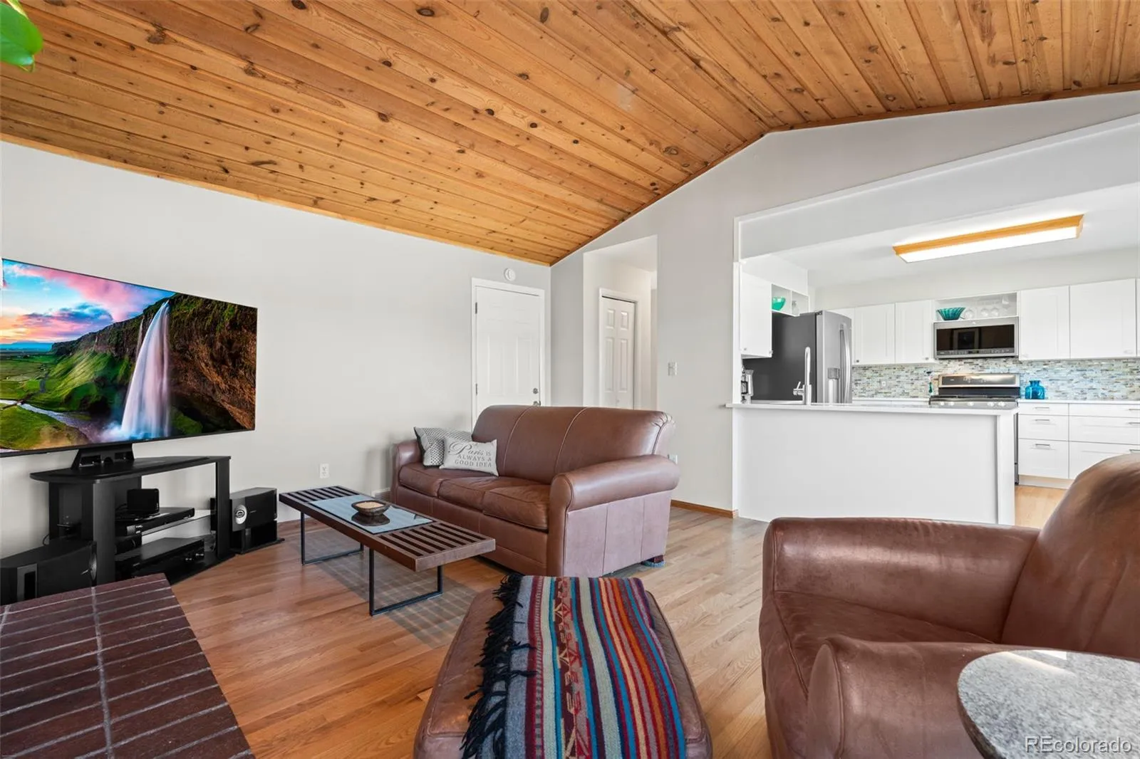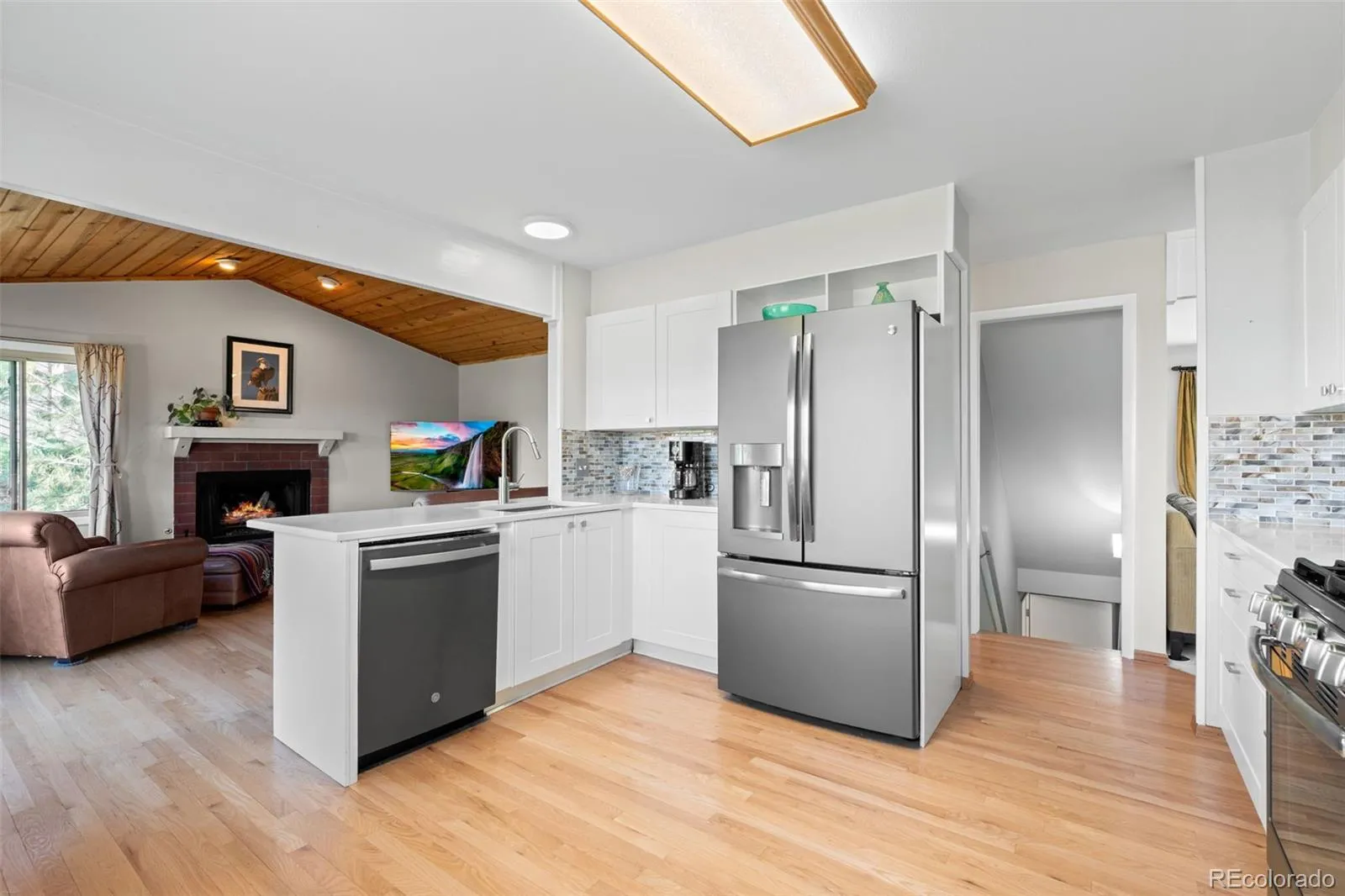 Warm tongue-and-groove ceilings along with a gas fireplace complement the open family room. The kitchen,