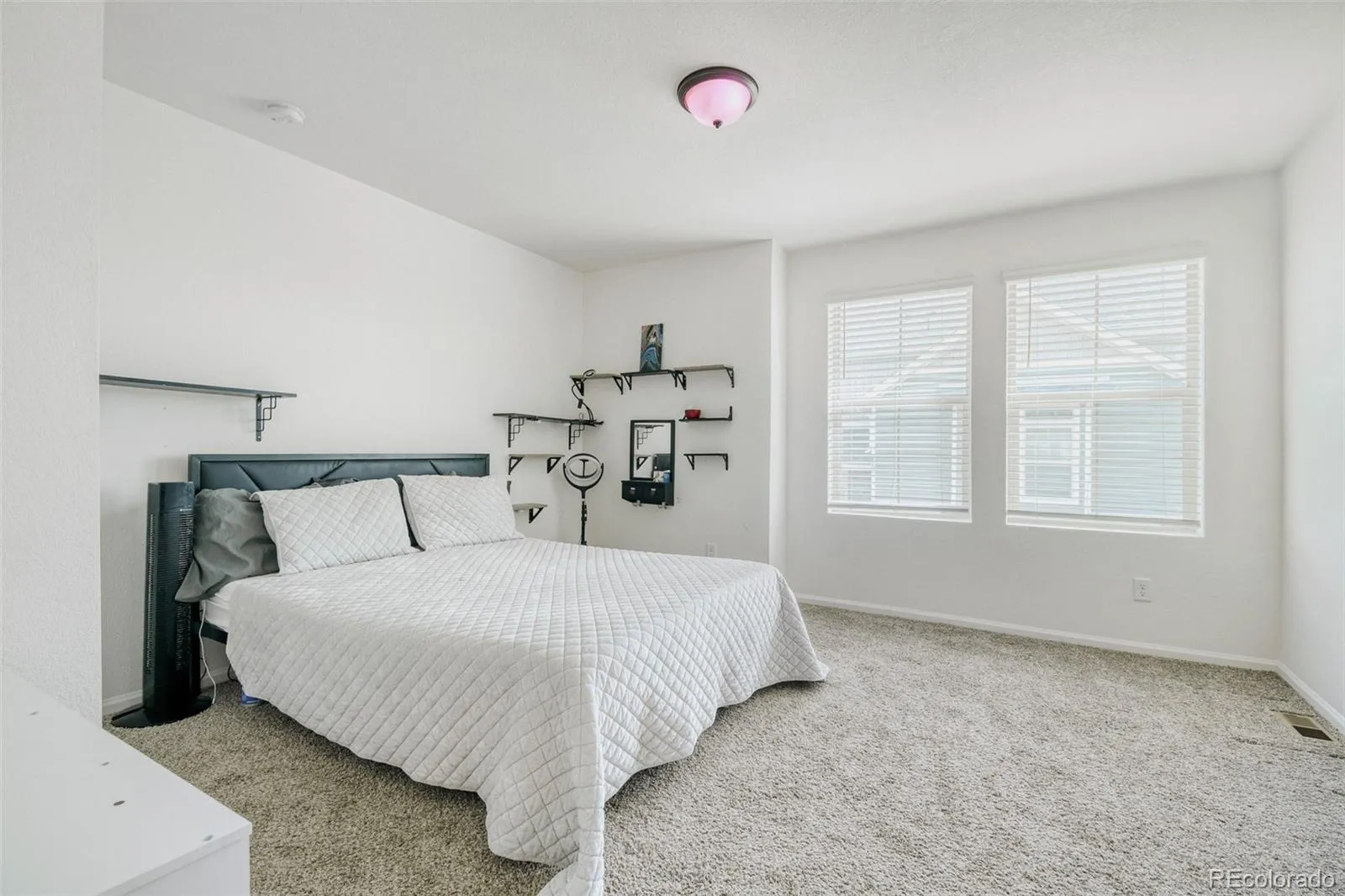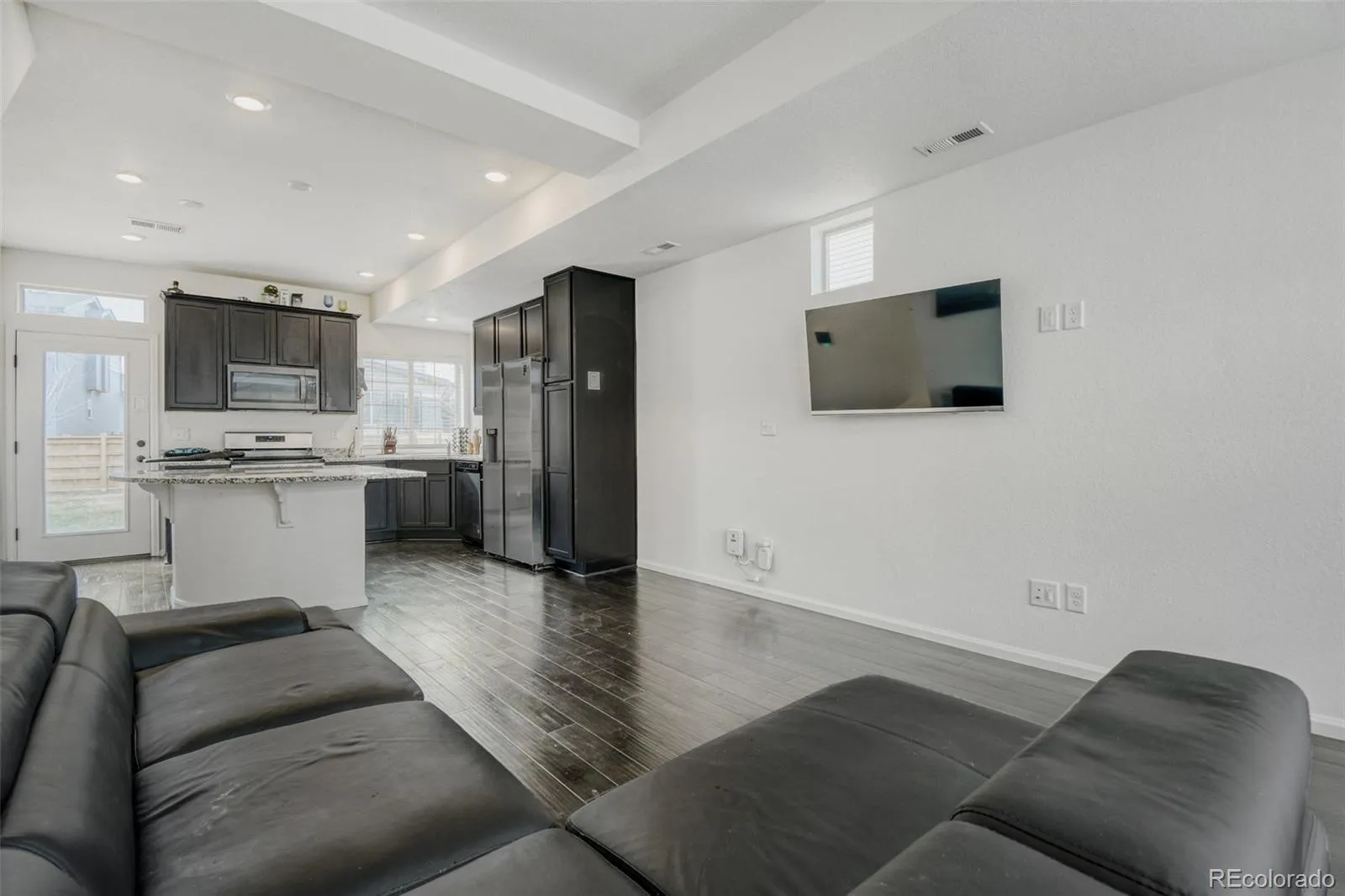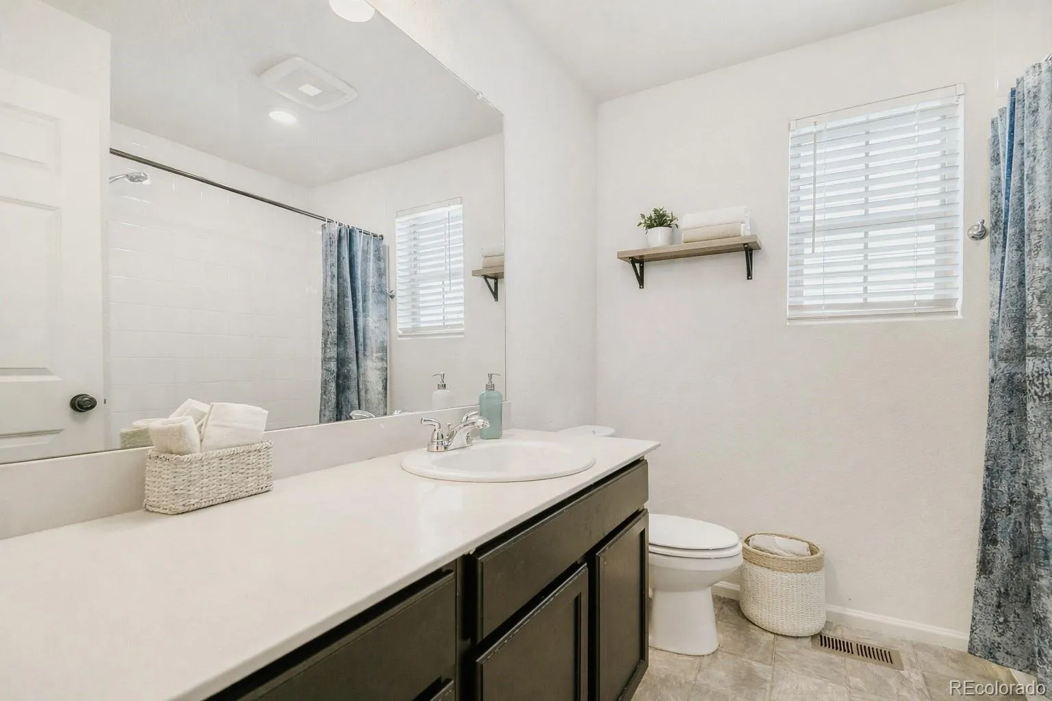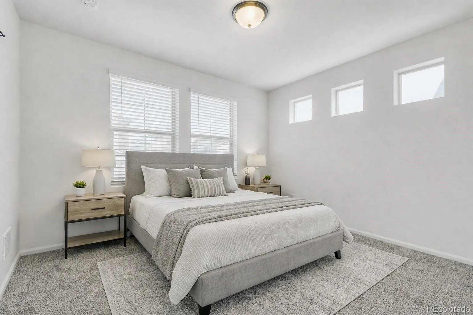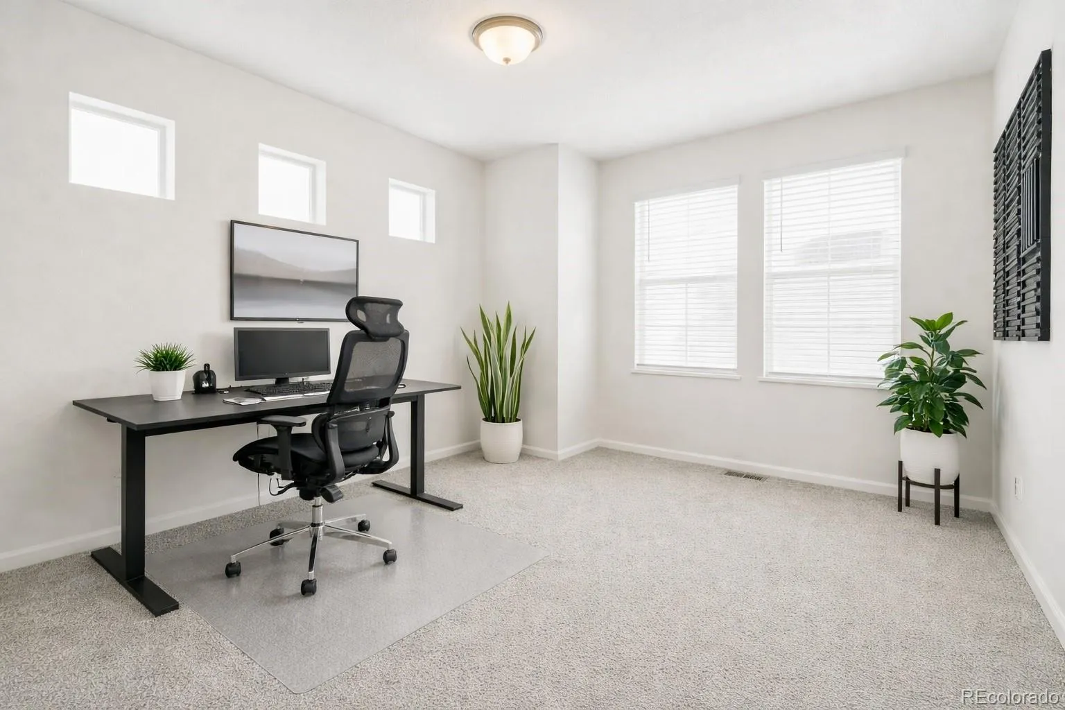 Discover a home that feels like a true retreat. Currently a 2 bed / 2 bath layout, with the seller willing to convert the upstairs flex space into a fully conforming 3rd bedroom if desired. (Some photos are Photoshop-generated for visualization.) Set on one of the largest lots in the neighborhood, the backyard is oversized, private, and beautifully landscaped—perfect for BBQs, pets, gardening, or simply unwinding outdoors. Head up to the spacious rooftop deck to take in sweeping mountain views and Colorado sunsets. Inside, the home feels bright and welcoming with hardwood floors, new carpet, upgraded cabinets, and a large kitchen island that naturally becomes the gathering spot. Upstairs, the flexible loft can be an office, media space, or easily converted to that optional 3rd bedroom. Two secondary bedrooms offer great space, while the primary suite provides a peaceful retreat with a walk-in closet and updated en-suite bath. Convenience continues with an upstairs laundry room (washer/dryer included), a main-level powder room, paid-off solar panels for energy savings, and a security system for peace of mind. This home also offers a rare courtyard setting shared with only one other property, creating privacy that’s hard to find. Enjoy walkability to the nearby elementary school and quick access to shopping, dining, parks, and DIA. Whirlpool stainless range, microwave, and dishwasher; Samsung refrigerator; Samsung washer and dryer; and the living room TV are all included. Additional furnishings may be included upon request. If you’re looking for comfort, flexibility, and the best of Colorado living, this home delivers it all.