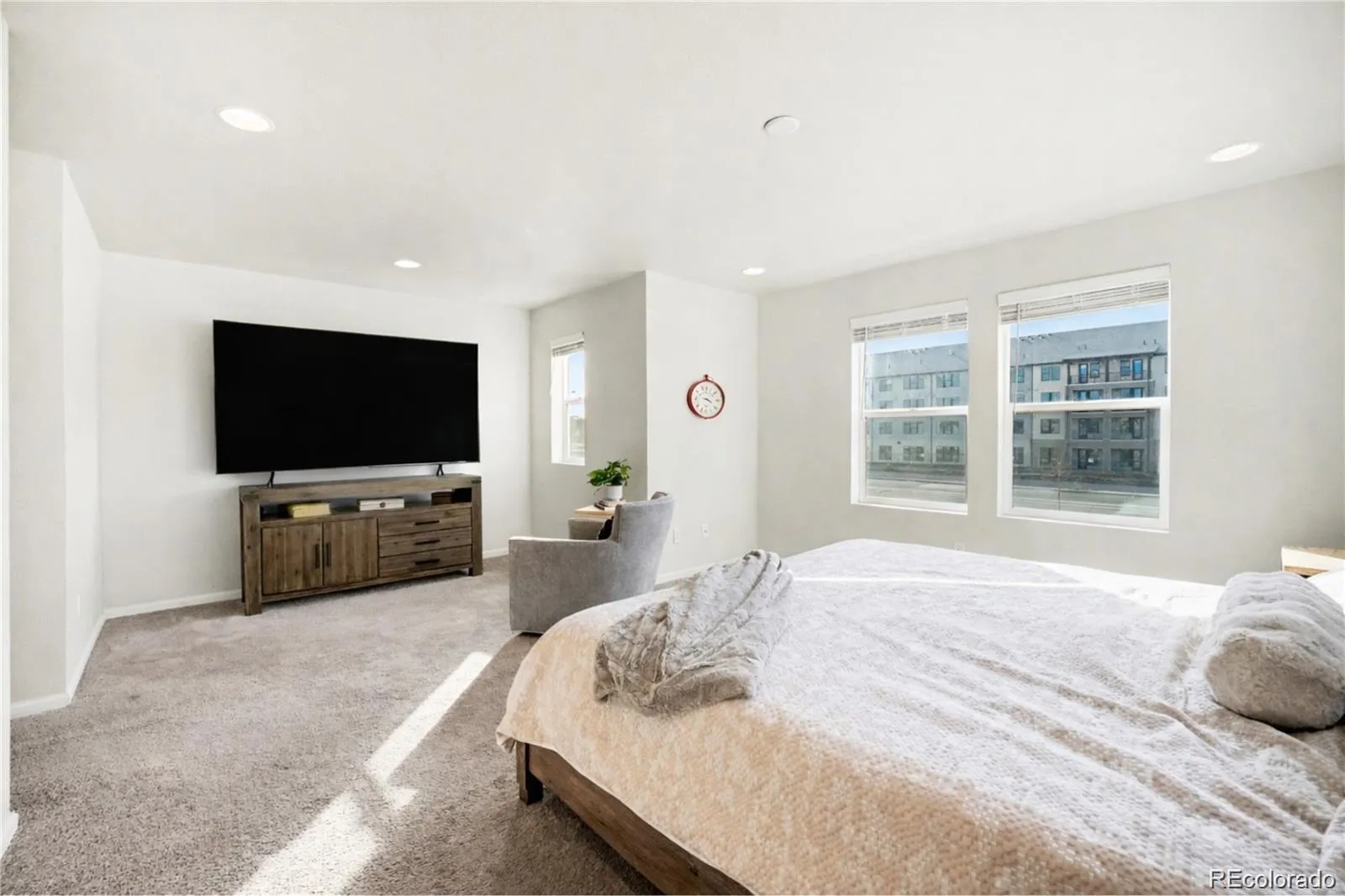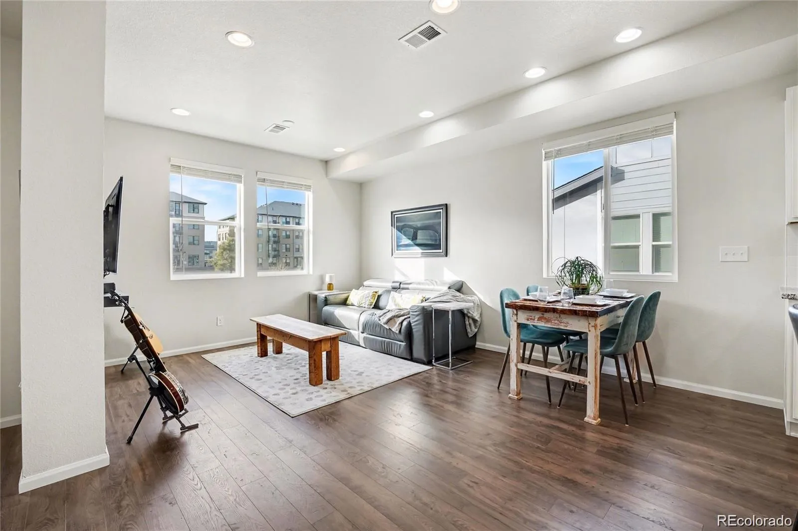 Welcome to a beautifully designed corner unit home, offering modern finishes, open-concept living, and exceptional functionality in a rapidly growing Denver location. The main level showcases rich hardwood flooring, abundant recessed lighting, and a seamless flow between the living, dining, and kitchen spaces. The living room features large windows for natural light and a stylish accent wall, creating a warm and inviting atmosphere. The kitchen is the heart of the home with white cabinetry, granite countertops, stainless steel appliances, subway tile backsplash, and a generous island with seating — ideal for entertaining or everyday living. stylish pendant lighting and ample cabinet space complete the space. Upstairs, you’ll find a spacious primary retreat filled with natural light and neutral carpeting. The primary bathroom offers dual sinks, granite countertops, and a walk-in shower. All bedrooms include walk-in closets, providing excellent storage throughout. Convenient upper-level laundry makes daily living effortless. Additional bedrooms are well-sized and versatile for guests, home office, or flex space. Enjoy the convenience of an attached two-car garage — perfect for protecting vehicles from Colorado’s changing weather. Located with easy access to DIA, E-470, I-70, The Gaylord of the Rockies, shopping, dining, and nearby parks, this home offers comfort, style, and convenience all in one. Move-in ready and thoughtfully designed — don’t miss this opportunity!