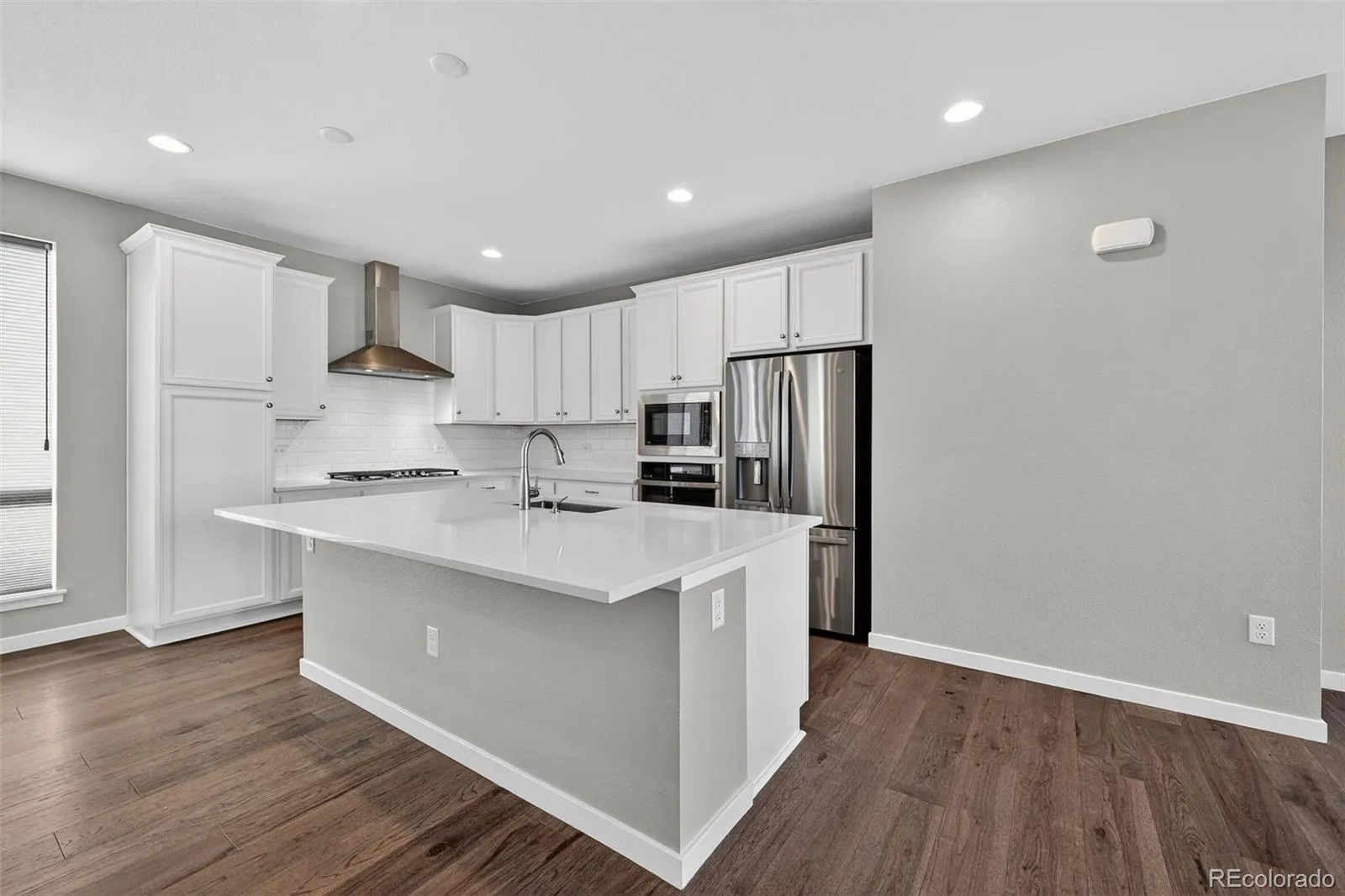 Inside, three levels of well-proportioned space showcase thoughtful design and quality finishes. The main level features an open-concept layout where a spacious family room flows into an oversized kitchen—ideal for gatherings and daily living. The kitchen boasts quartz counters, upgraded appliances, a full tile backsplash, and a large island with ample prep space. A conveniently located powder room serves this main living area, and expansive windows bring in abundant natural light.