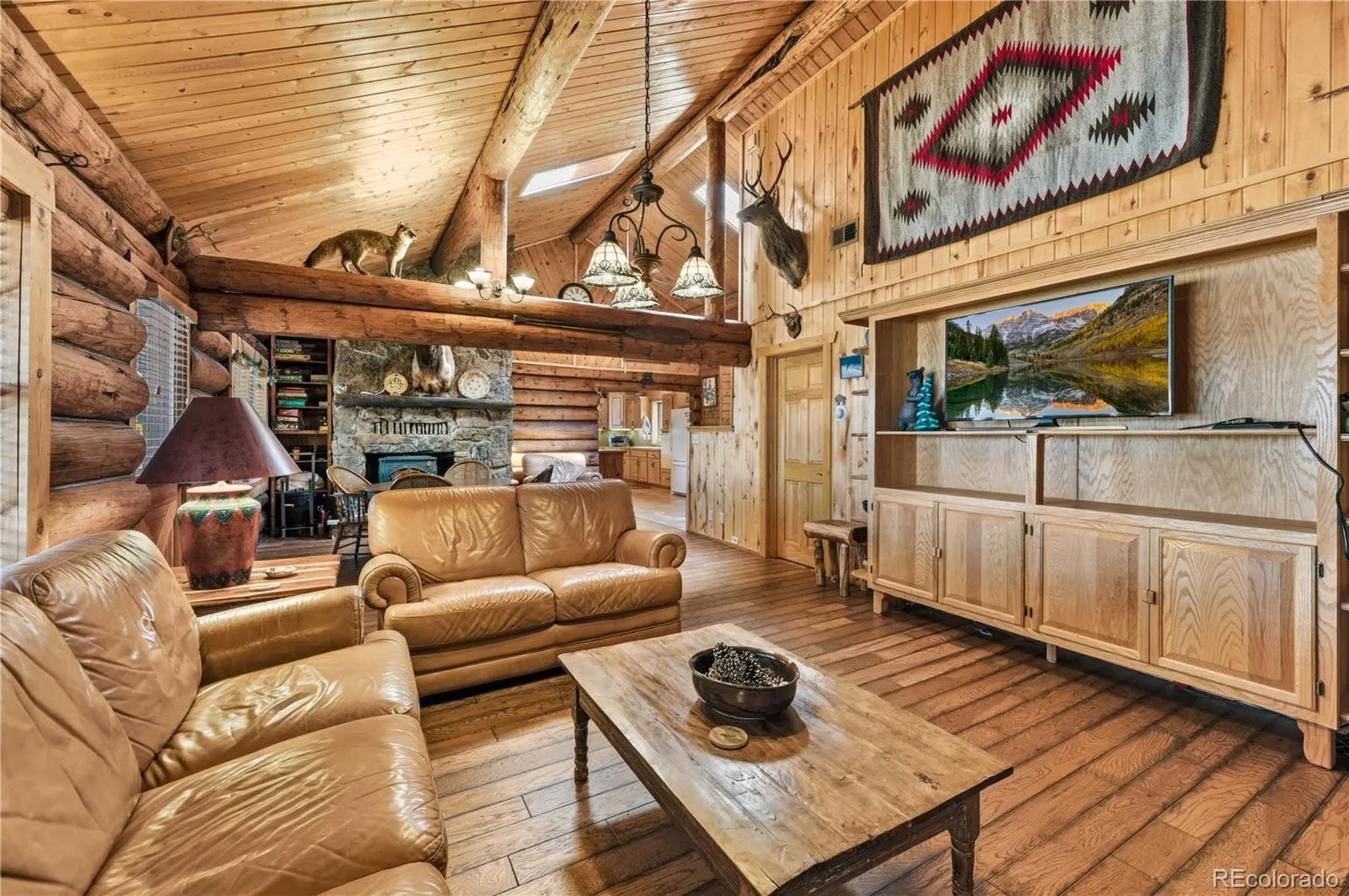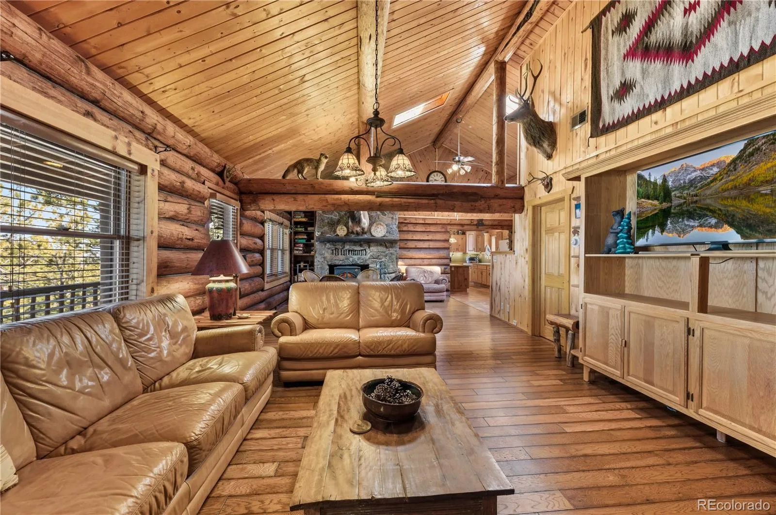 The interior blends rustic character with functional space, highlighted by vaulted T&G ceilings, a wood fireplace, and a large covered deck for enjoying the mountain views. An open layout on the main floor connects the kitchen, dining, and living areas. A custom wood dining room table and large kitchen island create ample space for family and friends to gather.