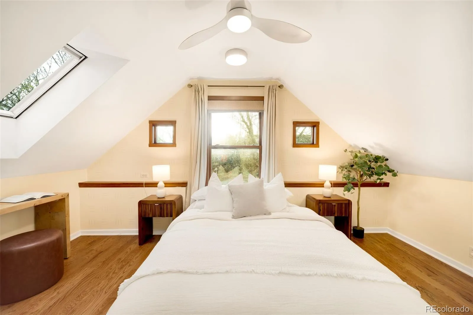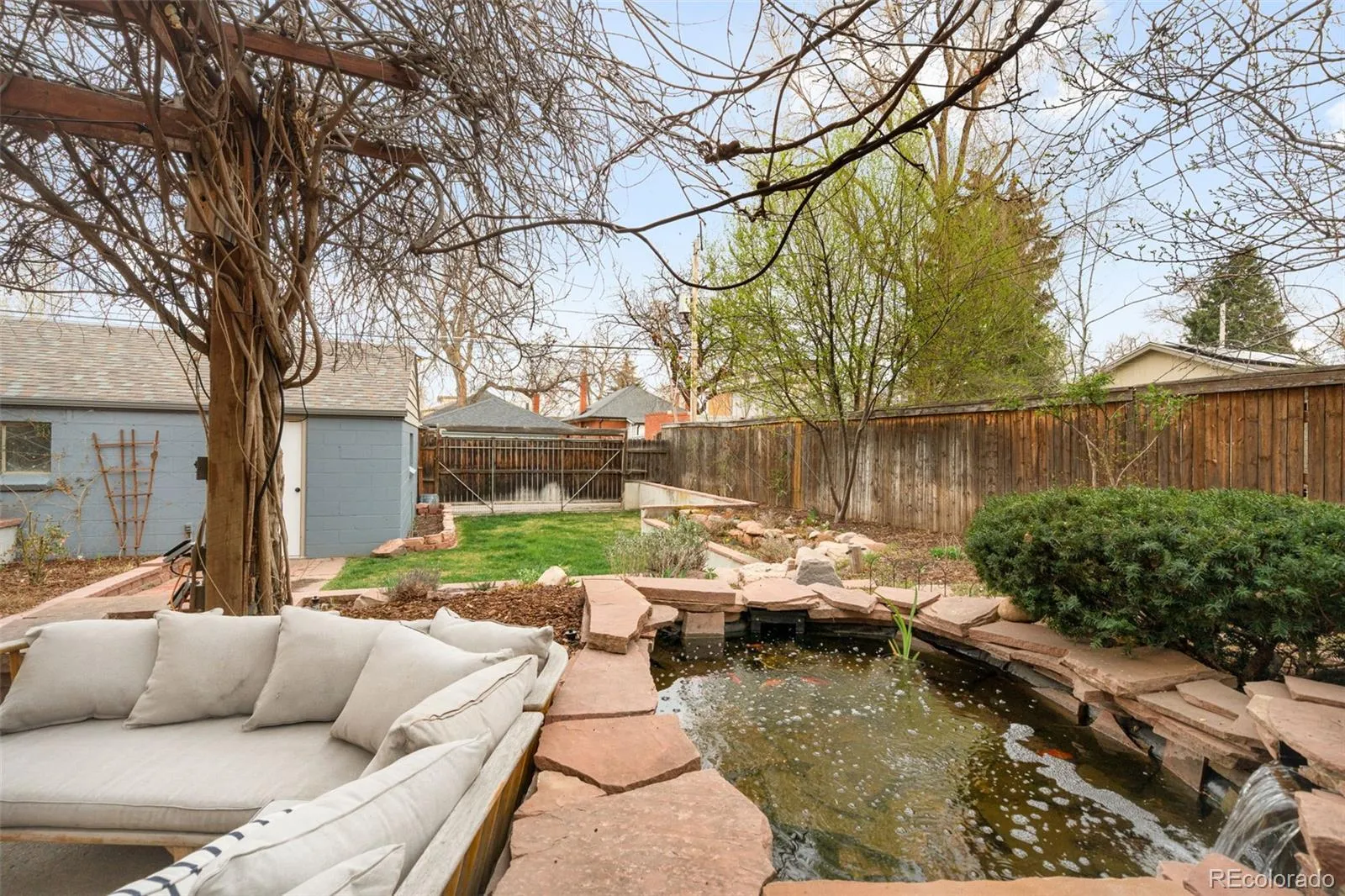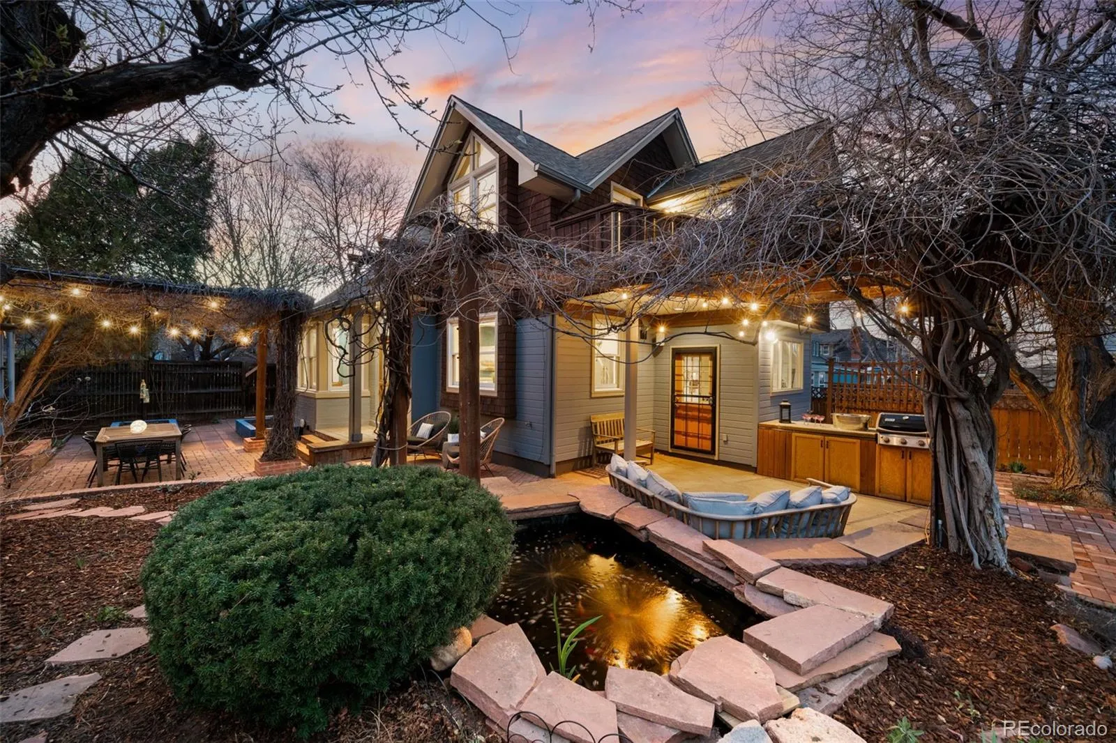Your search for a lush, 2-story oasis in the Highlands ends here. Steeped in an enviable locale 1 block from Tennyson on a quiet street, this Victorian residence is defined by its open floorplan, historic charm & chic updates. Stunning curb appeal invites residents up the Arbor & past the fenced front yard to the sprawling, covered front porch with a custom swing. Arched doorways, hardwood floors, a gas fireplace, skylights and a bay window w/ bench seating are some of the small details that make this house a home. Entertain in the sunlight-drenched & recently updated kitchen that showcases shaker cabinets, slab countertops, new tile, a gas range, bar seating and ample storage. The adjacent dining space is beaming with natural light with 16+ foot ceilings, patio access and comfortably seats 8+. A spacious bedroom, two large closets and a designer full bath round out the perfect floorplan. Indoor/outdoor connectivity is paramount and the kitchen connects directly to the back patio on two sides. The outdoor space is an enchanting oasis. It is a true entertainer’s and gardener’s dream with multiple seating & dining areas including 2 pergolas with wisteria & virginia creeper to create a storybook garden. Enjoy bistro lighting, a built-in grill, a water feature, firepit area and a thriving koi pond. The fully-fenced yard has professional landscaping from front to back and side to side. Back inside the home, retreat to the second level featuring a primary that showcases vaulted ceilings, 2 custom closets, skylights, a bonus room perfect for an office/nursery + a private deck overlooking the yard. The newly full bath is a showstopper & an additional bedroom presents chic styling, wallpaper & designer lighting. Revel in the convenience of a finished basement that hosts a secondary living or flex space & storage galore. Enjoy easy living on a quiet street w/ an oversized two-car garage, automatic irrigation + drip system, mature trees, newer roof & new A/C + furnace.