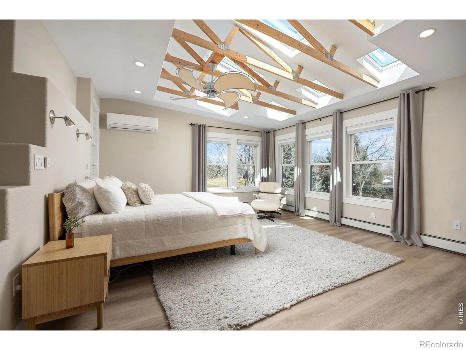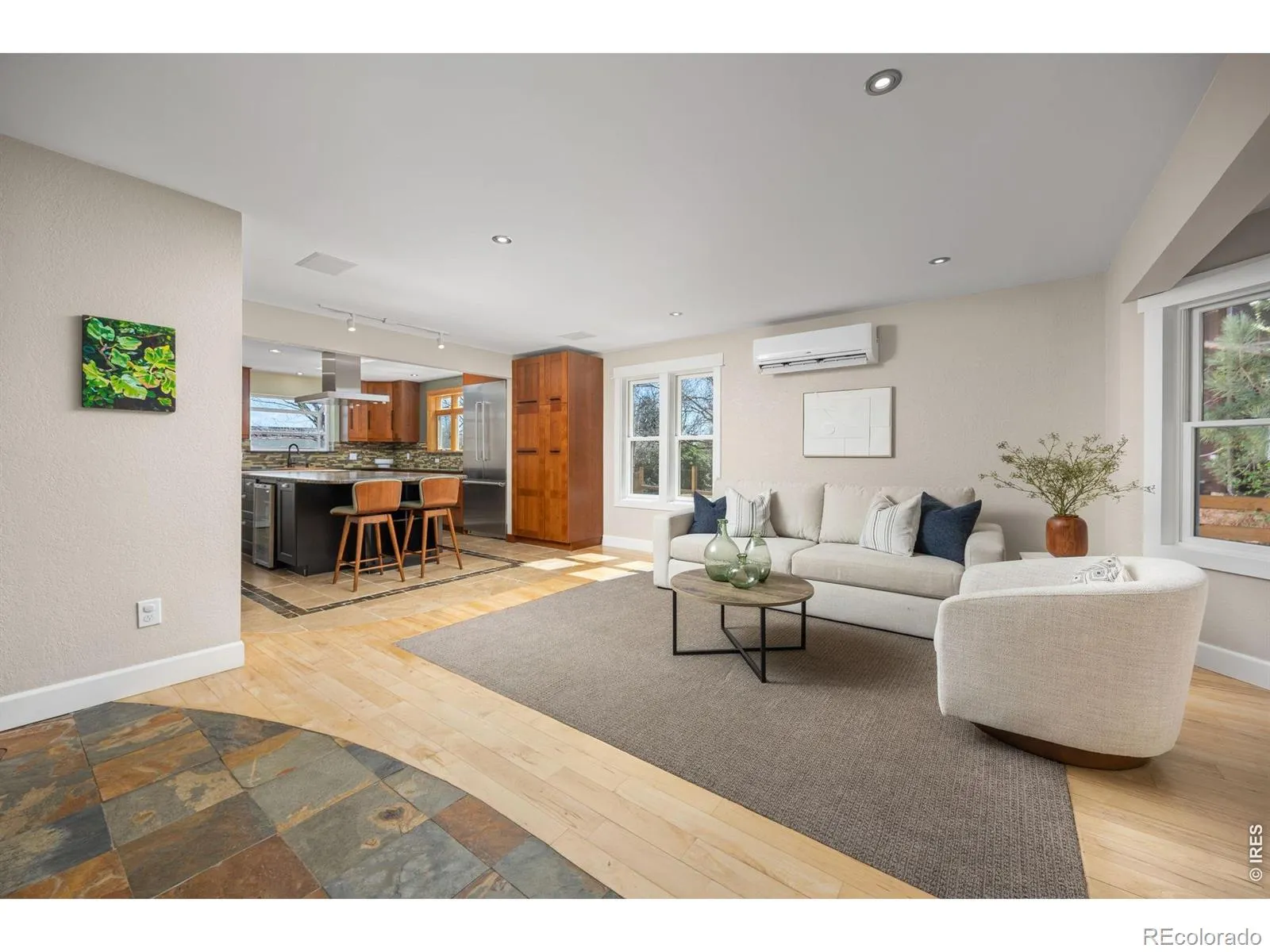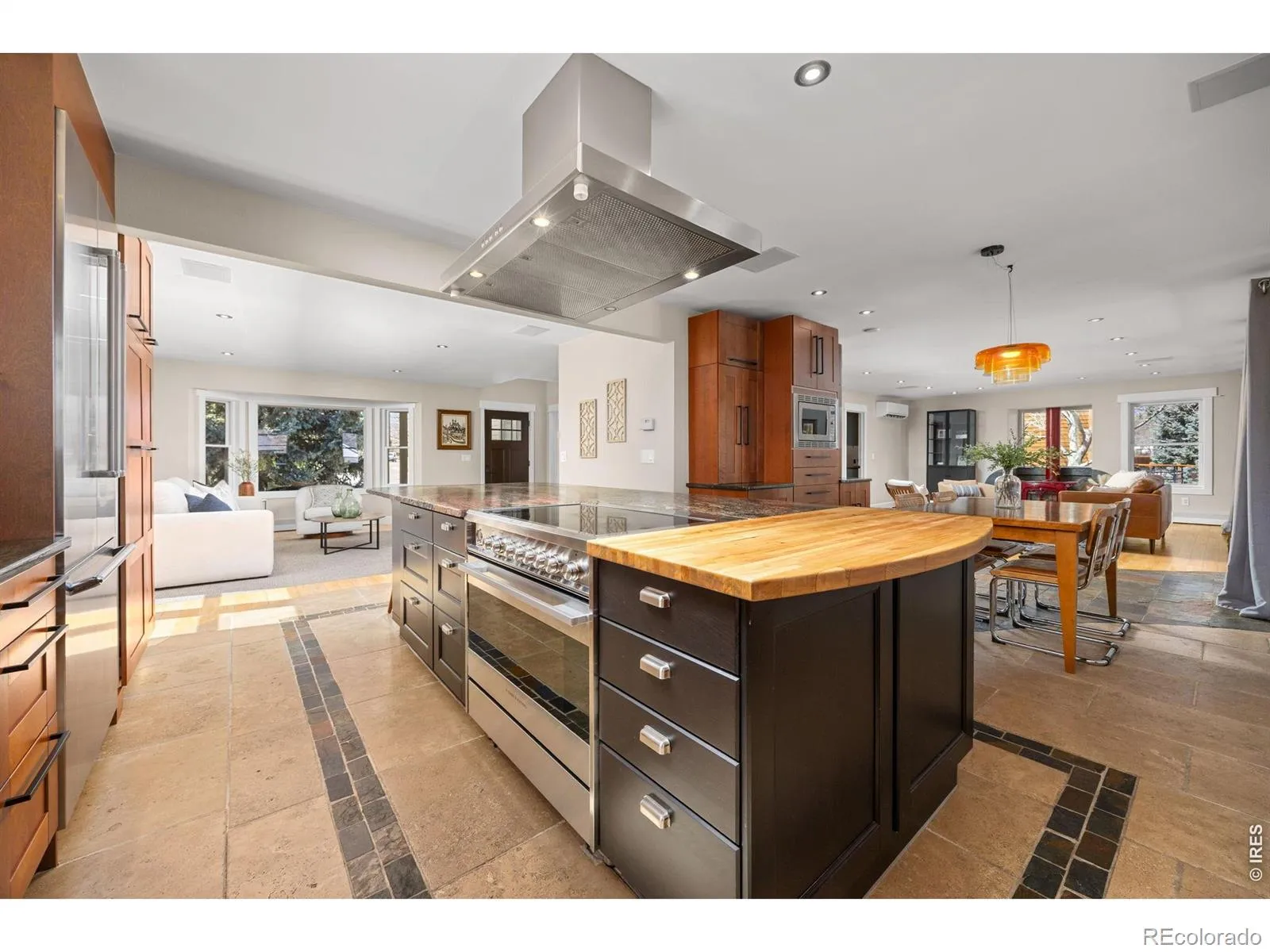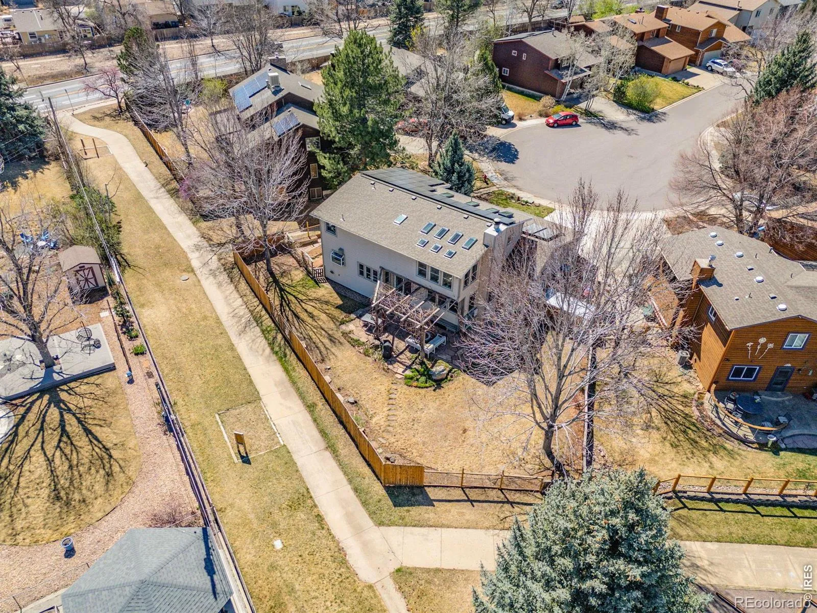 Backing to open space at the end of a quiet cul-de-sac, this light-filled, energy-efficient 5-bed, 4-bath home offers direct access to a neighborhood pocket park and path system connecting to Downtown Louisville’s Community Park, Coal Creek Trail, and Warembourg Open Space & Fishing Pond. Bay windows in the front living room overlook the covered front porch and cul-de-sac. The gourmet kitchen & dining area open to both the living room & a spacious family room. Rich wood shaker-style cabinetry is featured in the kitchen along with a copper basin sink, large granite center island with seating, Thermador SS appliances, a Fisher & Paykel 36″ induction range w/ hood & a dedicated beverage fridge. Just beyond, the expansive family room is centered around a Vermont Castings wood-burning stove & filled with windows overlooking the back patio & open-space path. Quality craftsmanship includes solid alder doors, hardwood & slate tiled flooring on the main level & vinyl plank flooring upstairs. Energy-efficient upgrades include 17 skylights, Philips Hue smart lighting, 8 mini-split heat pump units, Navien Combi boiler & 6 kW owned solar PV system. The main level also offers a bright home office plus a laundry/mudroom with access to the oversized 2-car garage wired w/ a 50-amp EV charger. Upstairs, the spacious primary suite features vaulted wood-beamed ceilings, skylights with remote blackout shades, a large walk-in closet, and a luxurious en-suite bath with oversized steam shower & a copper freestanding soaking tub. 2 addl bedrooms and a full bath complete the upper level. The finished basement includes a media/recreation room with blackout shades, 2 addl bedrooms, a 3/4 bath, extra storage room, and an adorable custom under-the-stairs play nook. Enjoy indoor-outdoor living from the backyard’s flagstone patio, a south-facing garden, and on the north side of the garage, a gated concrete workspace or extra parking area. Just a 10-minute level walk to Old Town Louisville!