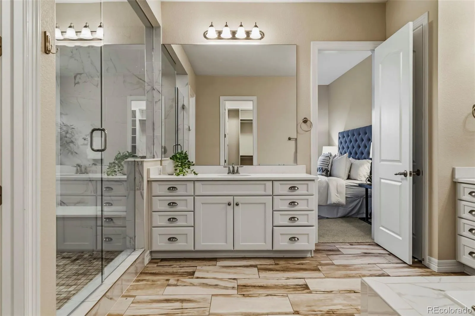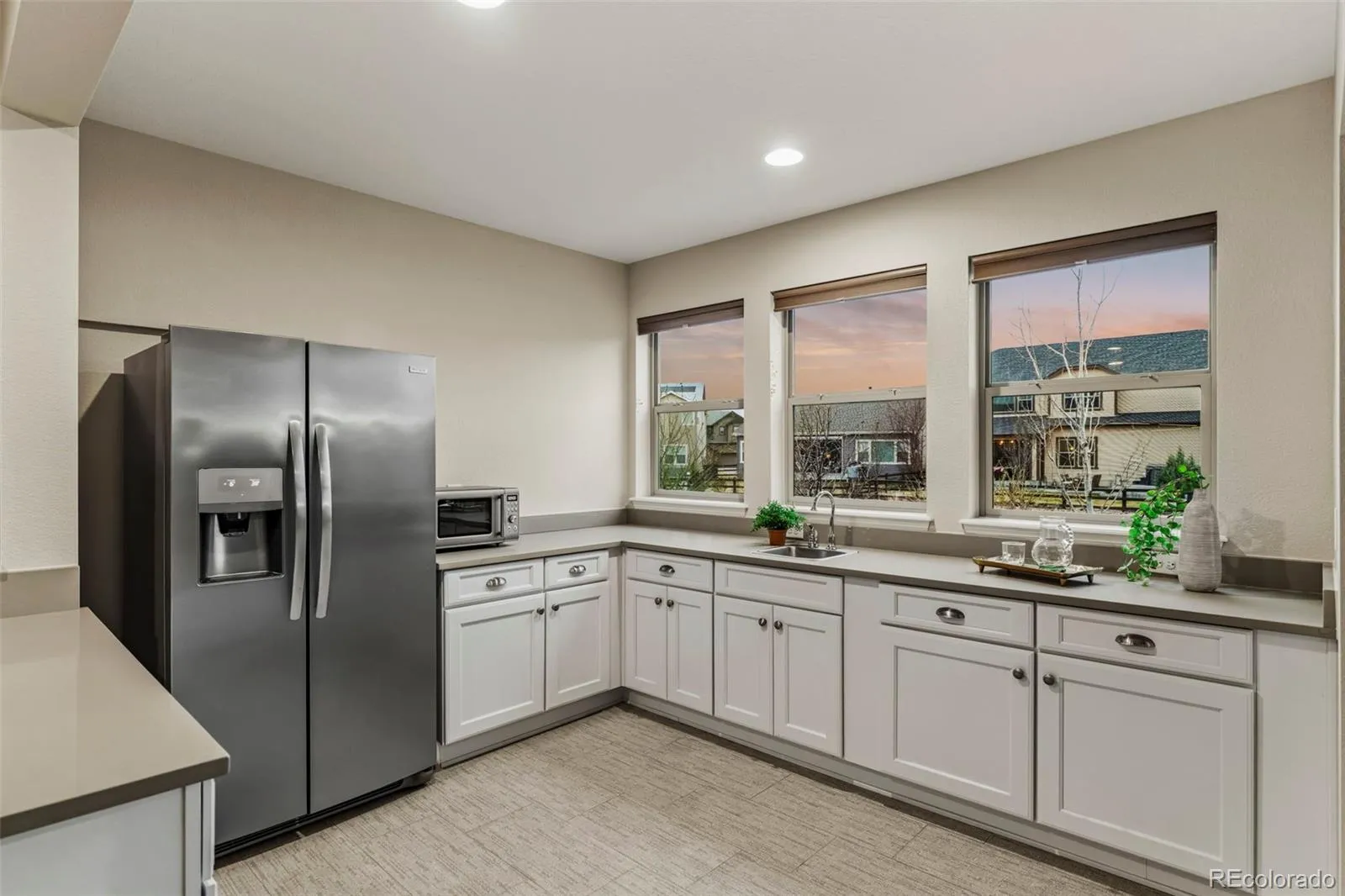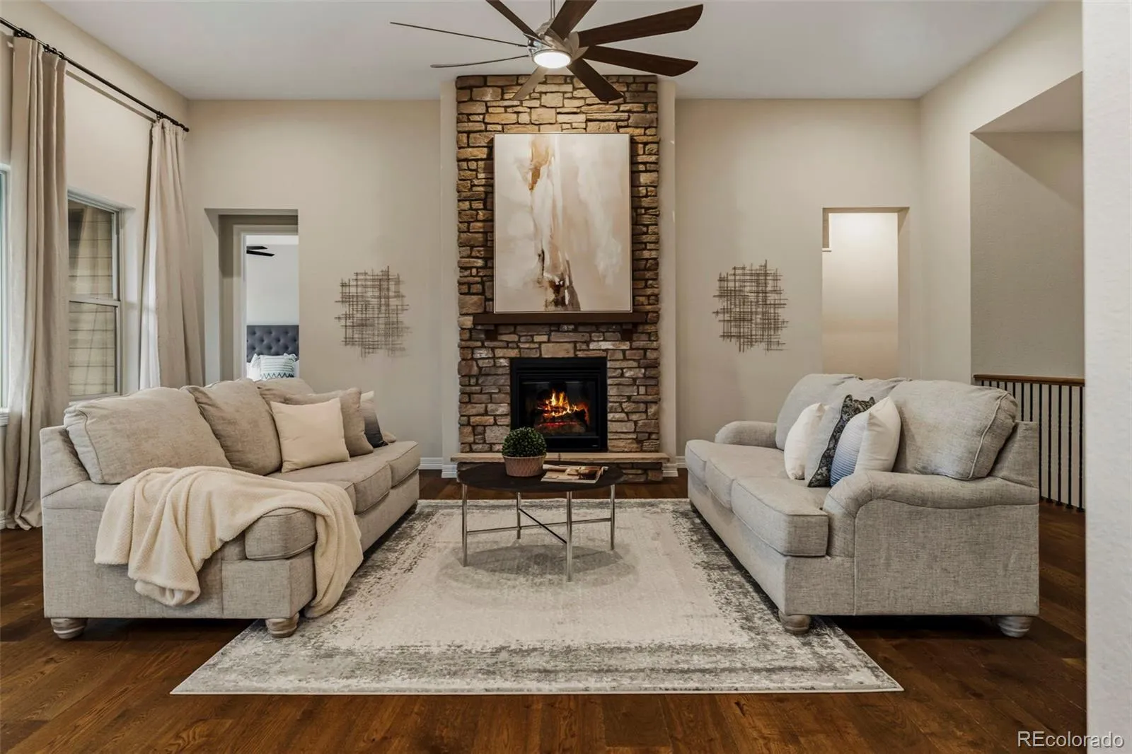 Meticulously maintained and truly turnkey, this exceptional 3 bedroom, 4 bathroom ranch-style home offers a fully finished walkout basement, main floor study, and rare true side-by-side 3-car garage, all ideally situated in a quiet cul-de-sac backing to dedicated open space. The elegant main level features hardwood floors, 8-foot doors, abundant natural light, and a beautifully appointed gourmet kitchen with large center island, quartz countertops, 42-inch Cascade white cabinetry, double convection ovens, Bosch induction cooktop with stainless steel hood, Frigid-Air French door refrigerator with freezer drawer, walk-in pantry, and spacious dining area. The inviting family room showcases 12-foot ceilings, expansive windows, and a gas fireplace. Step outside to the covered Colorado Room and enjoy peaceful open space and Reuter-Hess Incline views, with stairs leading to the professionally landscaped, fully fenced backyard. The private primary suite is a luxurious retreat with stunning views, a fully remodeled 5-piece bath with soaking tub, dual quartz vanities, seamless glass shower with custom tile, rain shower head and bench, and a generous 7×12 walk-in closet with California Closet organizers. A secondary main floor guest suite with adjacent full bath, private study with glass French doors, and mud/laundry room complete the main level. The finished walkout basement is ideal for entertaining with a spacious great room/game room, wet bar or mother-in-law kitchen with full-size stainless-steel refrigerator, quartz counters, Cascade white cabinets, and utility sink, plus walkout access to a covered patio and large concrete pad. An additional guest suite with walk-in closet and adjacent 3/4 bath offers flexibility, while the expansive storage/utility room provides future finish potential. Just steps from the East/West Trail, Reuter-Hess Reservoir, recreation, and the Challenge Incline, with easy access to I-25, downtown Parker, DTC, and DIA.