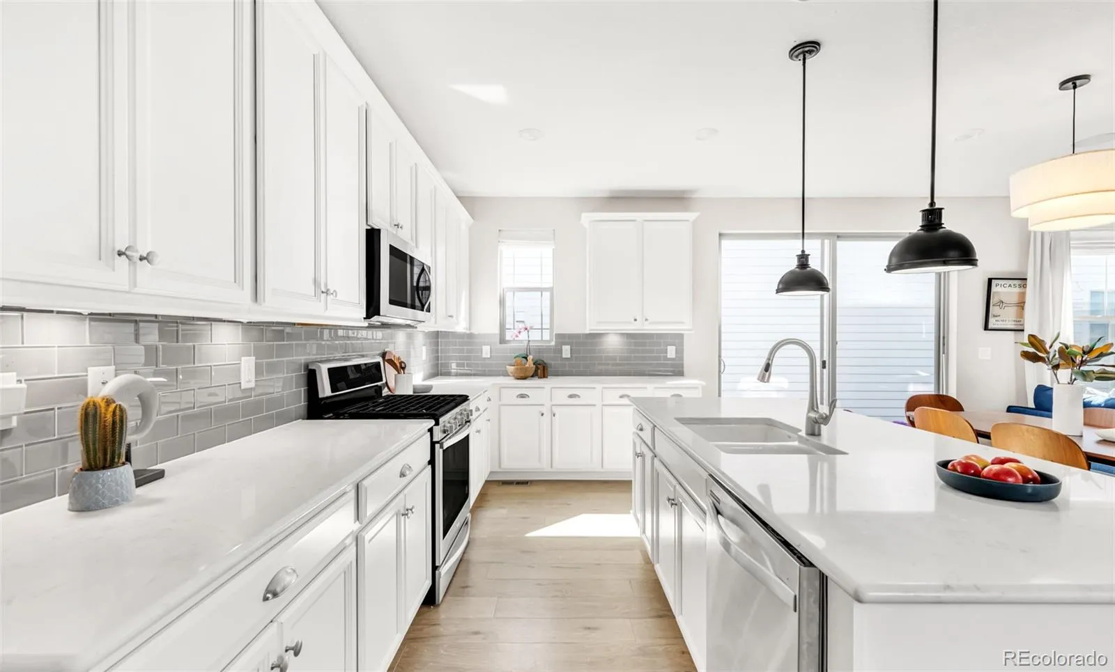 *OPEN HOUSE Saturday March 28 from 2pm-4pm* Welcome to your upgraded former model home nestled in a dreamy courtyard! Inside, beautiful engineered hardwood floors greet you with an open-concept layout that flows seamlessly between the kitchen, dining + living spaces. With over 3,200 square feet of living space, there’s plenty of room for everyone. Work from home effortlessly in the bright main-floor office, complete with French doors for privacy. The chef’s dream kitchen shines with crisp white cabinetry, grey tile backsplash, Quartz counters, plus an expansive island providing ample space for meal prep & entertaining. Upstairs, the primary suite is your personal retreat, boasting double walk-in closets and a spa-inspired bathroom with double vanities + oversized soaking tub. Two generously sized bedrooms with walk-in closets share a full hallway bath featuring custom tile. Downstairs the basement is an entertainer’s paradise, featuring 9-ft ceilings, a custom theater with movie screen + theater lighting, a wet bar with custom cabinetry, and a versatile bonus area. Rounding out the basement is a spacious 4th bedroom + a modern full bathroom providing flexible space for family/guests. New roof with Class 4 shingles in Sept 2024. Enjoy the private side yard featuring a paver patio, raised garden beds, & plenty of space for an outdoor trampoline. The dreamy courtyard multiplies your outdoor space, with the added benefit that the HOA maintains the landscaping in the summer & takes care of snow removal in the winter. This is the perfect turnkey property for buyers! The BEST location: just a 10min walk to Northfield & DSST High Schools, 5min bike ride to Inspire Elementary & Denver Green School, and an 8min stroll to Pearl Market & Carmella’s. Enjoy easy access to parks, miles of scenic trails, and a quick commute to DIA, Anschutz Medical Campus, & downtown Denver.