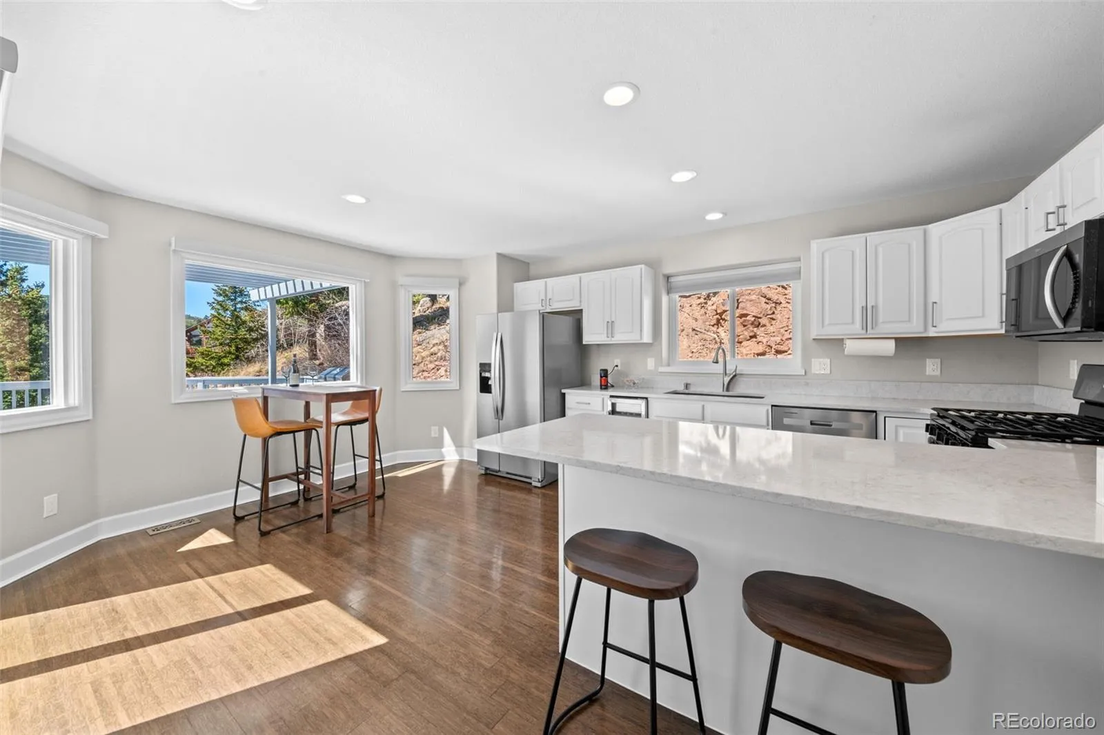 Private Evergreen Retreat with Stunning Mountain Views. Mountain views from every window, a spacious deck, and extensive modern upgrades make this move-in ready home the perfect Colorado escape. Set on 1.12 private acres, this beautifully updated 3 bed, 3 bath retreat blends privacy, natural beauty, and modern comfort. The bright, open main level features refinished bamboo flooring and expansive windows that capture amazing views, while the oversized primary suite offers a cozy gas fireplace, walk-in closet, and spa-inspired bath with steam shower. The updated kitchen shines with quartz countertops, brand-new stainless appliances, pantry, breakfast nook, and bar seating. Step outside to the expansive deck with a dedicated gas line, ideal for entertaining or relaxing while taking in the views. A second ensuite bedroom with double doors and walk-in closet works perfectly as a guest suite or home office, while the walk-out lower level includes a media family room with exterior access, a third bedroom with a large closet, a three-quarter bath, and generous storage. Buyers will also appreciate the 300 sq.ft. heated basement, perfect for secure storage or a flexible home office. Recent upgrades include a new furnace, energy-efficient windows, and custom solar shades, with fresh interior and exterior paint for a crisp, move-in ready feel. Additional features include a radon mitigation system, whole-house surge protection, Wi-Fi thermostat, and washer and dryer. Enjoy county maintained roads for easy commuting into Golden and Denver, high-speed internet with Comcast or Starlink for seamless Zoom calls appealing to today’s work-from-home lifestyles, a paved south-facing driveway, oversized 2-car garage, extra parking, and easy year-round access just 35 minutes to Denver, 13 minutes to Evergreen amenities, and approximately one hour to DIA, with trails and National Forest access just minutes away. Enjoy breathtaking views and move-in ready Colorado living at its best.