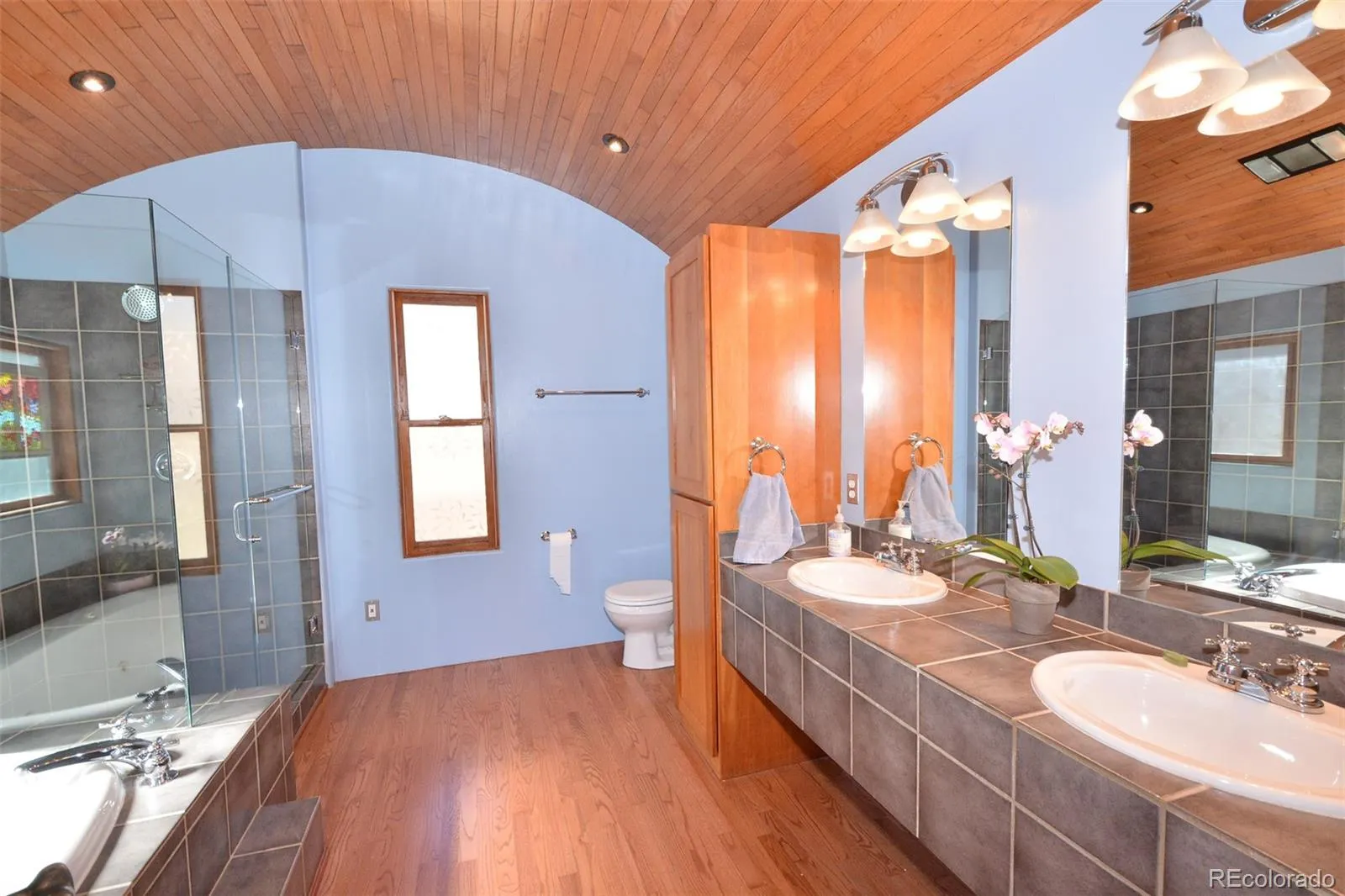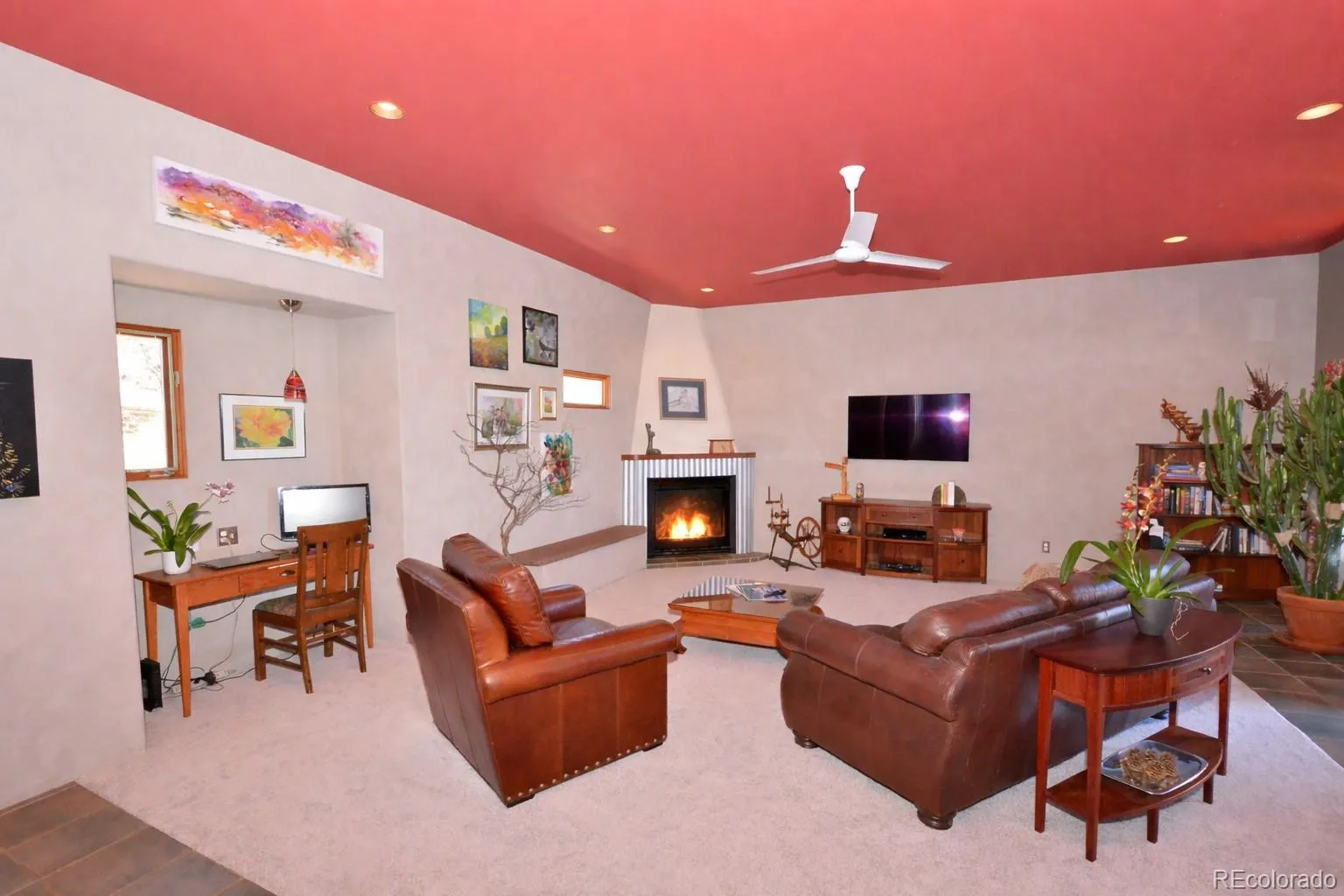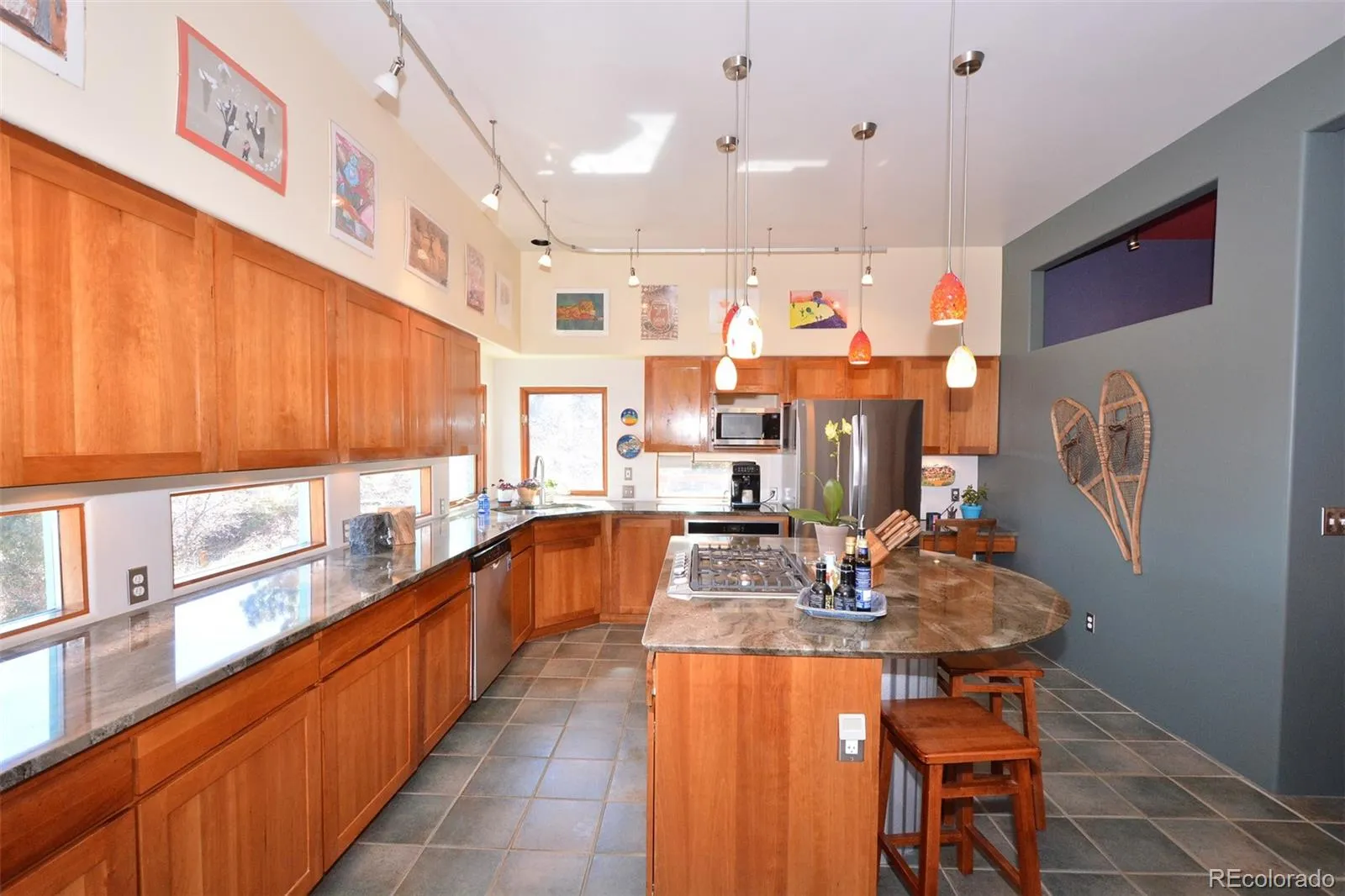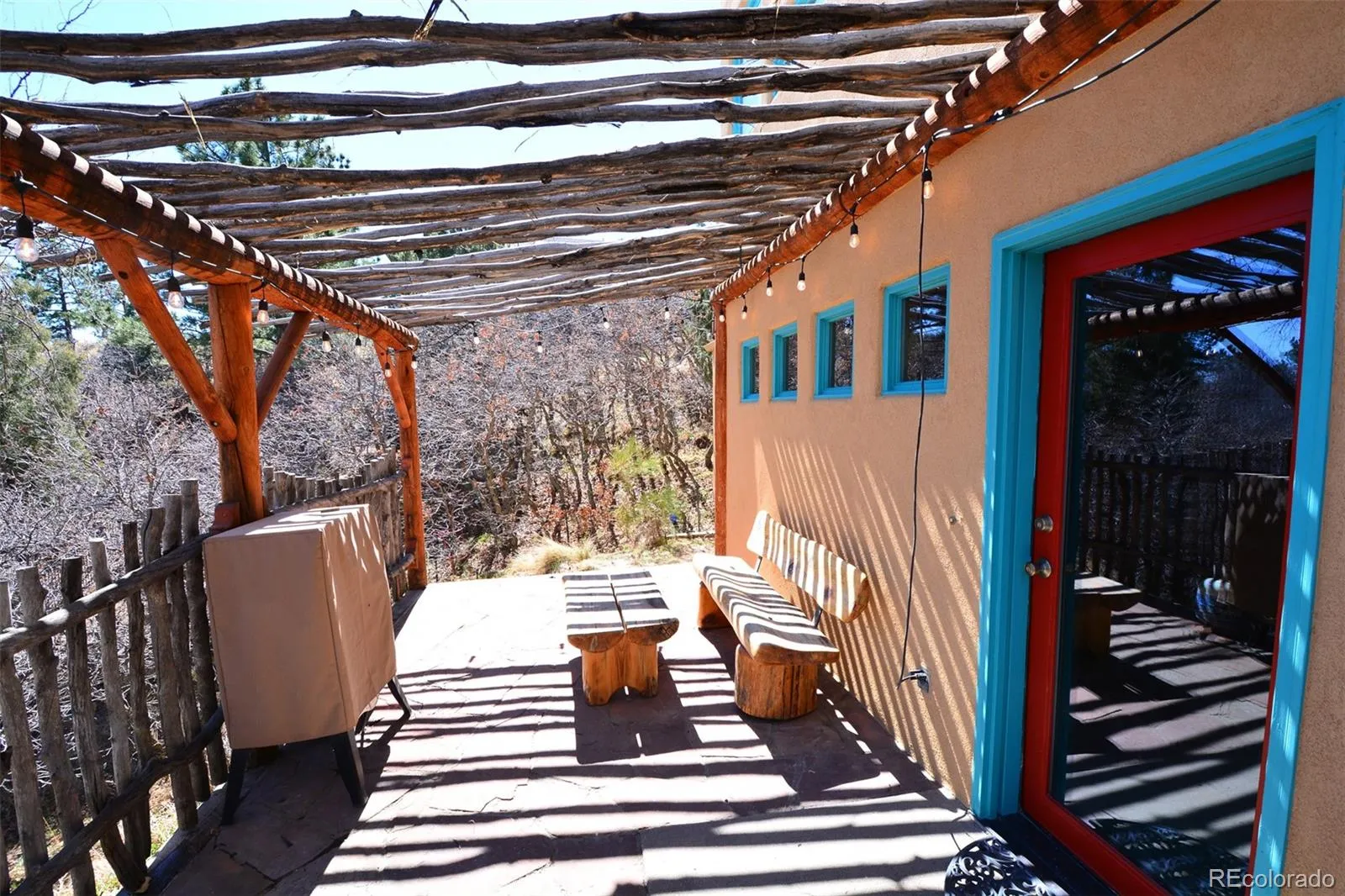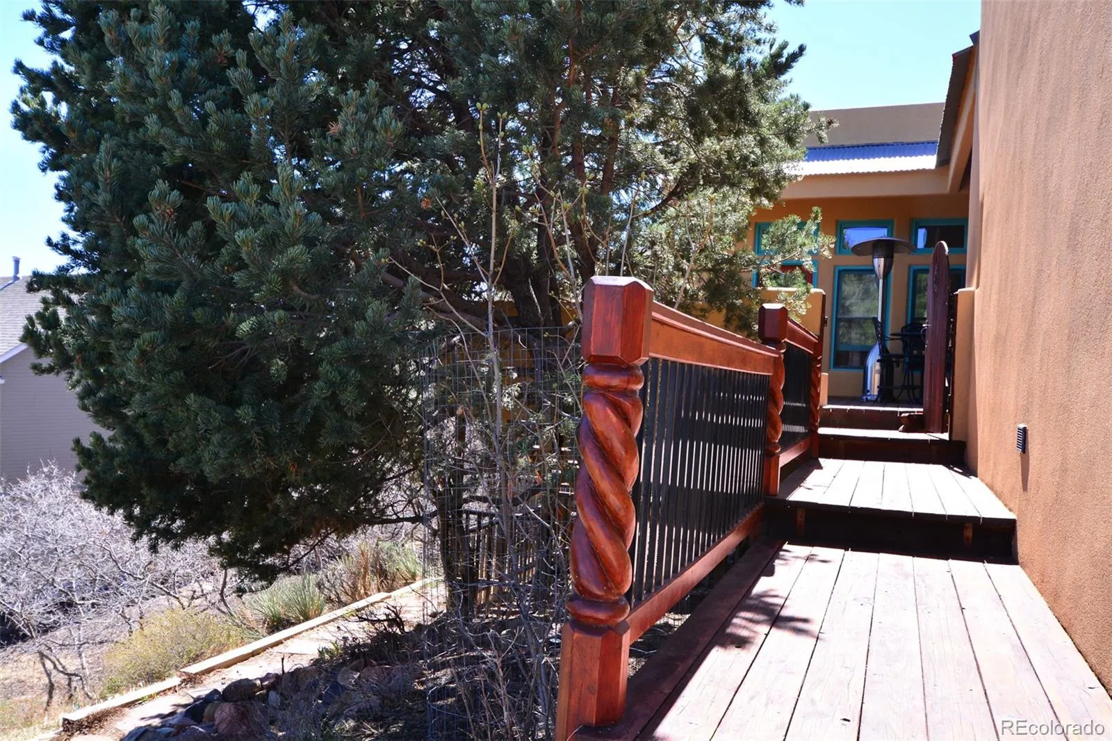 Nestled in the highly desirable upper Rockrimmon area of Colorado Springs, this stunning custom home offers exceptional indoor-outdoor living with breathtaking city views. The open floor plan features 9-foot ceilings, solid wood doors, custom paint, and abundant natural light. The living room showcases a wall of windows, built-in shelving, and a cozy gas fireplace, flowing seamlessly into the dining area with walkout access to an expansive deck—perfect for enjoying city lights. The beautifully updated kitchen includes custom cherry cabinets, granite countertops, new refrigerator, oven, and gas cooktop, along with elegant Murano glass pendant lighting. A large 16×18 deck with custom wood railings extends the living space outdoors. The main-level primary suite offers a private retreat with its own deck, a wall of windows, and a luxurious bath featuring a barrel wood ceiling, jetted tub, and spacious shower with bench. The lower-level family room provides additional living space with walkout access to a private pergola-covered deck, ideal for entertaining or relaxing. Additional features include built-in cabinetry throughout, a main-level laundry room, custom Murano lighting in the powder room, new carpet on the main level, newer roof, and new stucco. The beautifully landscaped yard features award-winning xeriscaping, a water feature, and mature trees that provide privacy on a large lot. This one-of-a-kind property combines quality craftsmanship, thoughtful design, and an unbeatable location!