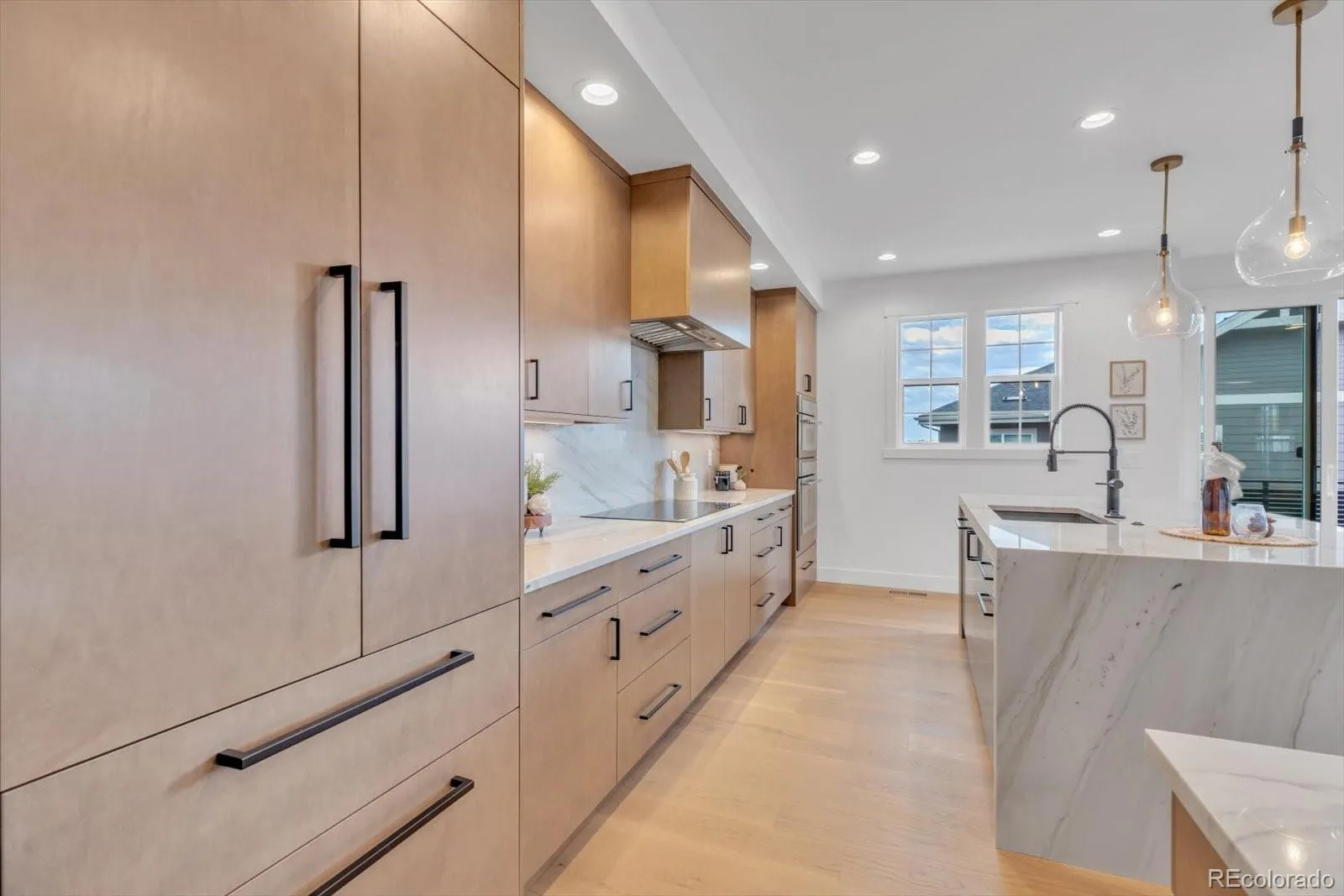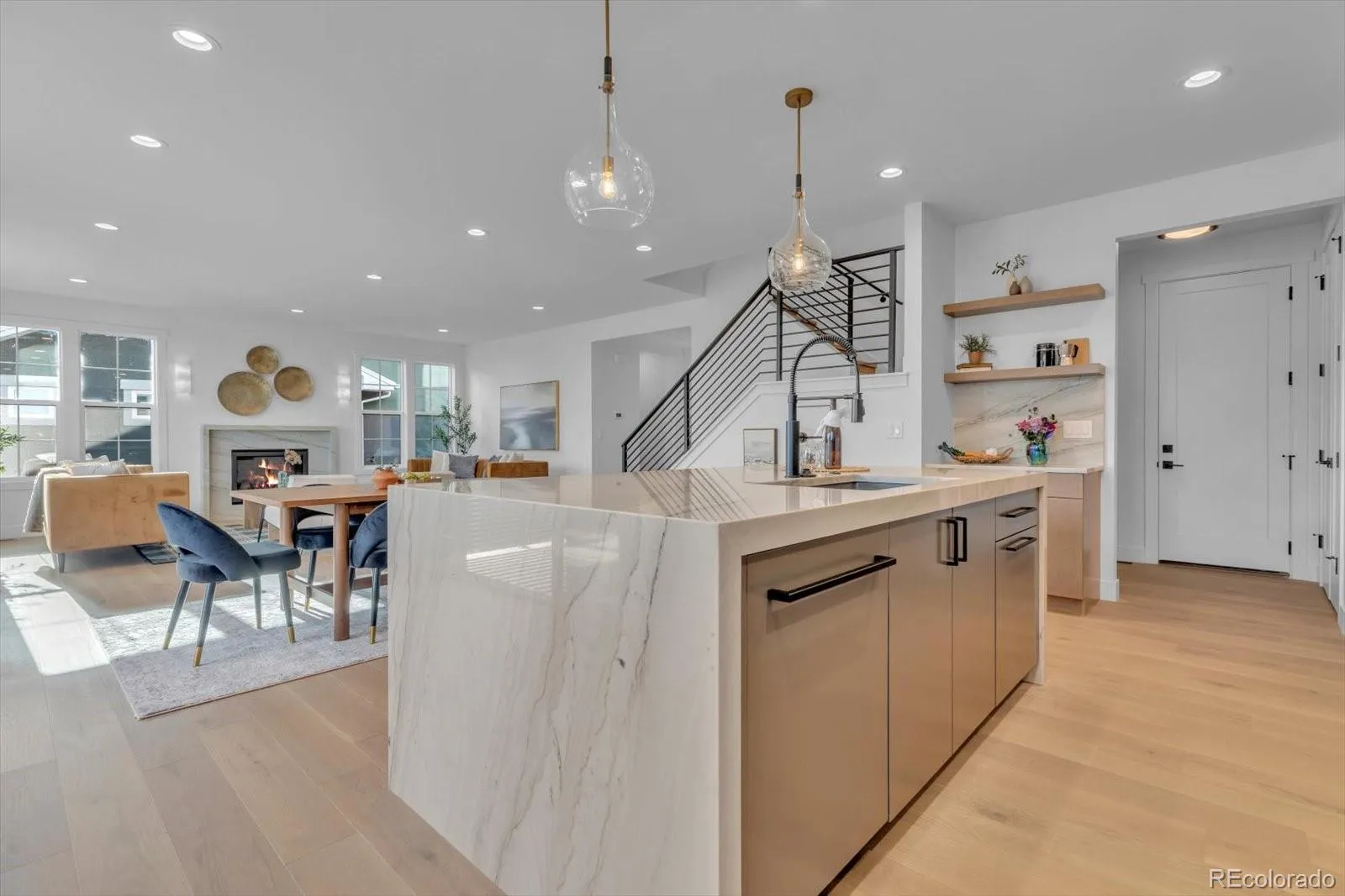 The kitchen is a showpiece. Featuring a dramatic waterfall-edge island with the stone continuing seamlessly up the backsplash — a rare, high-end design choice that feels both sculptural and timeless. This space anchors the home, flowing naturally into the dining & living rooms and extending outdoors to a large deck just off the dining area, creating a beautiful indoor/outdoor rhythm.