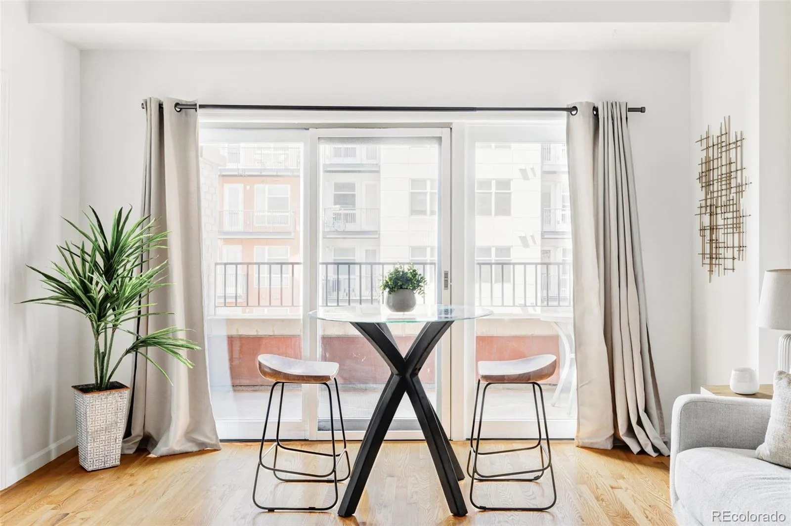 Updated 2-bedroom, 1-bathroom condo at the Tower on the Park in Uptown. 844 sq ft with floor-to-ceiling windows, fresh paint, new lighting, and updated stainless steel appliances with tile backsplash. Open-concept living and dining area flows to a covered west-facing balcony with city views. Main bedroom with walk-in closet. Building amenities include fitness center, elevator, bike storage, and secure entry. Two garage parking spaces included – a rare feature at this price point. Nearby transit within 0.1 mi, including several bus stops. 170 ft to Coperta, 429 ft to Las Delicias Uptown, 312 ft to Benedict Fountain Park, and 0.1 mi to Fluid Coffee Bar. Easy access to nearby shops, restaurants, and downtown Denver. HOA covers building maintenance and amenities. Covered west-facing balcony with city views, two garage parking spaces, and walk-in closet.