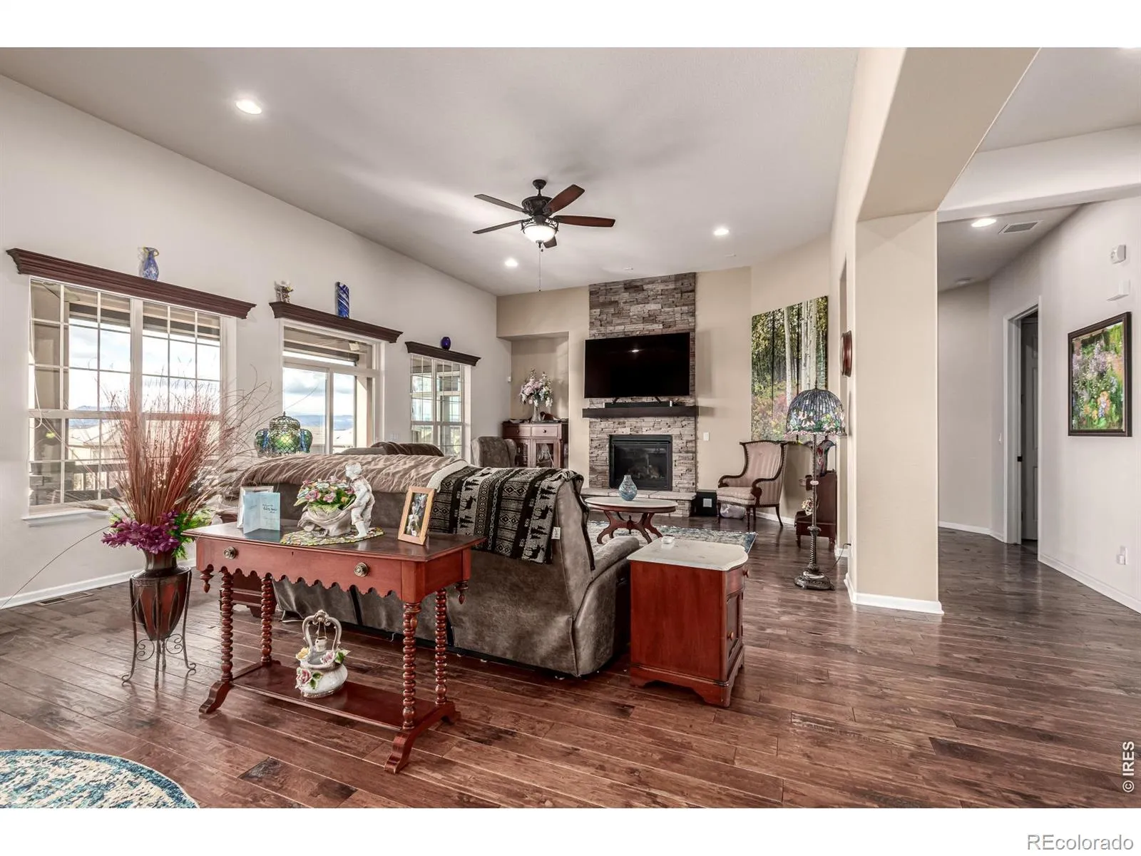 Rare opportunity to own a sought after Toll Brothers Montana Model – a spacious ranch layout with walk out basement on corner view lot! Located in Anthem Ranch 55 plus community with an amazing community center, fitness center and pool complex. This remarkable 3-bedroom, 4-bath home showcases the largest main-floor layout and offers exceptional design, craftsmanship, and livability. Step inside to find rich hardwood flooring, spacious rooms with tall beamed ceilings, and abundant natural light throughout. The gourmet kitchen impresses with a large center granite island featuring upgraded solid wood cabinetry with soft-close drawers, rollouts, a premium vent hood, and high- end stainless appliances – all included along with the island stools. Enjoy casual meals in the sunny eat-in nook or host gatherings in the formal dining room. The spacious family room, accented by wood beams and upgraded lighting, opens to a covered deck that offers panoramic mountain views. The luxurious main-floor primary suite and convenient main-level office make everyday living effortless. The finished walkout basement offers you the opportunity to customize to your needs and features a huge recreation and game area or family area, two large bedrooms, bath with walk in shower and a generous storage space. Additional highlights include a structural basement floor, large 3-car garage, xeriscaped front yard, stamped concrete walkway, upgraded window coverings and drapes, and a full laundry area with washer, dryer and utility sink. Outside you have a fully landscaped yard with turf for true maintenance free lawn. Premier 55 plus community with rec center, walking trails and ponds. Its like living in a resort, easy commute to Boulder, Erie or Denver.