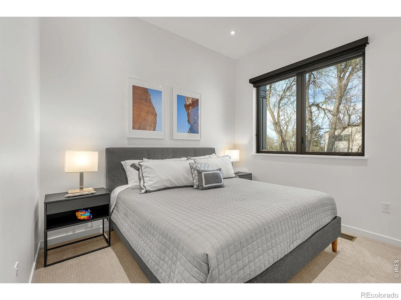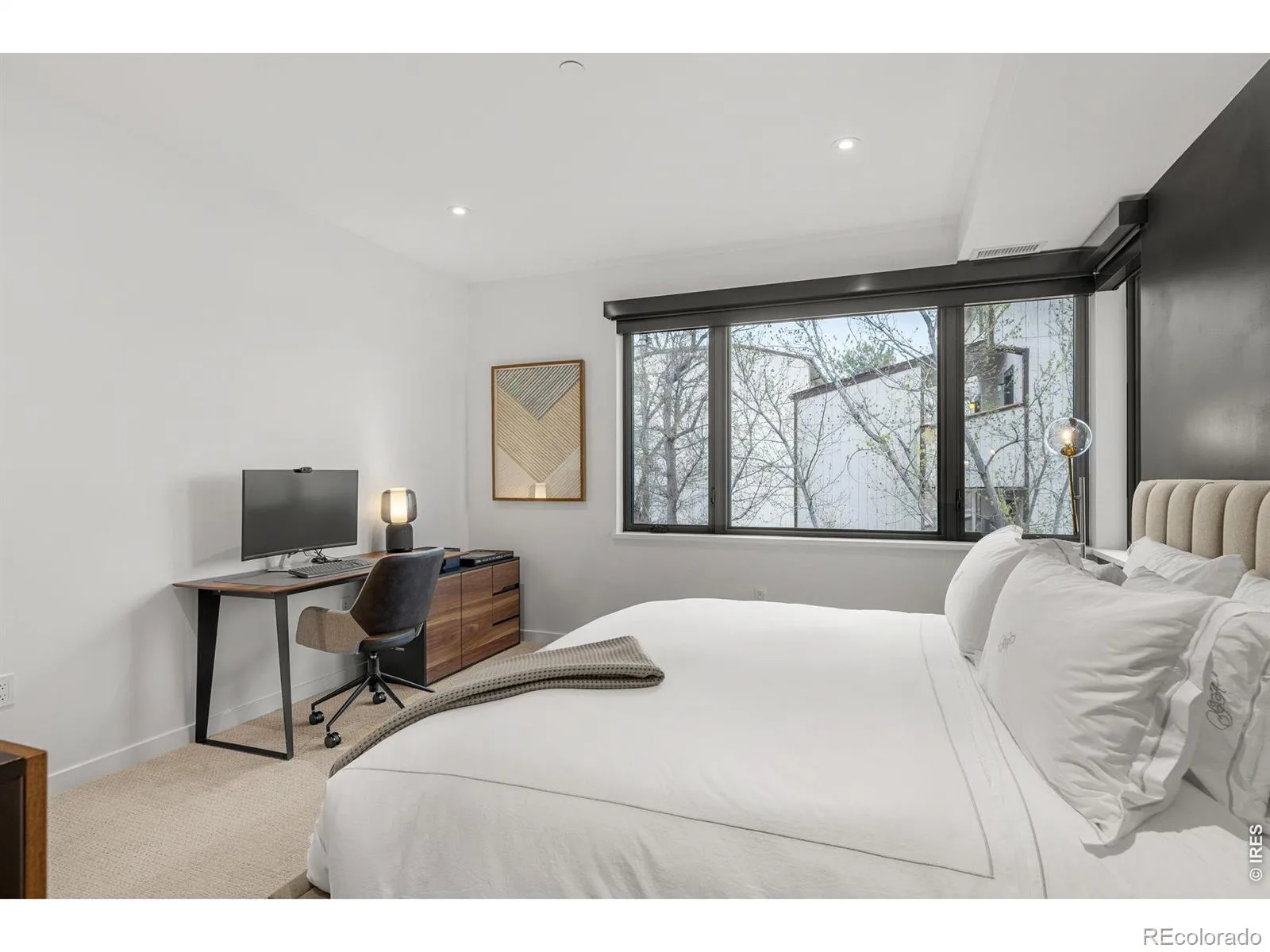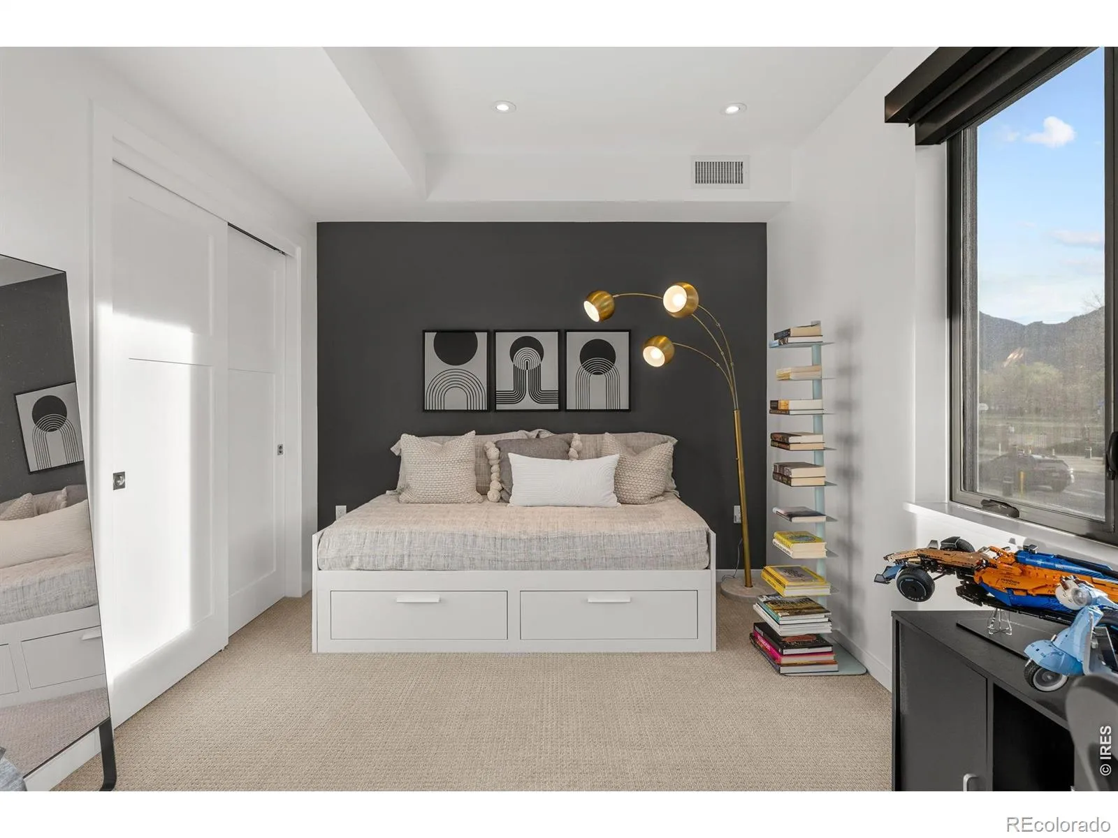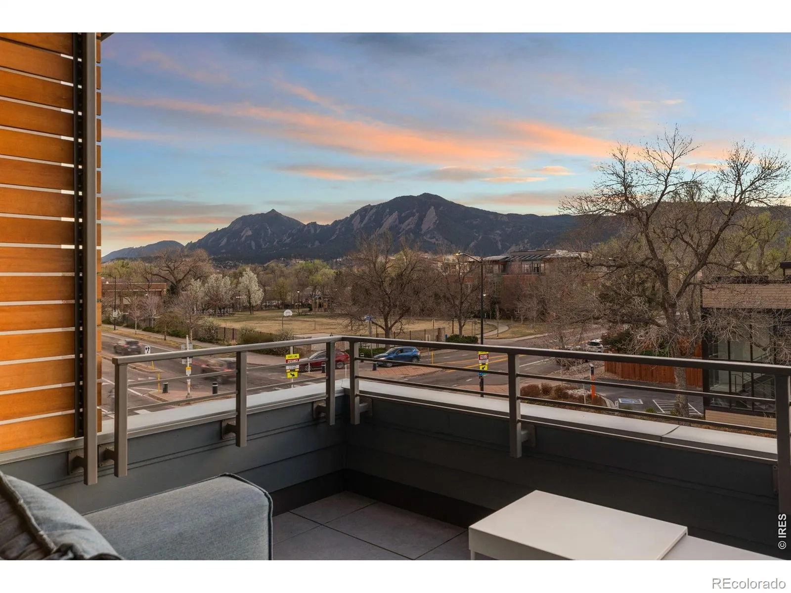 Experience the pinnacle of modern Boulder living in this exceptional, low-maintenance dwelling, where architectural sophistication meets unobstructed Front Range views. Part of the exclusive Flatiron Vista collection, this home lives like a single-family residence, featuring a private entrance, forecourt gardens, & a striking facade of cedar, metal, & stucco. Inside, walls of windows bathe the open-concept floor plan in natural light, seamlessly connecting the chef’s kitchen to the spacious living & dining areas. The interior has been thoughtfully elevated with high-end designer touches, including a custom floating media console with integrated lighting & a 75-inch framed TV with concealed wiring for a sleek, gallery-like aesthetic. The living experience spans three meticulously planned levels, each with designated outdoor space. Smart home technology manages the convenience of custom motorized shades throughout, alongside Kasa smart lighting & a comprehensive Ring security suite. The primary suite is a luxurious haven, boasting a spa-inspired bathroom & an expansive walk-in closet with custom organization & soft-close cabinetry. Two secondary bedrooms feature premium Elfa shelving complimented by the high-performance LG steam laundry center. Entertainment reaches new heights in the top-floor family room and its adjacent jaw-dropping rooftop terrace. Complete with a wet bar, floating shelving, & natural gas connection, this space is perfectly equipped for sunset grilling or cozy evenings against the backdrop of the iconic Flatirons. Extra storage & a private, detached garage showcasing an electric car lift for 2-car garage parking downtown add to the convenience and functionality of the modern design. The phenomenal central location is walking distance to the Google campus, Pearl Street Mall, & staples like Whole Foods & Target, with growing, vibrant surroundings. This home offers an unparalleled urban lifestyle with the quiet luxury of a private retreat.