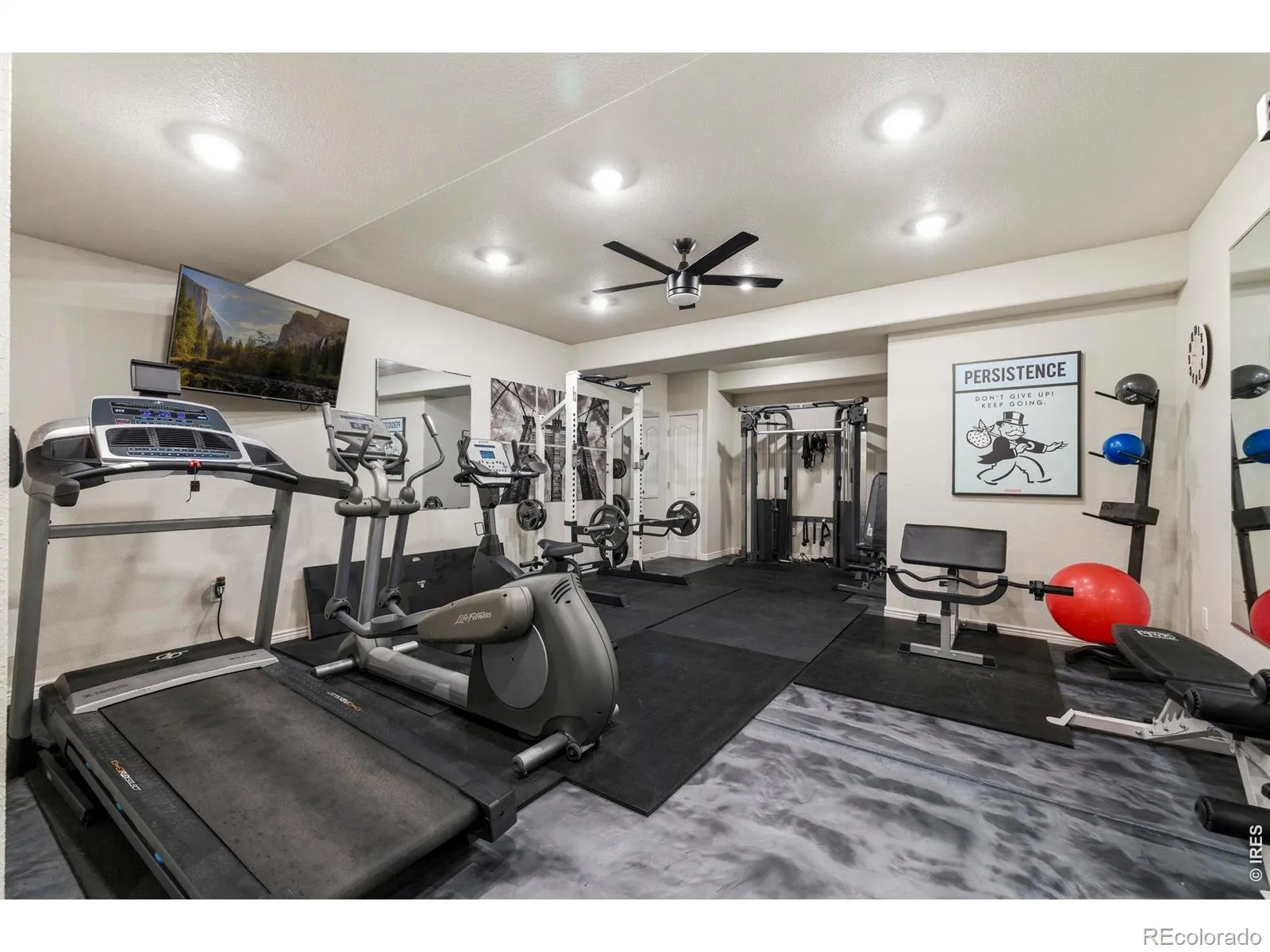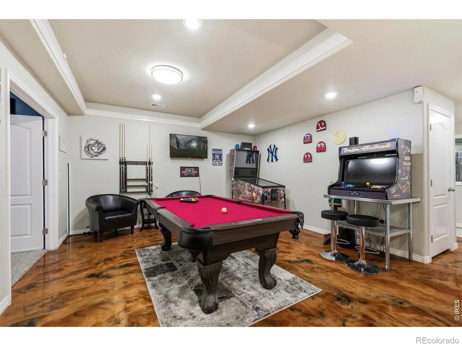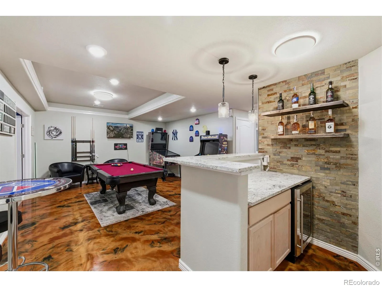 Welcome to sought after Providence community. Built by Lennar, this west facing ranch offers mountain views, refined finishes, and a quiet setting just steps from parks, paths, and Ute Creek Golf Course. Perfectly positioned on a serene street, the south side of the home opens to a walking path leading directly to a beautiful park just behind the property. Framed by stone accents and a warm entry, the home makes an immediate impression as natural light pours through expansive windows, highlighting the spacious foyer and thoughtful design. The casual dining area sits seamlessly between the kitchen and living room, creating an ideal flow for daily living and entertaining. The kitchen is both striking and functional with stainless steel appliances including a smart refrigerator, gas stove, dishwasher, microwave, and sleek vent hood, along with a generous walk in pantry, abundant cabinetry, and expansive granite surfaces. The oversized island is perfect for gathering and connection. The living room anchors the space with a gas fireplace and classic mantel and opens directly to the covered back porch for easy indoor outdoor living. Just off the kitchen, a private study with French doors offers a quiet workspace. The primary suite is tucked at the back of the home, overlooking the backyard and designed as a peaceful retreat with a five piece bath and customized walk in closet. Two additional bedrooms at the front share a well appointed bath, offering ideal separation. The home includes smart features, upgraded lighting, security system, and owned solar panels. 3 car garage provides flexibility, and the entry from the garage features a built in bench, cabinetry, & functional laundry space. The finished lower level offers a tinker shop, workout room, entertainment area with pool table and dry bar a dedicated theater, an additional bedroom, and a three quarter bath with oversized shower. Beautifully maintained & thoughtfully designed, this home offers comfort, style, & ease