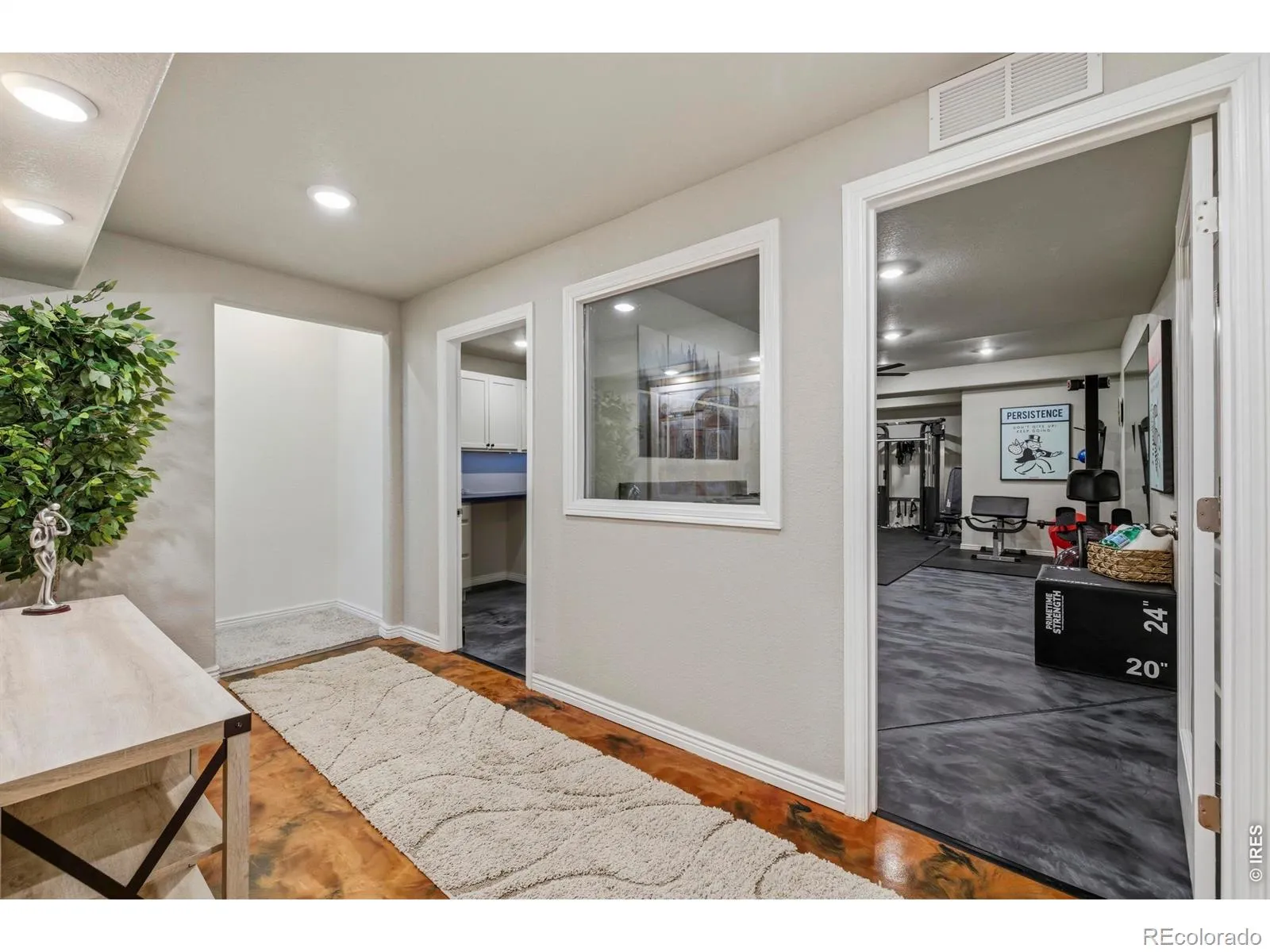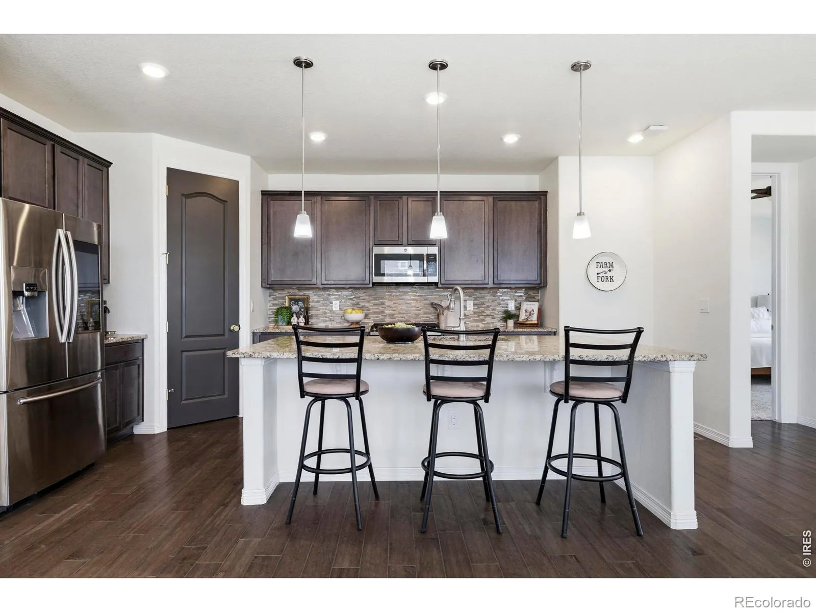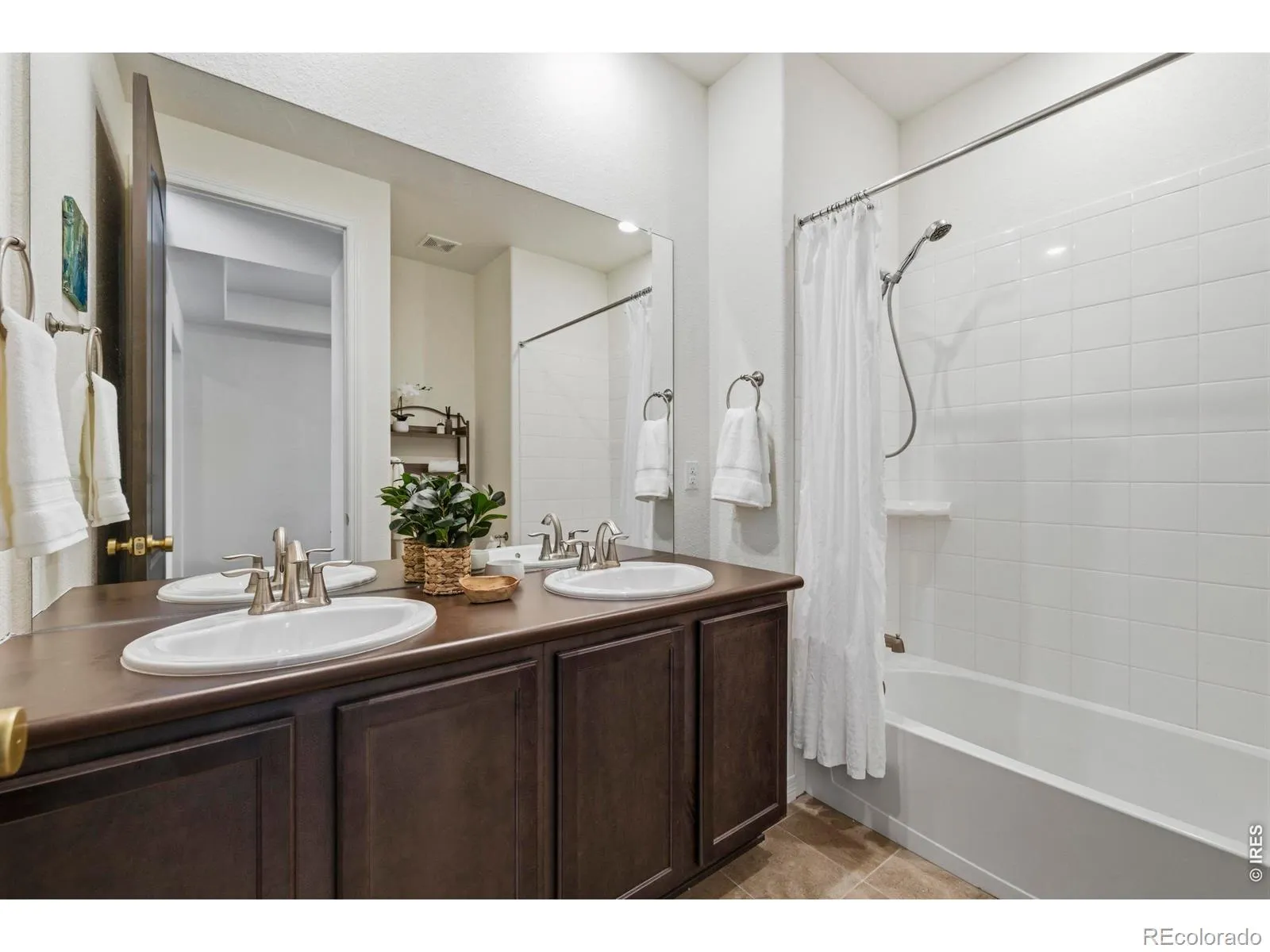 Welcome to sought after Providence community. Built by Lennar, this west facing ranch offers mountain views, refined finishes, and a quiet setting just steps from parks, paths, and Ute Creek Golf Course. Perfectly positioned on a serene street, the south side of the home opens to a walking path leading directly to a beautiful park just behind the property. Framed by stone accents and a warm entry, the home makes an immediate impression as natural light pours through expansive windows, highlighting the spacious foyer and thoughtful design. The casual dining area sits seamlessly between the kitchen and living room, creating an ideal flow for daily living and entertaining. The kitchen is both striking and functional with stainless steel appliances including a smart refrigerator, gas stove, dishwasher, microwave, and sleek vent hood, along with a generous walk in pantry, abundant cabinetry, and expansive granite surfaces. The oversized island is perfect for gathering and connection. The living room anchors the space with a gas fireplace and classic mantel and opens directly to the covered back porch for easy indoor outdoor living. Just off the kitchen, a private study with French doors offers a quiet workspace. The primary suite is tucked at the back of the home, overlooking the backyard and designed as a peaceful retreat with a five piece bath and customized walk in closet. Two additional bedrooms at the front share a well appointed bath, offering ideal separation. The home includes smart features, upgraded lighting, security system, and owned solar panels. 3 car garage provides flexibility, and the entry from the garage features a built in bench, cabinetry, & functional laundry space. The finished lower level offers a tinker shop, workout room, entertainment area with pool table and dry bar a dedicated theater, an additional bedroom, and a three quarter bath with oversized shower. Beautifully maintained & thoughtfully designed, this home offers comfort, style, & ease