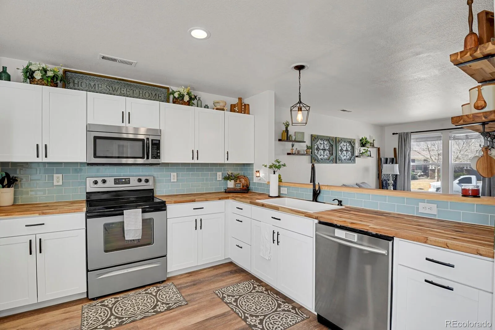 The remodeled main floor features durable Lifeproof LVP water-resistant flooring in the family room and kitchen. The living room is large and inviting. The kitchen is completely remodeled with stainless steel appliances, new pendant light fixture, new shaker style cabinets, tile backsplash, butcher block countertops, and a sizable pantry for extra storage. The laundry room is generously sized and includes the washer, dryer and plenty of storage space as well as a coat closet.