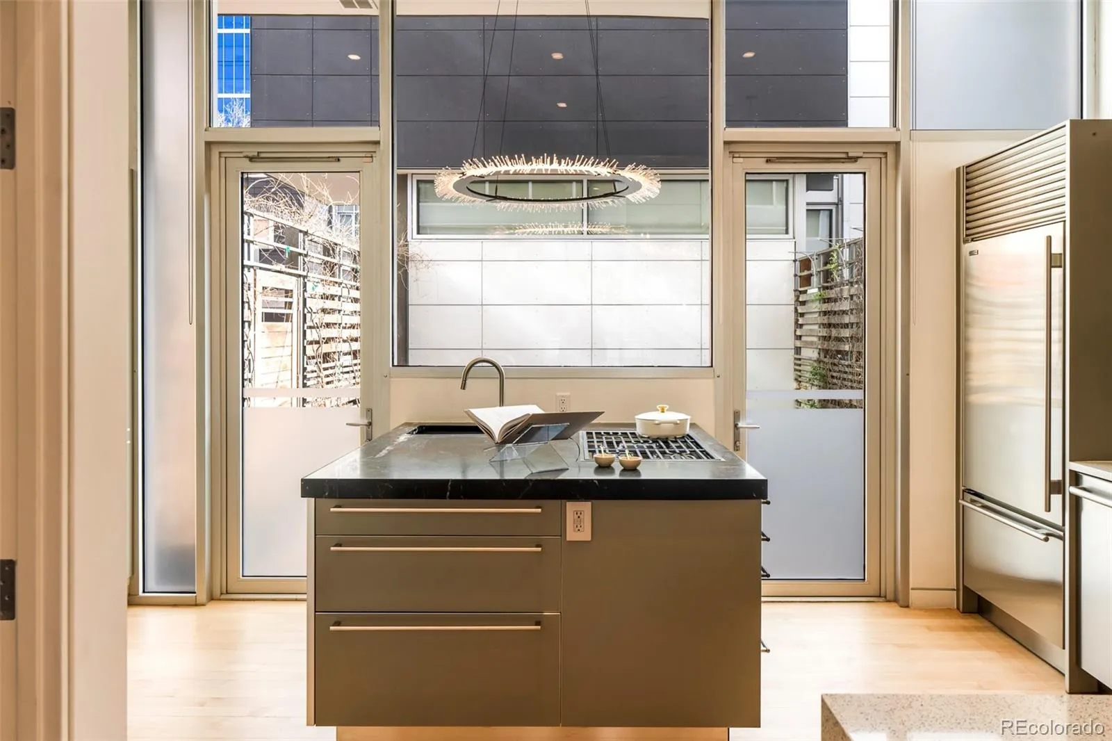 The kitchen is anchored by bespoke Bulthaup cabinetry, a custom walnut waterfall butcher block island, Wolf gas cooktop, Miele speed oven, Thermador refrigerator, dual beverage fridges, and Blanco sinks in anthracite. Two doors open to a private fenced patio with a gas firepit and curated plantings.