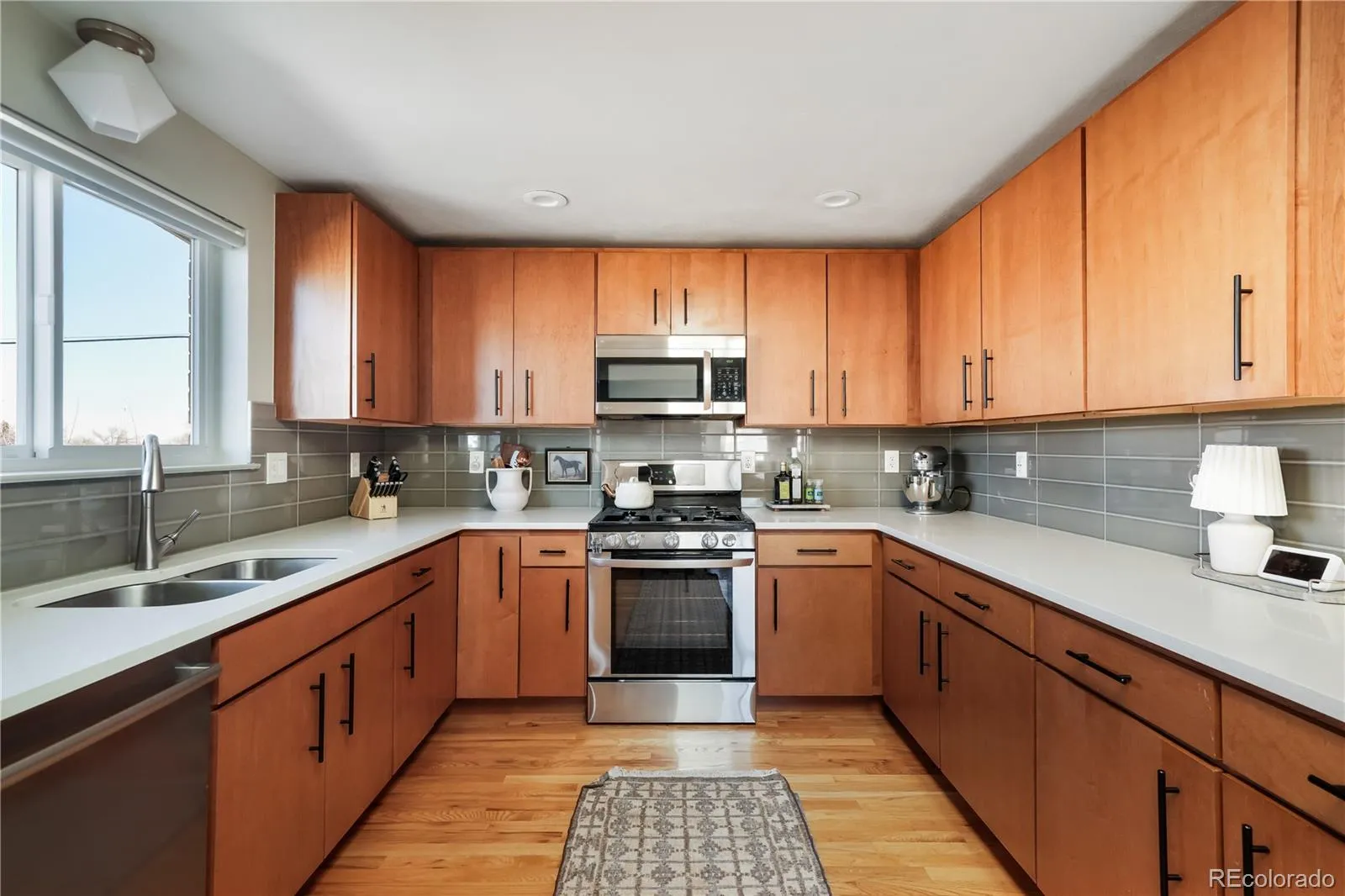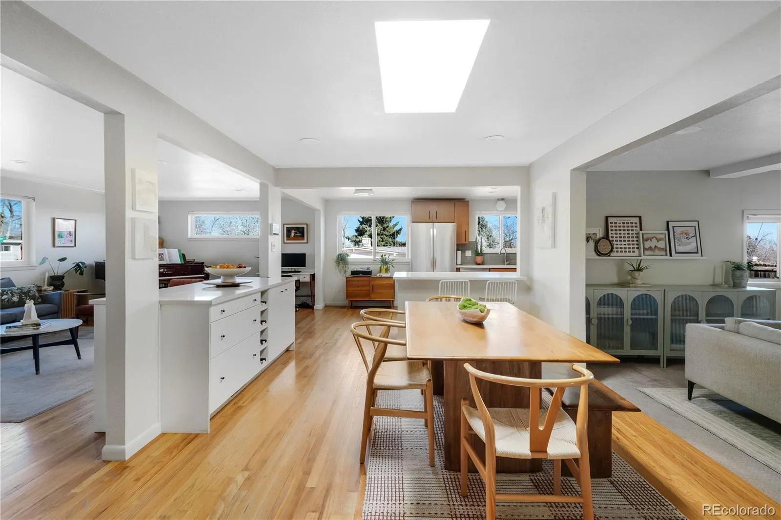 www.2708SPatton.com A welcoming California Contemporary entry offers a functional pass-through breezeway — a rare and practical touch that keeps daily living easily organized. Inside, hardwood floors extend through the open-concept living spaces, creating warmth and continuity while multiple skylights create a bright and airy space. The expansive living room is anchored by a west-facing picture window that fills the home with natural light and flows seamlessly into the dining area. In the kitchen, Quartz surfaces continue, complemented by stainless steel appliances, stacked subway tile, timeless flat-front cabinetry, a clean, curated nod to classic mid-mod design. The adjacent dining room is both striking and functional, featuring a custom double-sided built-in buffet with Quartz countertops. At the back of the home, a sunken family room offers a cozy yet connected retreat, opening to a bright sunroom which invites the outdoors in and is perfect for year-round entertaining. The sizable primary suite is ideally positioned for privacy and features hardwood floors and a refined en-suite bath. A secondary bedroom enjoys abundant natural light from the sunroom, with a remodeled full hall bath nearby. Extensive system updates provide peace of mind, including new plumbing and gas lines, newer windows, electrical grounding and upgrades, newer A/C, an EV charger, radon mitigation system w/vapor barrier, new fencing, and thoughtfully designed xeriscaping. Design-forward and move-in ready — this is Mid-Mod living at its most effortless.