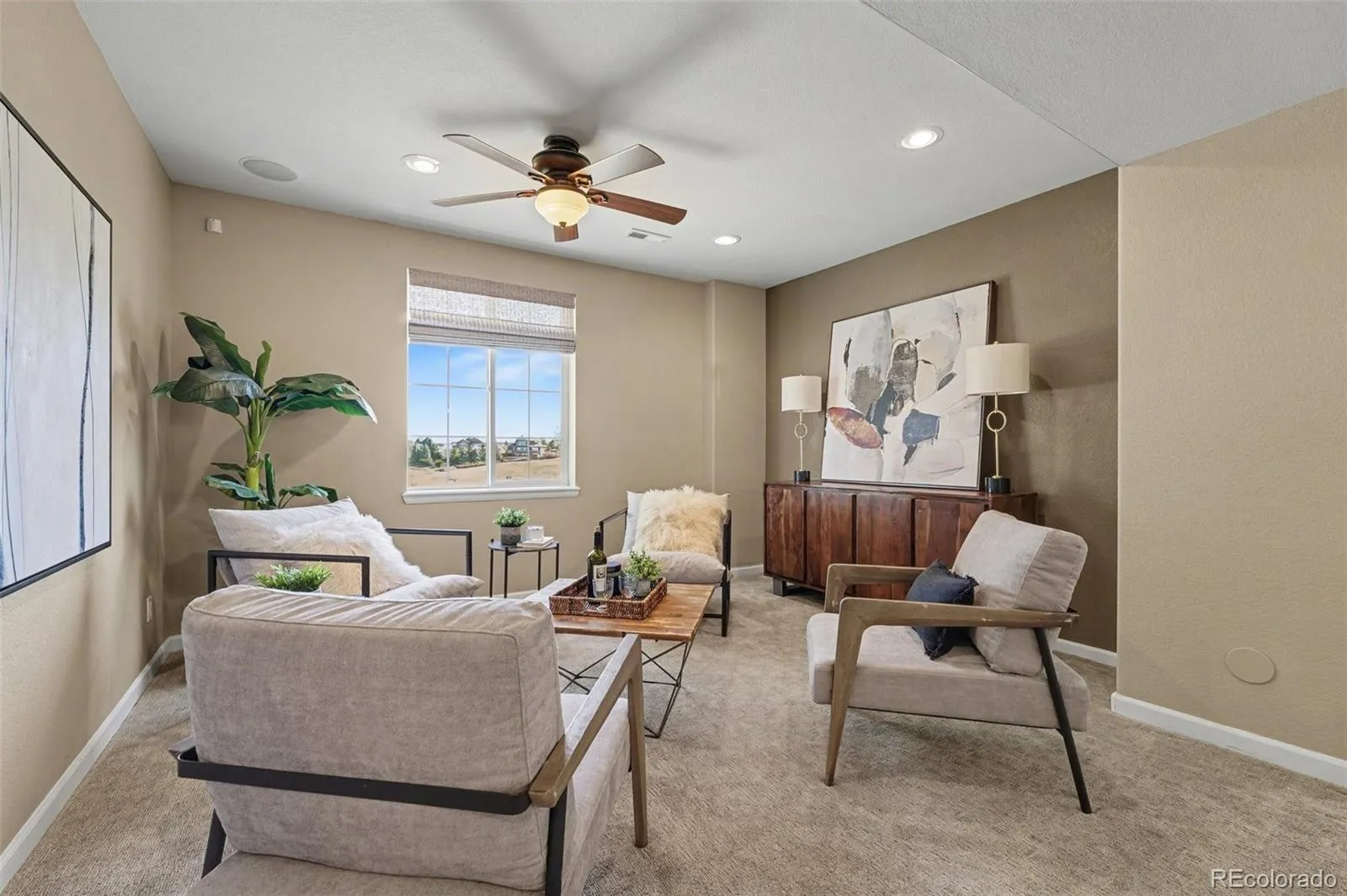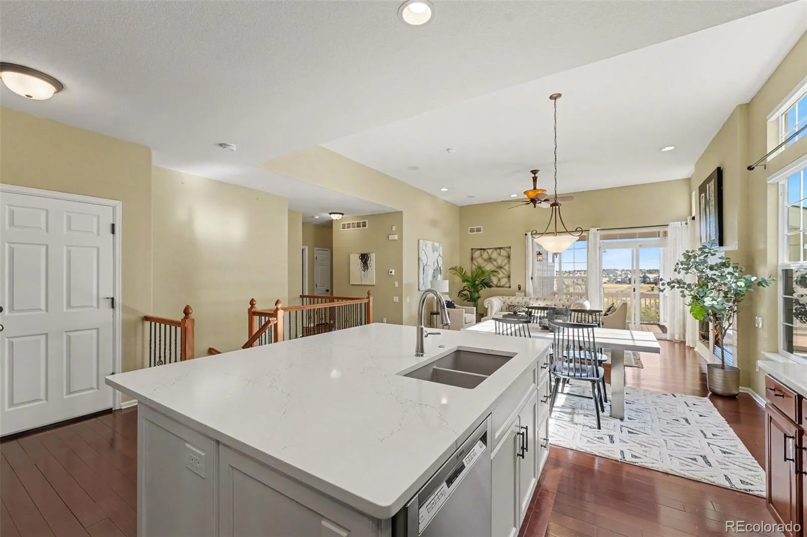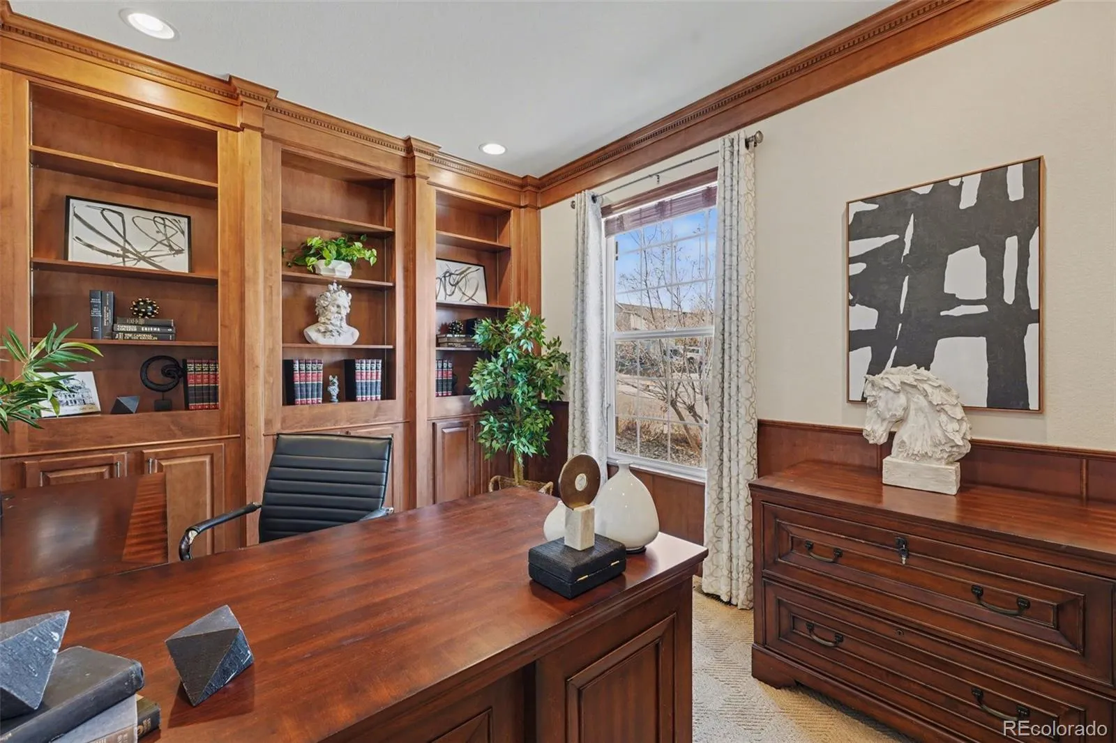 Welcome to this beautifully updated 5-bedroom, 4-bath former model home backing to the golf course in the sought-after Canterberry Crossing Neighborhood! From the moment you step inside, rich hardwood floors and thoughtful architectural details set the tone, including crown molding and a dedicated home office with custom built-ins just off the entry. The open-concept main living area is filled with natural light and features soaring ceilings, a gas fireplace, and seamless flow into the kitchen—complete with quartz countertops, an oversized, custom-built island, abundant cabinetry, and a gas range with a double oven. The main level also includes a spacious primary suite with plantation shutters and a luxurious 5-piece bath, along with two additional bedrooms, a full bath, a 3/4 guest bath, and convenient main-floor laundry. The finished walk-out basement is perfect for multi-gen living! Designed for entertaining, it offers a large recreation space with a wet bar, multiple seating areas, and direct access to the patio. Two additional bedrooms and a 3/4 bath provide ideal space for guests. Additional highlights include an oversized garage with extensive built-in storage and finished floors. Enjoy golf course living with access to neighborhood amenities including a pool, playground, tennis courts, parks, trails, and more—all in a prime Parker location.