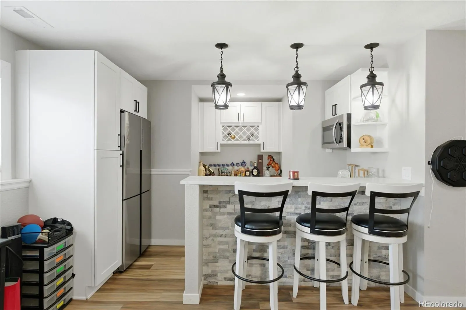 At the heart of the home is a beautifully reimagined gourmet kitchen featuring elegant quartz countertops, an expansive island, and a walk-in pantry—perfectly designed for both everyday living and elevated entertaining. The open-concept living area is filled with natural light and anchored by a striking stone-accented fireplace, creating a warm yet sophisticated atmosphere.