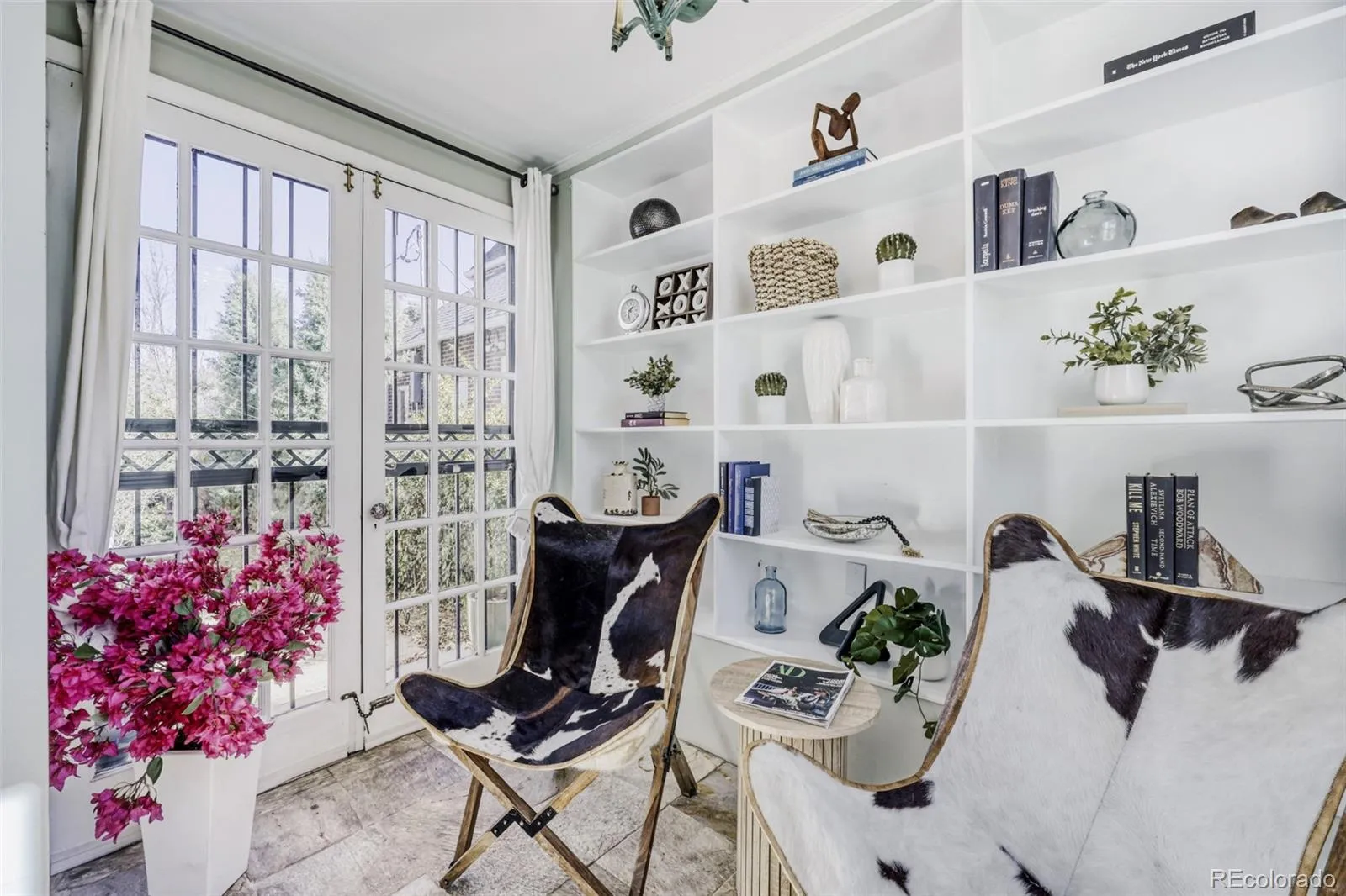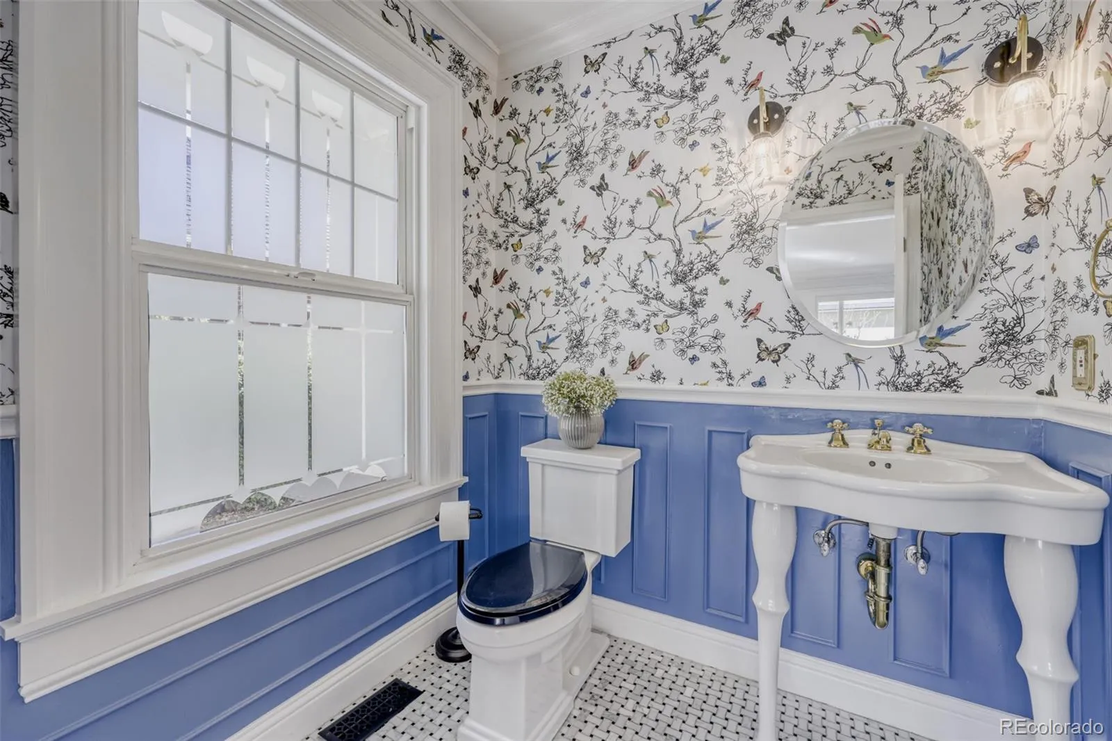 Nestled on a quiet, tree-lined block in South Park Hill, this beautifully restored Dutch Colonial blends timeless character with thoughtful modern upgrades. This 5-bedroom, 5-bath home showcases original details like antique fixtures, botanical wallpaper, and a hand-painted Chinoiserie mural, seamlessly paired with contemporary comforts including whole-house water filtration and curated designer finishes. Major systems have already been taken care of, with a new roof featuring owned solar panels, along with a furnace and hot water heater—all completed in 2023. The bright, open kitchen is designed for both everyday living and entertaining, featuring white quartz countertops, an oversized island, and easy flow into the sun-filled family room with remote-controlled shades. Downstairs, the finished basement offers a true retreat with a media room and a luxurious guest suite highlighted by a striking emerald green bathroom. An additional bedroom has been transformed into a home gym, complete with a mirrored barre and infrared sauna. Upstairs, the sunny southwest-facing primary suite includes custom built-ins, double closets, and a spa-like five-piece bath with an oversized soaking tub. Two additional generously sized bedrooms each feature their own baths, along with a convenient laundry area. Outside, the professionally landscaped yard is designed for beauty and function, with irrigation, bluestone pathways, raised garden beds, blooming peonies, and a south-facing patio strung with bistro lights—perfect for relaxing or hosting. Located just moments from local schools, neighborhood cafes, shops, and City Park, this home also features a newer oversized two-car garage with ample space for storage and gear.