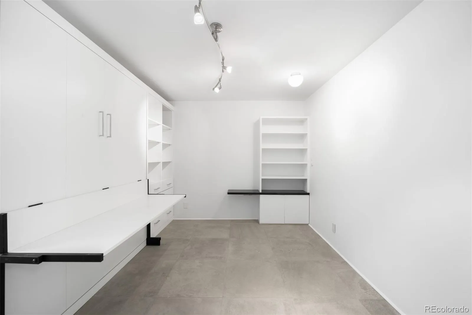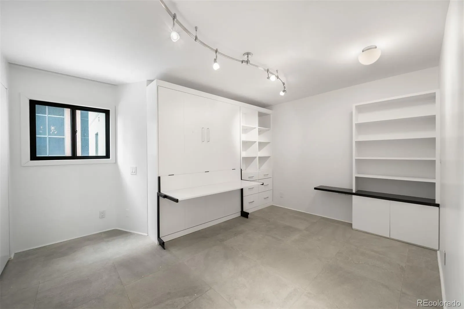The oversized primary suite is a true retreat, offering floor-to-ceiling windows, a custom feature wall, a spacious walk-in closet, and a luxurious five-piece bath complete with a soaking jacuzzi tub. A built-in desk nook creates a perfect work-from-home space. The secondary bedroom, equipped with a Murphy bed, provides flexibility for guests, a home office, or both.