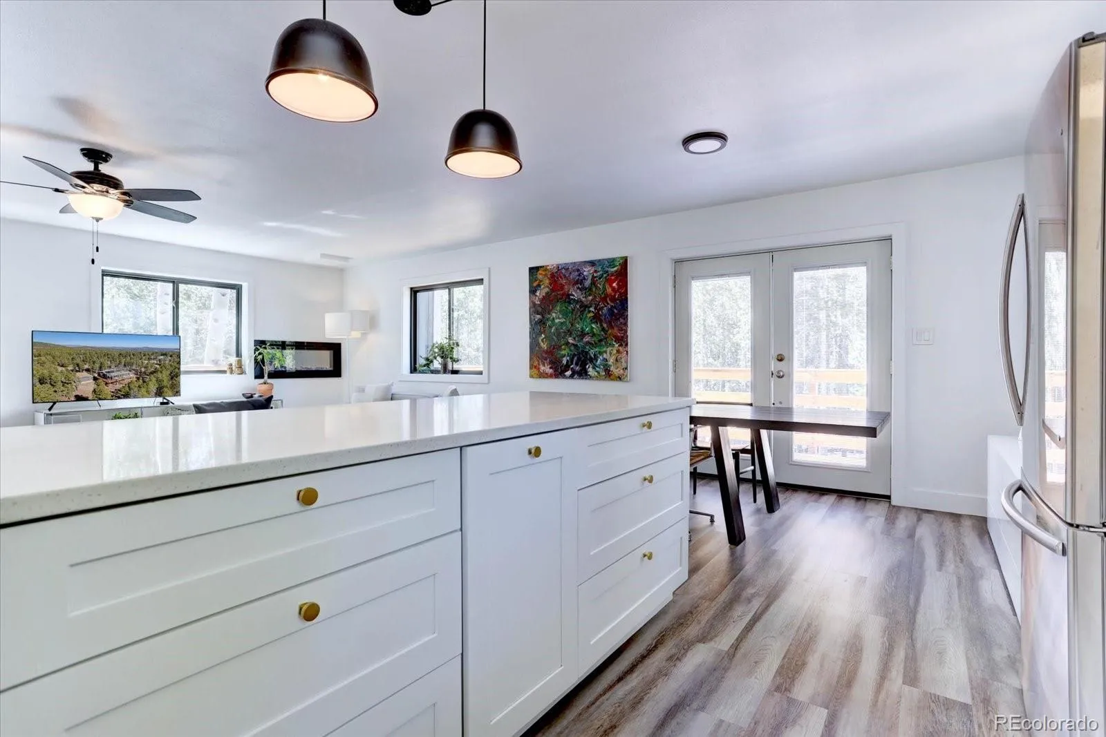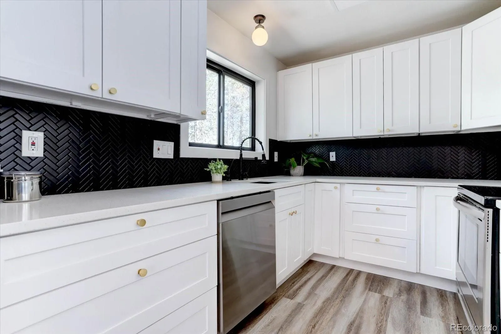 NEW PRICE! Welcome to your perfect move-in ready foothills home! This property has been completely updated with newer roof, windows, wrap-around deck, detached two-car garage with a Tesla power wall, solar panels to reduce utility costs. Additional features include a large shed, partially fenced yard, and a mitigated property. Inside, the lower level boasts a large mudroom/flex space with a laundry room, storage cabinets, and a utility closet. The downstairs den area, with vinyl plank flooring and walk-out access to the front porch deck and yard, is perfect for relaxation. Two full-size bedrooms are located downstairs; one is a primary suite with an en-suite bathroom. Both rooms are carpeted. The full bathroom has a tub/shower with white tile and an updated vanity, with two closets for linen and storage. The upper level features a large, bright, open living room with a new free-standing wood-burning fireplace and contemporary wall-unit heater. Enjoy lots of windows and door access to the upper wrap-around deck, perfect for entertaining or relaxing while watching wildlife. The living area opens to the dining room with access to the west deck. The updated kitchen has quartz counters, white cabinets with a stunning black backsplash, stainless steel appliances, new lighting, and an eat-in counter. Another full bathroom with white tile walk-in shower with a glass door. Bonus room being used as an office, could be a guest room. The third bedroom on the south side is currently being used as a primary bedroom and has sliding door access to the inviting, relaxing deck area. This property is turnkey and ready for you! Enjoy close access to hiking and biking trails at Flying J Ranch and Maxwell Falls, proximity to Highway 285, and an easy commute to town. Shadow and Black Mountain are along bus/snow routes, and all well-maintained by Jefferson County. Don’t miss the opportunity to see this amazing foothills property!