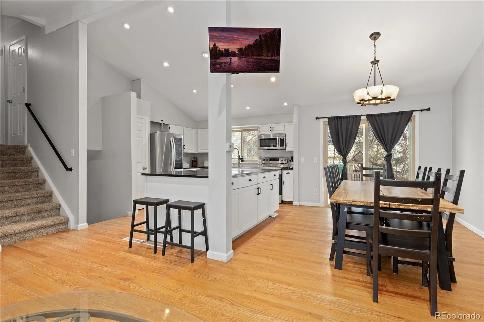 Vaulted ceilings and rich hardwood floors highlight the bright and inviting main level, where the living room, dining area, and kitchen flow seamlessly together—perfect for entertaining or relaxed daily living. The stunning chef’s kitchen features white Shaker cabinetry, granite countertops, a stylish subway tile backsplash, new stainless steel appliances, and an oversized center island.