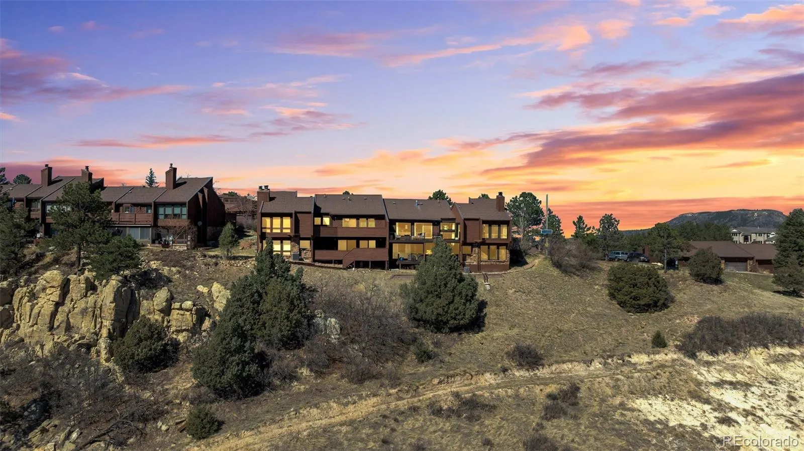 Nestled within the coveted Echo Hills Townhomes in Perry Park, this 3-bedroom, 3-bathroom home offers approximately 2,496 finished square feet of comfortable, Colorado living. Soaring vaulted ceilings with wood beams, acacia hardwood flooring, a floor-to-ceiling stone surround wood-burning fireplace, and large picture windows with stunning mountain views welcome you the moment you walk in. The kitchen and dining room connect seamlessly, featuring dolomite countertops and backsplash, stainless steel appliances, and access to a private front patio. Acacia hardwood flows throughout the main level — kitchen, living room, dining room, and primary bedroom — creating a warm, unified feel. The primary suite boasts a vaulted ceiling, ceiling fan, spacious walk-in closet, and glass sliding door access to the composite deck where you can step outside to soak in sweeping valley and mountain views. The spa-like en-suite includes soapstone flooring and a walk-in shower with a multi-head shower panel. The lower level offers a spacious family room with floor-to-ceiling windows, two additional bedrooms with new carpet, a full bathroom with new tile flooring, and laundry. Each living space gives you access to the lower-level deck where incredible outdoor living at every turn waits. Additional highlights include a new 50-gallon water heater, newer A/C unit, newer windows throughout, and an attached 2-car garage. Located in one of the most desirable Douglas County Golf communities. Perry Park Golf Course is highly rated & a recent winner of the coveted CAGGY awards from Colorado Avid Golfer. Not a golfer? Social memberships are also available. Perry Park boasts acres of open space, hiking trails, horse stables & stunning red rock formations & it is only 5 minutes from Douglas County’s new Sandstone Ranch Open Space & Sandstone Ranch Trails. Secluded but not isolated, this remarkable home is only 20 mins to Castle Rock & 40 mins to DTC or CO Springs.