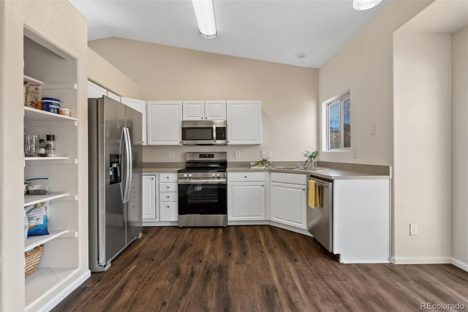 new Stainless Appliances, stove, dishwasher, refrigerator, microwave and disposal. The newly installed White patio sliding doors