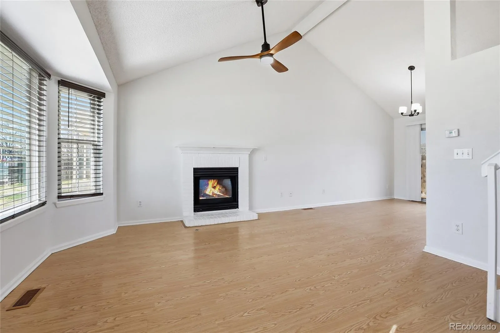 Step inside to discover an inviting living room with vaulted ceilings and a striking brick fireplace, creating a warm feel for gatherings. The kitchen is well-equipped with brand new stainless steel appliances, light countertops, and wood finish cabinetry, making it a wonderful space for culinary adventures. Each bedroom features light wood-style flooring, ample natural light, and walk-in closets, ensuring comfort and privacy.
