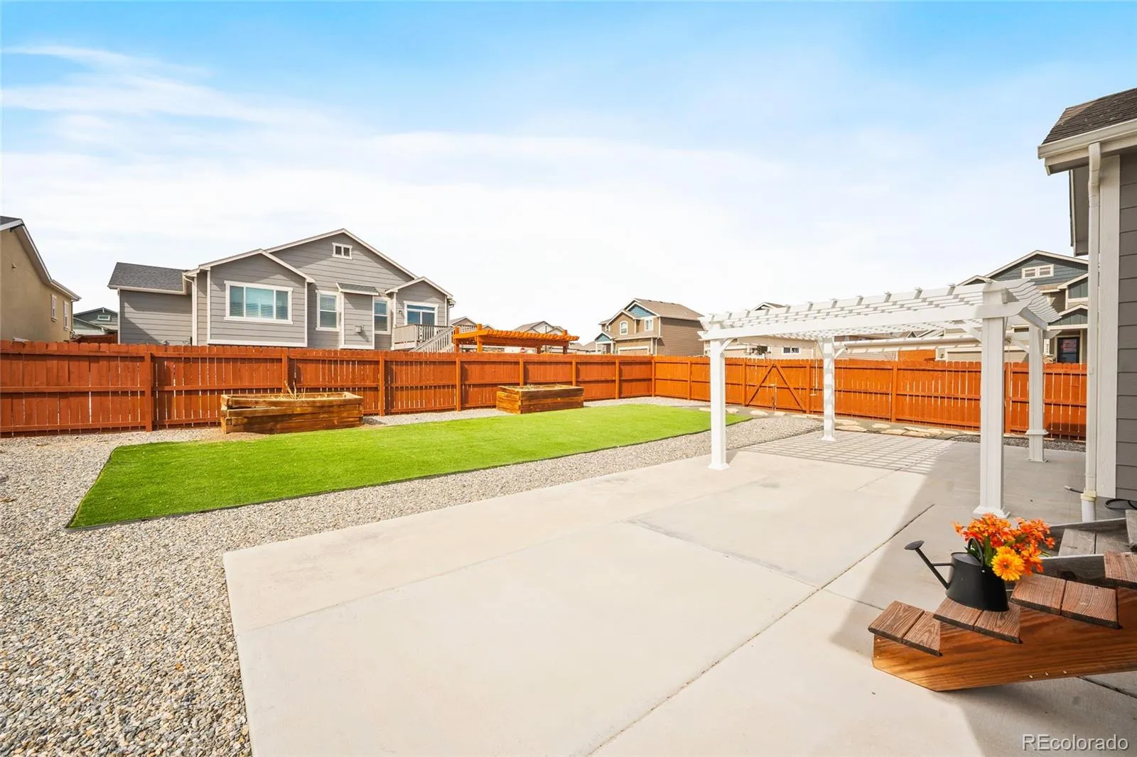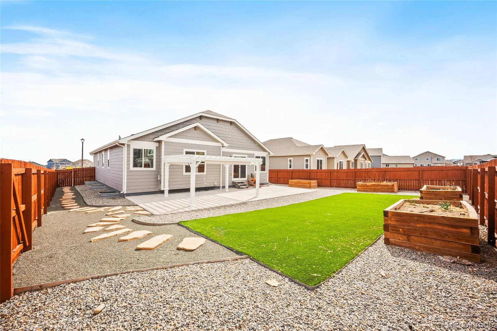 This beautiful 5 bed, 3 bath, 3 car home sits on a large corner lot with low maintenance landscaping. Located in the highly sought after Meridian Ranch. This home has been well cared for and boasts soaring vaulted ceiling, wood laminate flooring, open concept main level. Kitchen features granite, SS, pantry and island. The primary suite with vaulted ceilings, attached 5 piece bath and walk in closet. There are 2 additional bedrooms, full bath and laundry on the main level. The finished basement features huge rec/family room wet bar/kitchenette that boasts endless possibilities. There are 2 additional bedrooms and full bath. The backyard is fully fenced with large patio with pergola and is wired for a hot tub. Raised garden beds and easy to maintain turf along with xeriscape. Meridian Ranch boasts many neighborhood amenities such as parks, trails, community/rec center, pool and dog park.