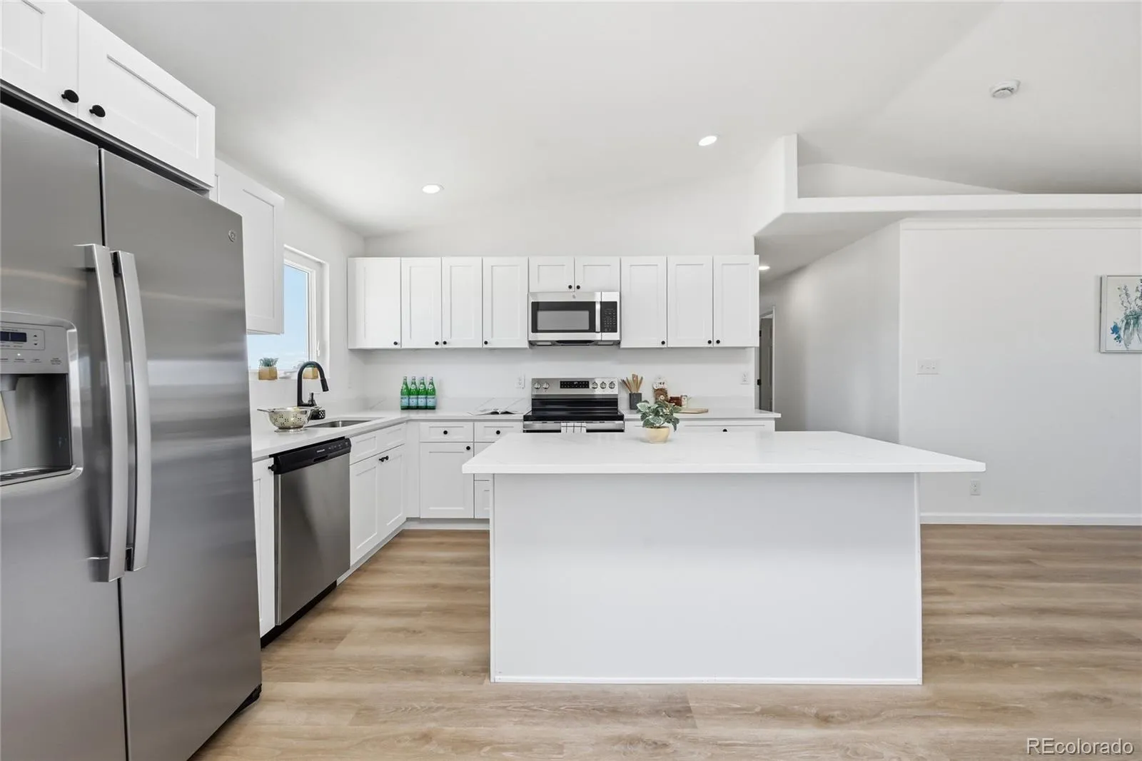 Welcome home to this beautifully renovated 4-bedroom, 3-bathroom ranch offering 2,496 sq ft on a generous .28-acre lot in Pueblo West. This head-to-toe transformation includes a new roof, fresh interior and exterior paint, LVP flooring, carpet, and fully updated kitchen and bathrooms. The open-concept main level impresses with vaulted ceilings and a skylight that floods the space with natural light. The kitchen shines with all-new white shaker cabinetry, quartz countertops, a large center island, and a full suite of stainless steel appliances. Three bedrooms on the main level include a primary suite with walk-in closet, plus the everyday convenience of main-level laundry. All three bathrooms have been fully refreshed with new vanities, quartz counters, updated tile, and new fixtures. The finished basement expands your living space with a large rec room, fourth bedroom, full bath, walk-in closet, and a flexible bonus room ideal for a home office or gym. Complete with an oversized 2-car garage and a spacious backyard with patio — this is move-in ready living at its finest. Schedule your showing today!
