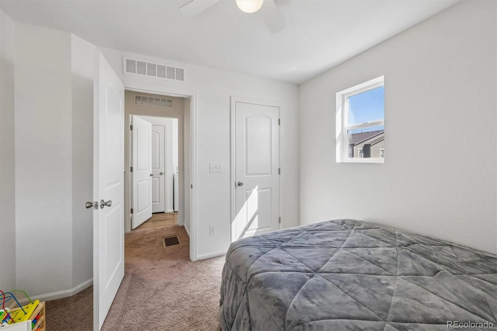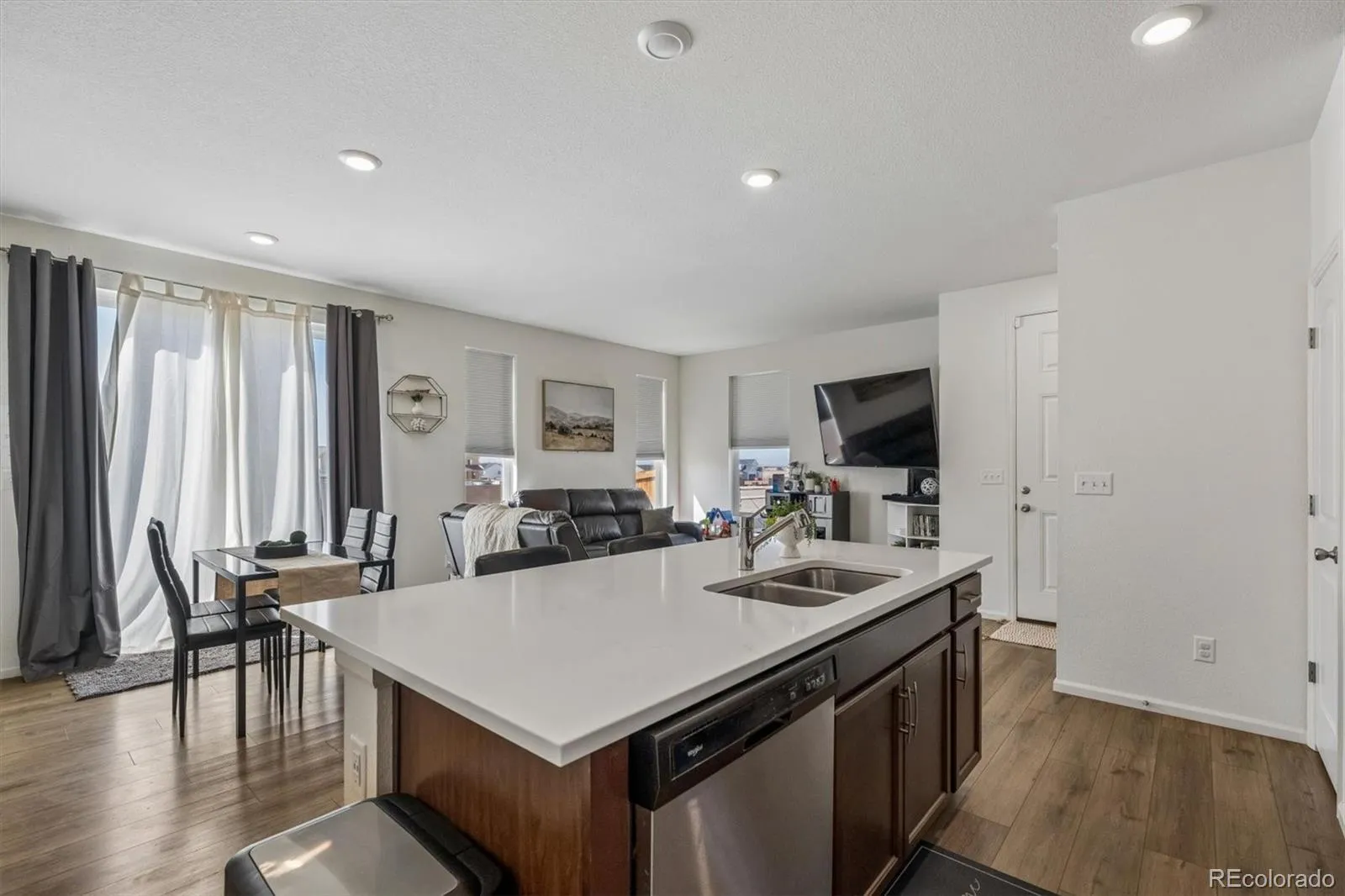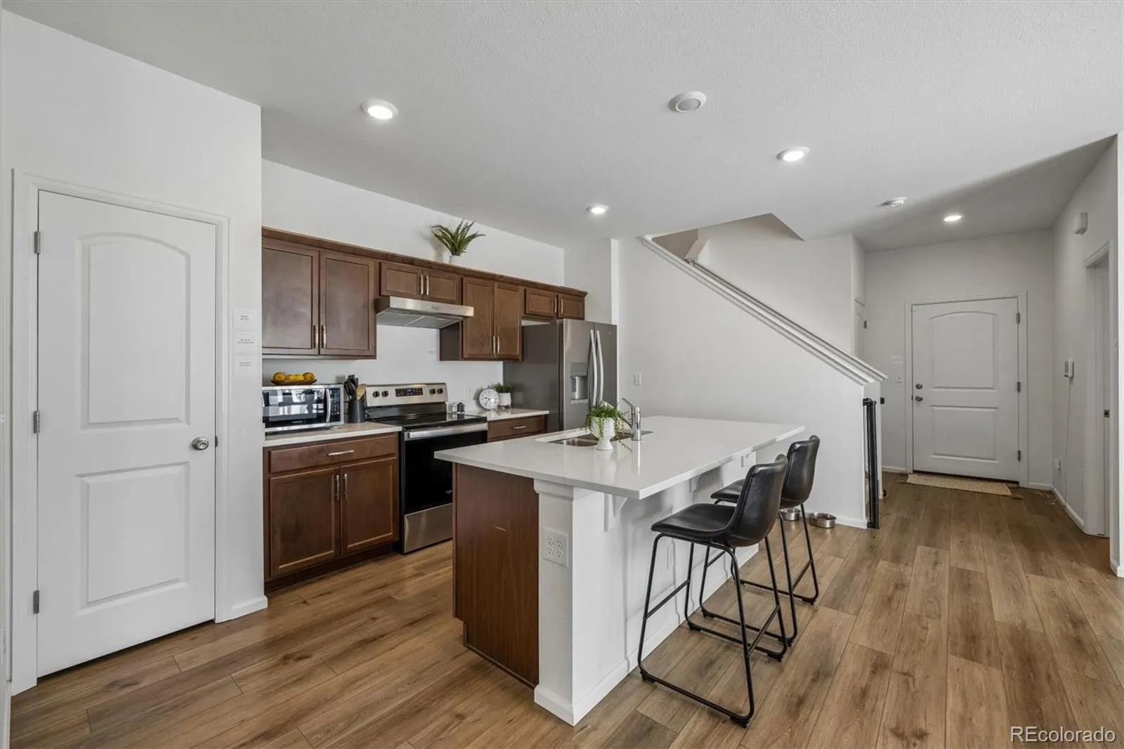 Highly desired floor plan with a BASEMENT!!! This beautifully updated paired home in the popular Sky Ranch community is ready for his new owner! Step inside to find luxury vinyl plank flooring, modern lighting, and a powder room—all designed for comfort and elegance. The open-concept main level features a high-end kitchen with quartz countertops, timeless cabinetry, a spacious pantry, a large island, and stainless steel appliances. The kitchen flows seamlessly into the formal dining area and great room, making it perfect for entertaining. Upstairs, you’ll find a large located laundry room, two generously sized bedrooms, and a full bathroom. The primary suite is a true retreat, complete with a large walk-in closet and an en-suite bathroom. The unfinished basement offers endless possibilities—it comes with rough-in plumbing and plenty of space to create a second family room, home gym, or even a fourth bedroom! Outside, enjoy a low-maintenance yard with turf grass and stunning mountain views. With a Prime Location, you are conveniently close to Buckley Air Force Base, DIA, top-rated schools, parks, trails, shopping, and dining—everything you need is just minutes away. This turnkey home is ready for you!