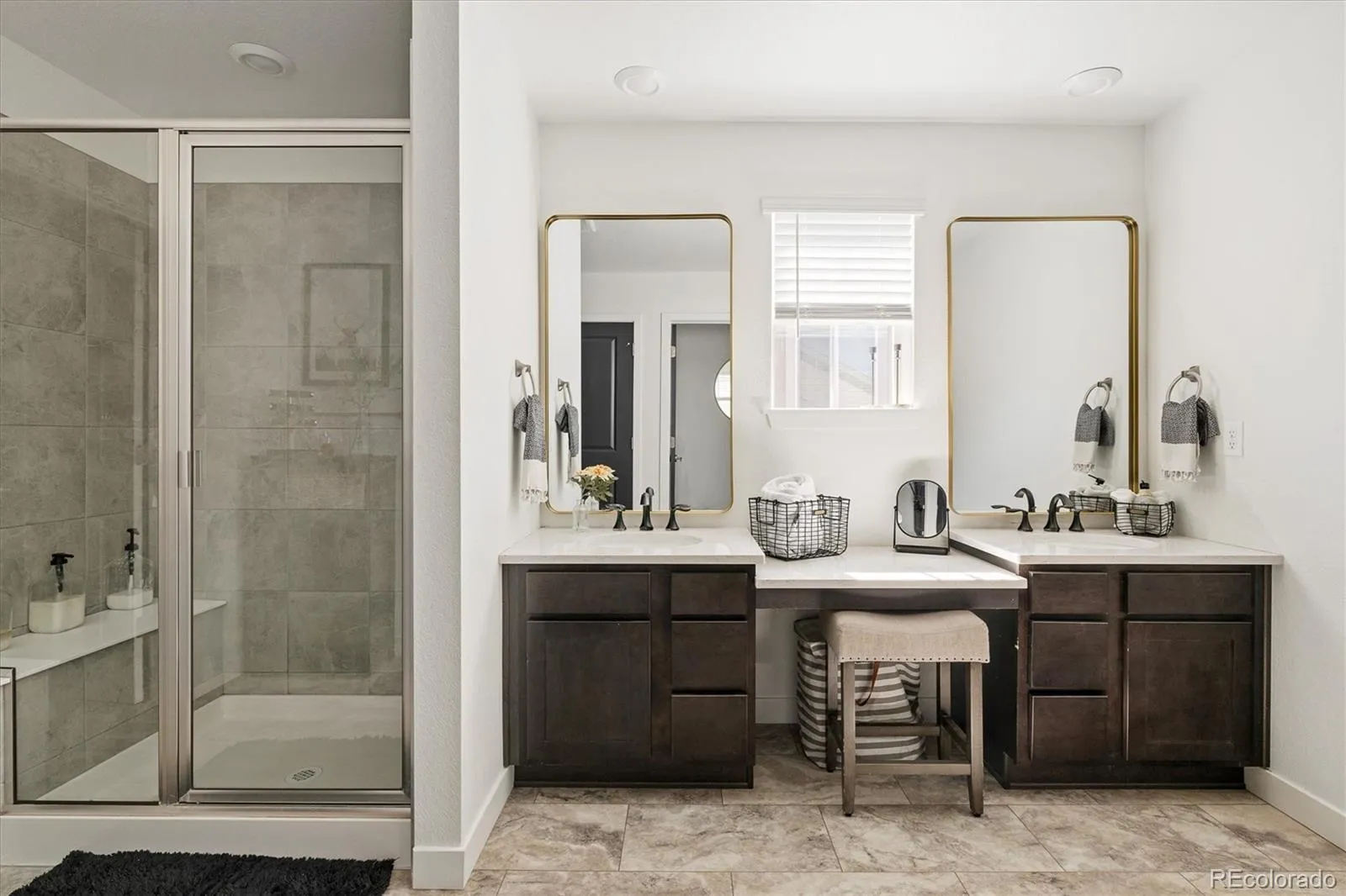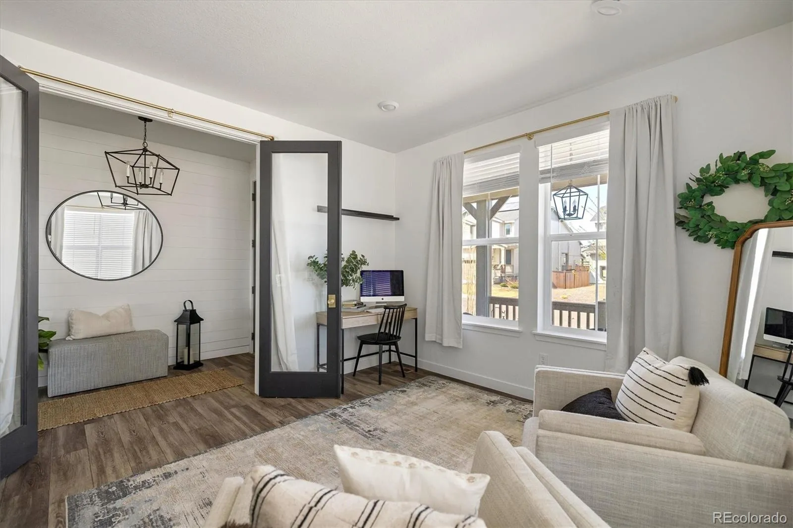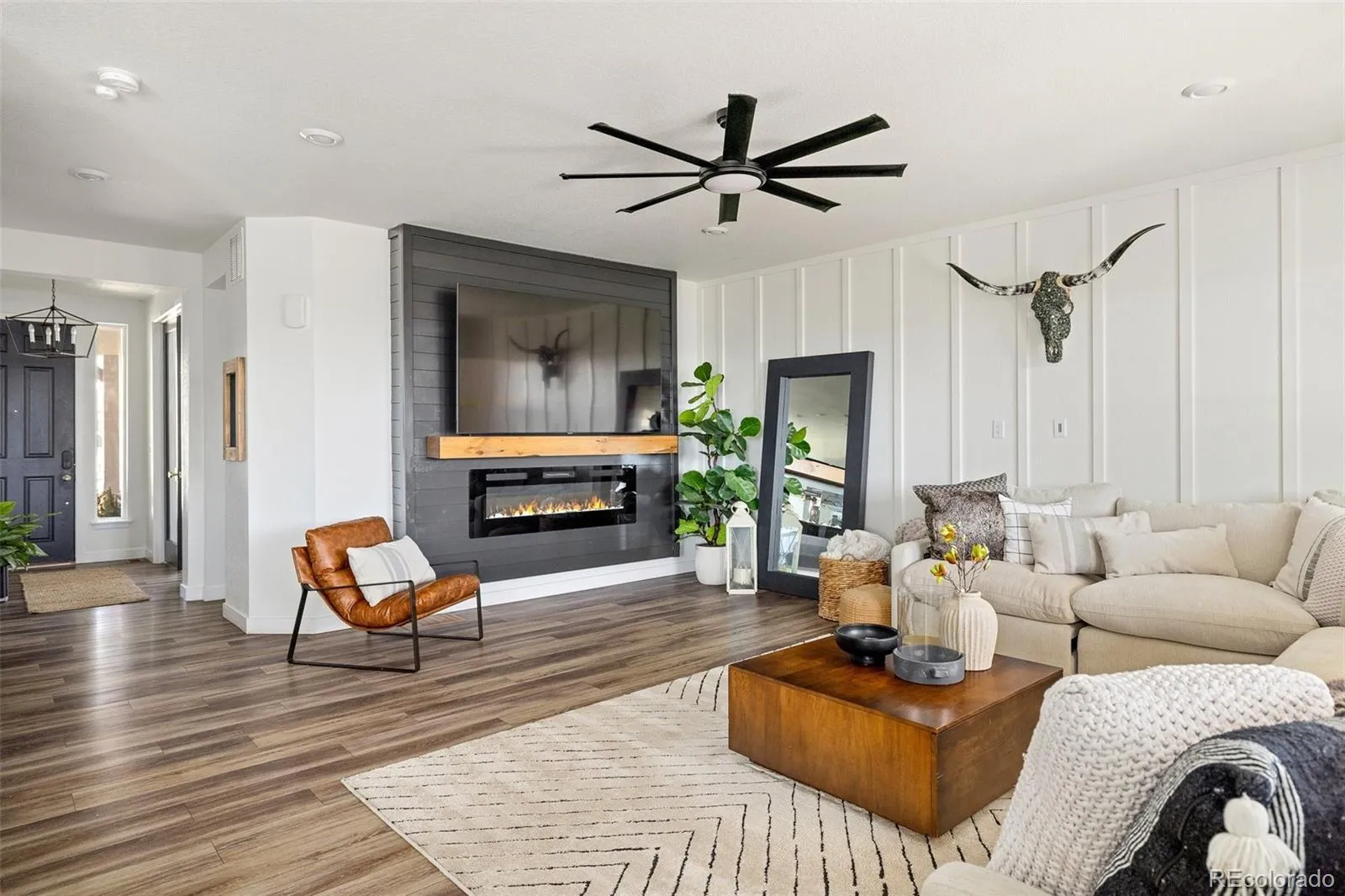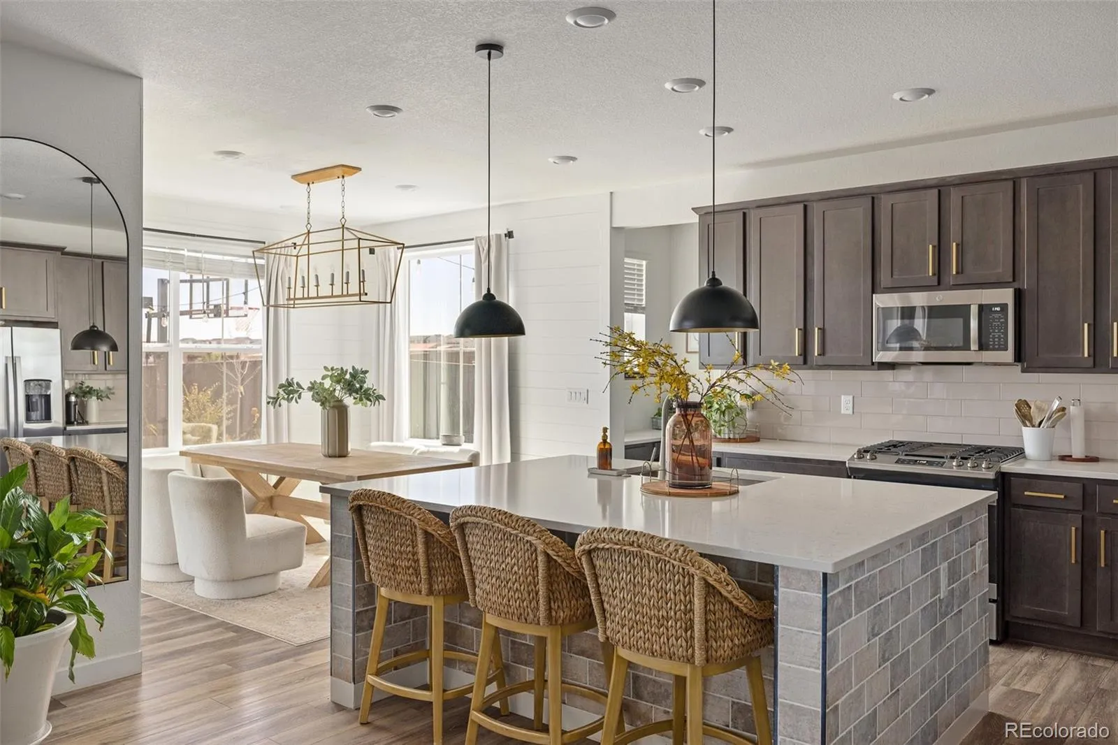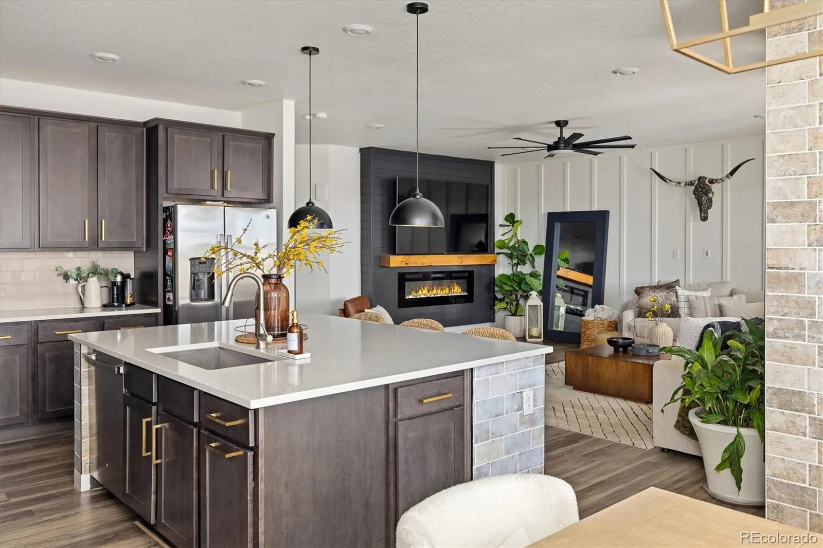 The main level offers a versatile office/flex space (potential non-conforming bedroom) behind custom glass doors, plus a striking powder bath featuring octagonal tile walls and custom cabinetry. The open-concept great room is filled with natural light and showcases a modern fireplace with mantle and shiplap detail. The chef’s kitchen impresses with quartz countertops, a large island, gas range, stainless appliances, upgraded cabinetry with gold hardware, designer lighting, large pantry, built-in desk nook, and convenient mudroom space. Dining area features a gorgeous tiled accent wall.