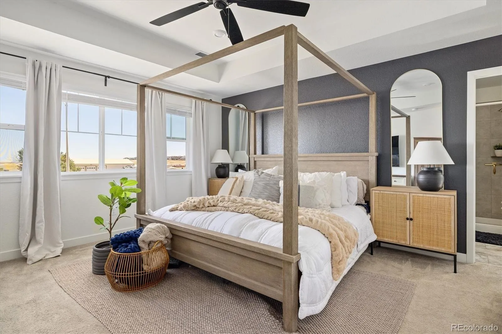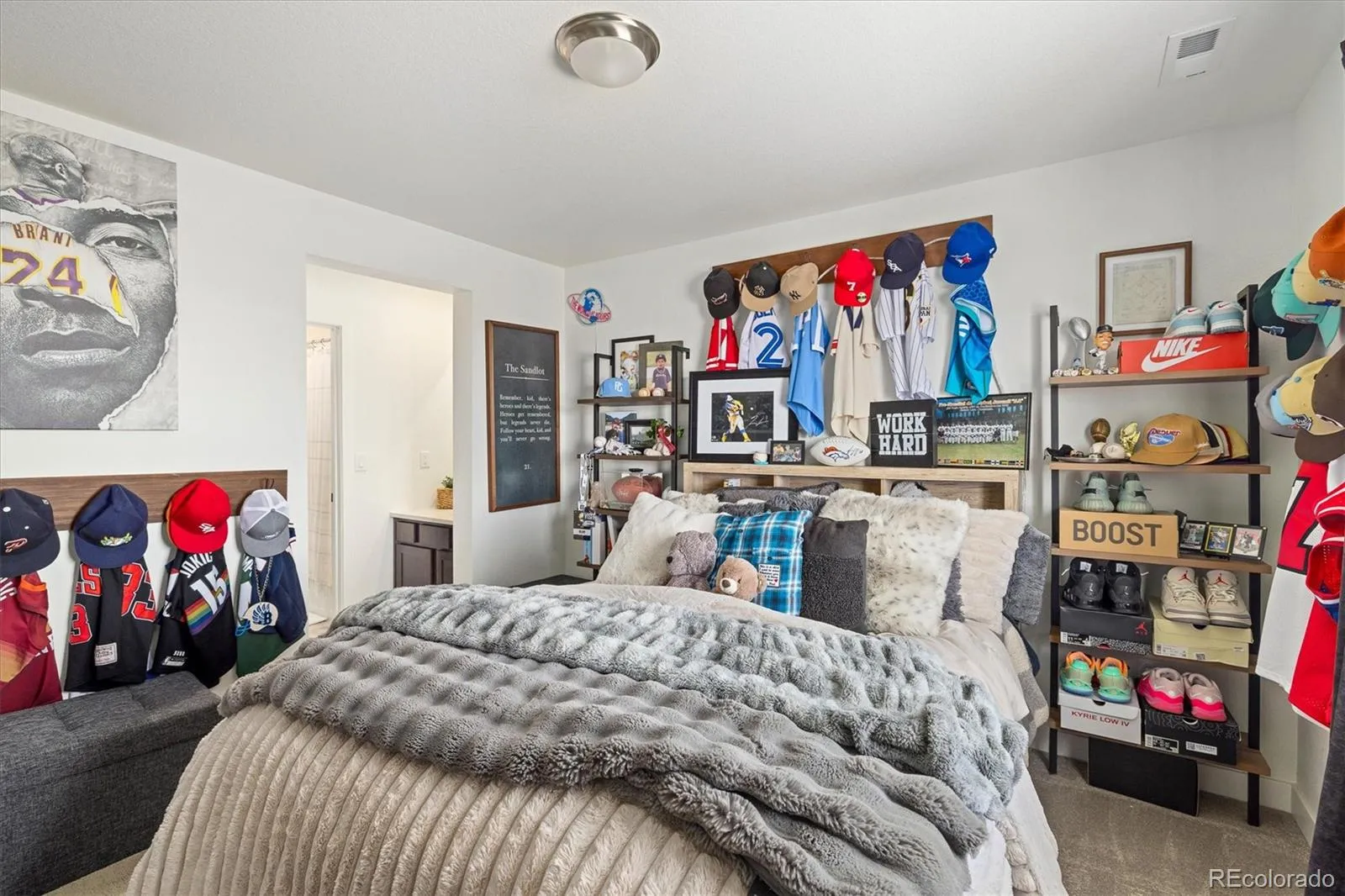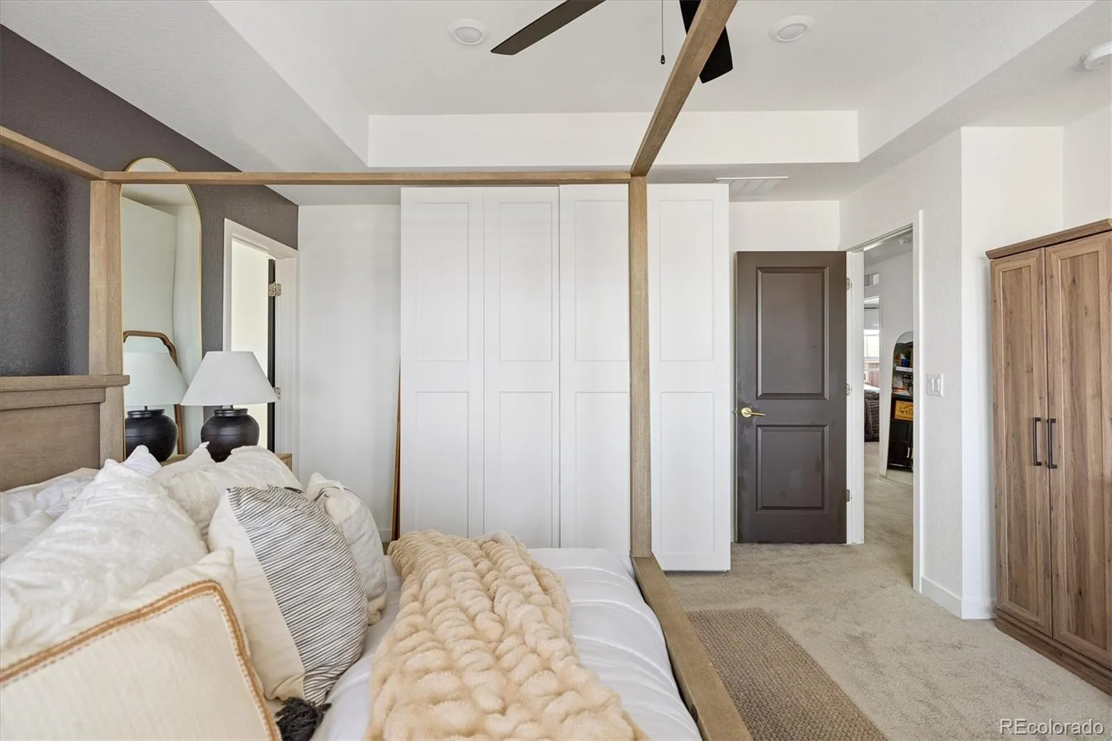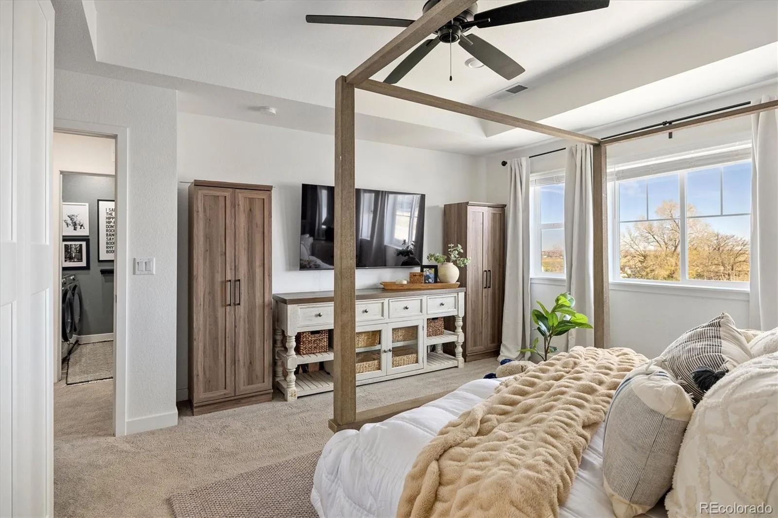 Upstairs includes a spacious loft (potential bedroom), laundry room, two secondary bedrooms connected by a Jack-and-Jill bath, and an additional full bath. The luxurious primary suite offers an accent wall, oversized walk-in closet, built-in armoire, and spa-inspired bath with dual vanities, framed mirrors, extra counter space, and a large shower with bench.