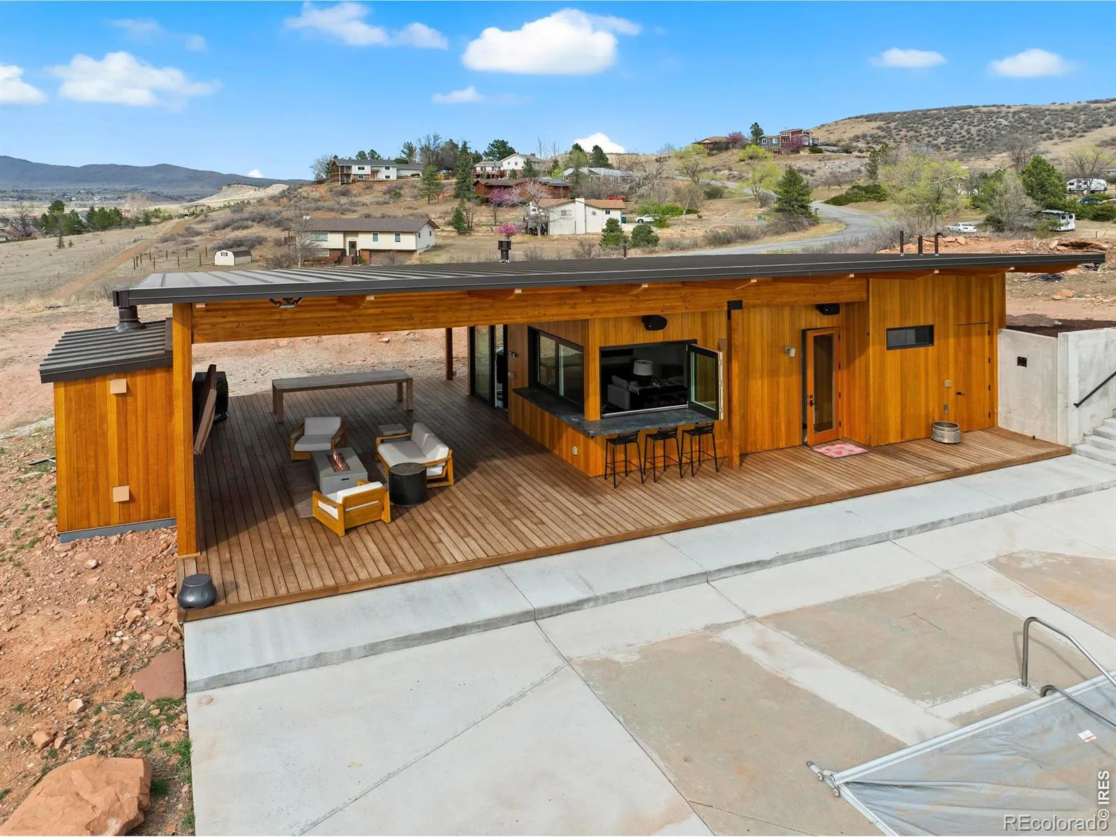 Tucked into the foothills of west Loveland, this one-of-a-kind 3-acre property offers something rare: space to breathe, room to gather, and a setting designed for connection, comfort, and effortless living.The main home features over 3,400 square feet of finished living space with 5 bedrooms and 3.5 bathrooms. Thoughtfully updated, it includes fresh interior paint, newly cleaned carpet, a newer roof, and refreshed exterior finishes with a subtle mid-century modern feel. A walk-out basement completed in 2023 adds flexible living and entertaining space, while the front porch invites quiet mornings and sweeping sunset views over the foothills. Professionally drawn landscaping plans come with home purchase. The standout feature is the custom-designed pool house/ADU, built in 2023 by Forge & Bow Dwellings. This fully furnished 739 square foot retreat includes 2 bedrooms, 1.5 bathrooms, and a high-end kitchen with built-in appliances, custom cabinetry, and expansive windows that open seamlessly to the outdoor living space + views of foothills & Horsetooth Rock. With its own HVAC and septic system, the pool house offers both comfort and versatility for hosting, extended stays, or private guest accommodations. Step outside to a resort-style setting where indoor and outdoor living blend effortlessly. The covered patio is equipped with heaters for year-round enjoyment, while the upgraded pool and deck-featuring new concrete and a saltwater filtration system-create the ultimate backdrop for summer gatherings, poolside afternoons, and evenings under the Colorado sky. Located in the desirable Miravalle area just outside city limits with no HOA, this property offers privacy and space while remaining conveniently close to Loveland, Berthoud, Longmont, and Fort Collins. Only 45 minutes from Boulder. Whether you’re hosting, relaxing, or simply taking in the views, this home delivers a lifestyle that’s truly hard to find-and even harder to leave.